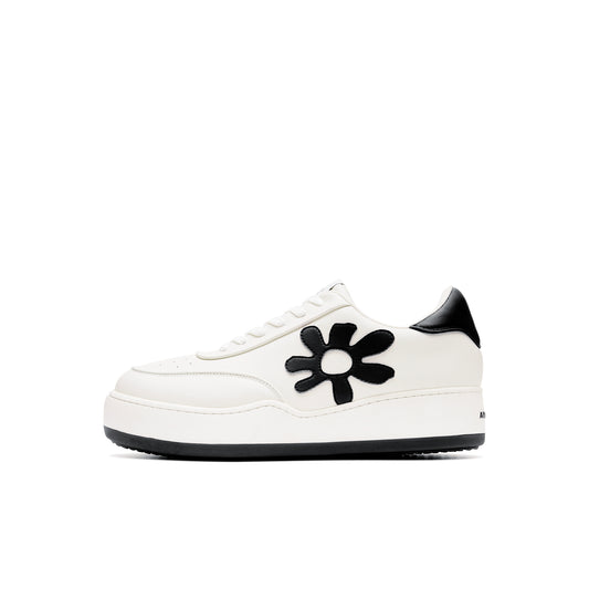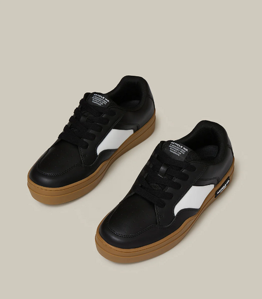 WHITE BLACK LOW TOP VEGAN LEATHER TRAINERS