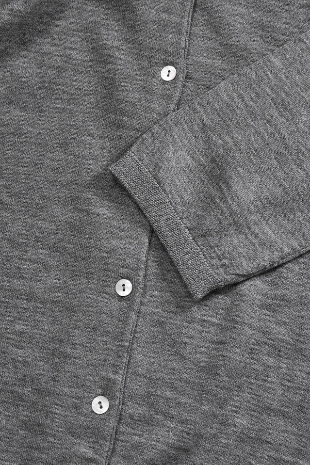 Amethyst Cardigan is a classic polo-shirt style cardigan in light merino wool. It has slightly dropped shoulders and fastens by six mother of pearl buttons down the front.