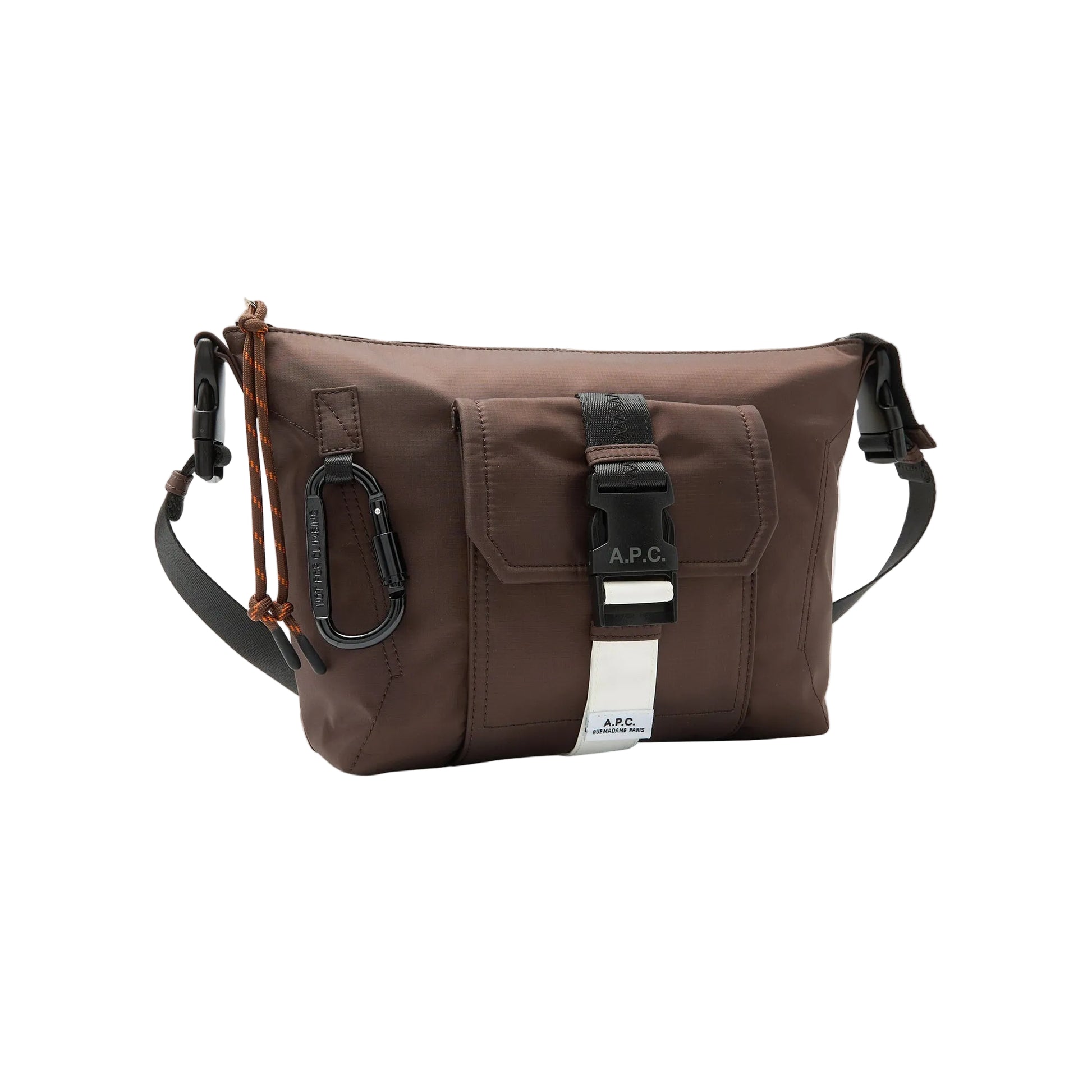 - A front pocket closed with an A.P.C. logo buckle on a white "A.P.C. Rue Madame Paris" strap.