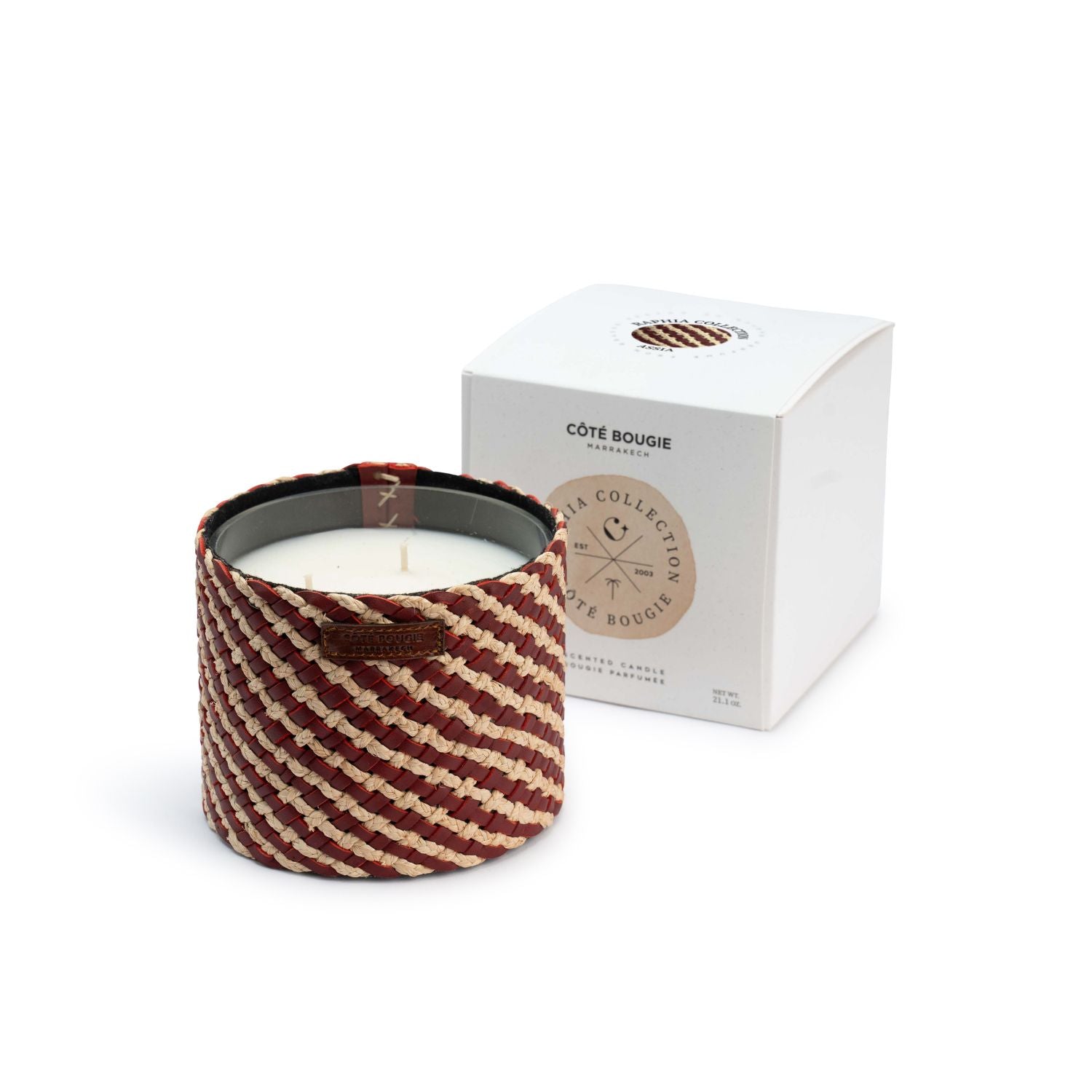 Artisanal elegance and Moroccan know-how come together in this hand-woven leather and raffia candle, offering an olfactory journey through Morocco. A unique object that will enhance your home with authenticity.