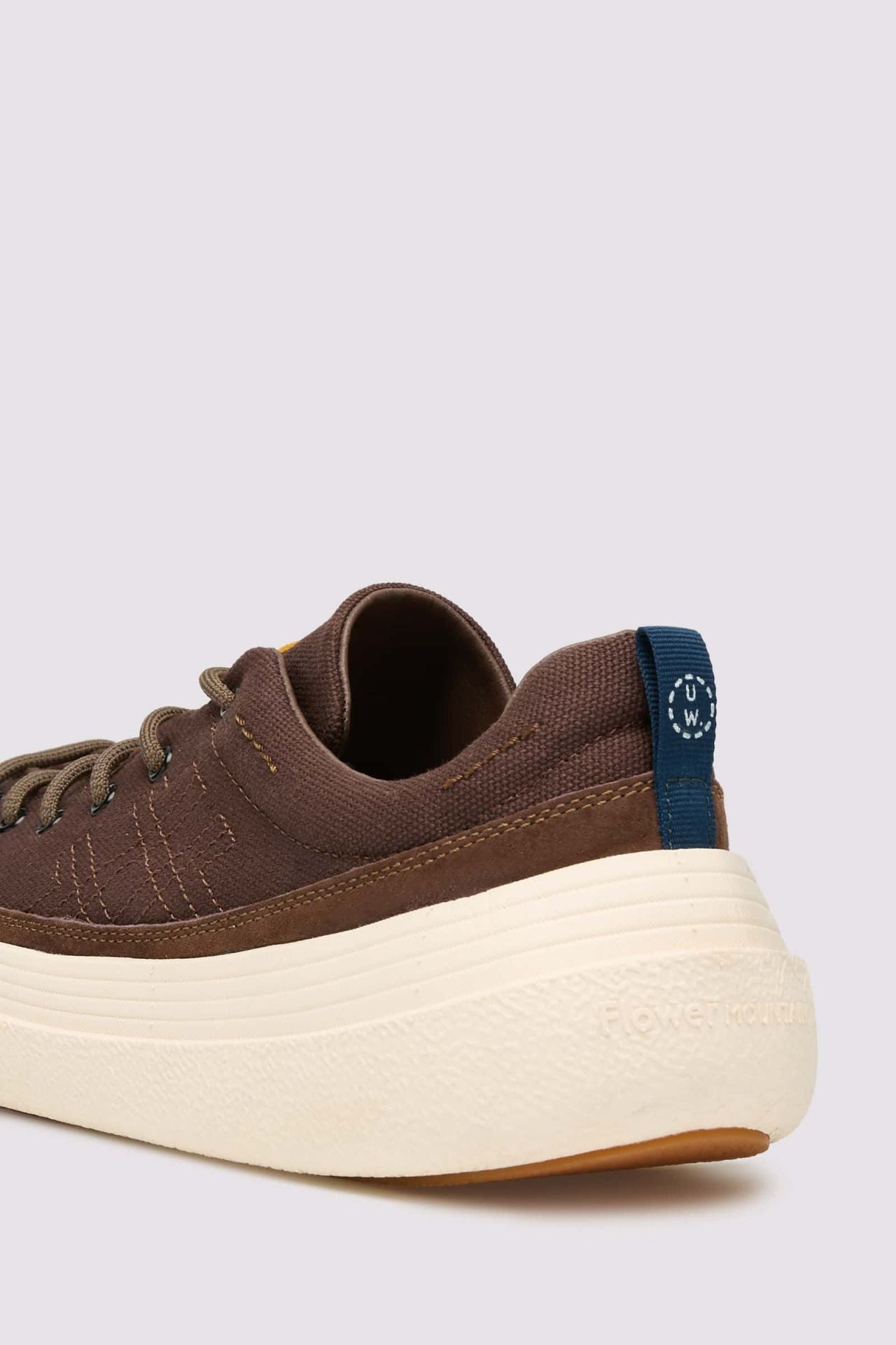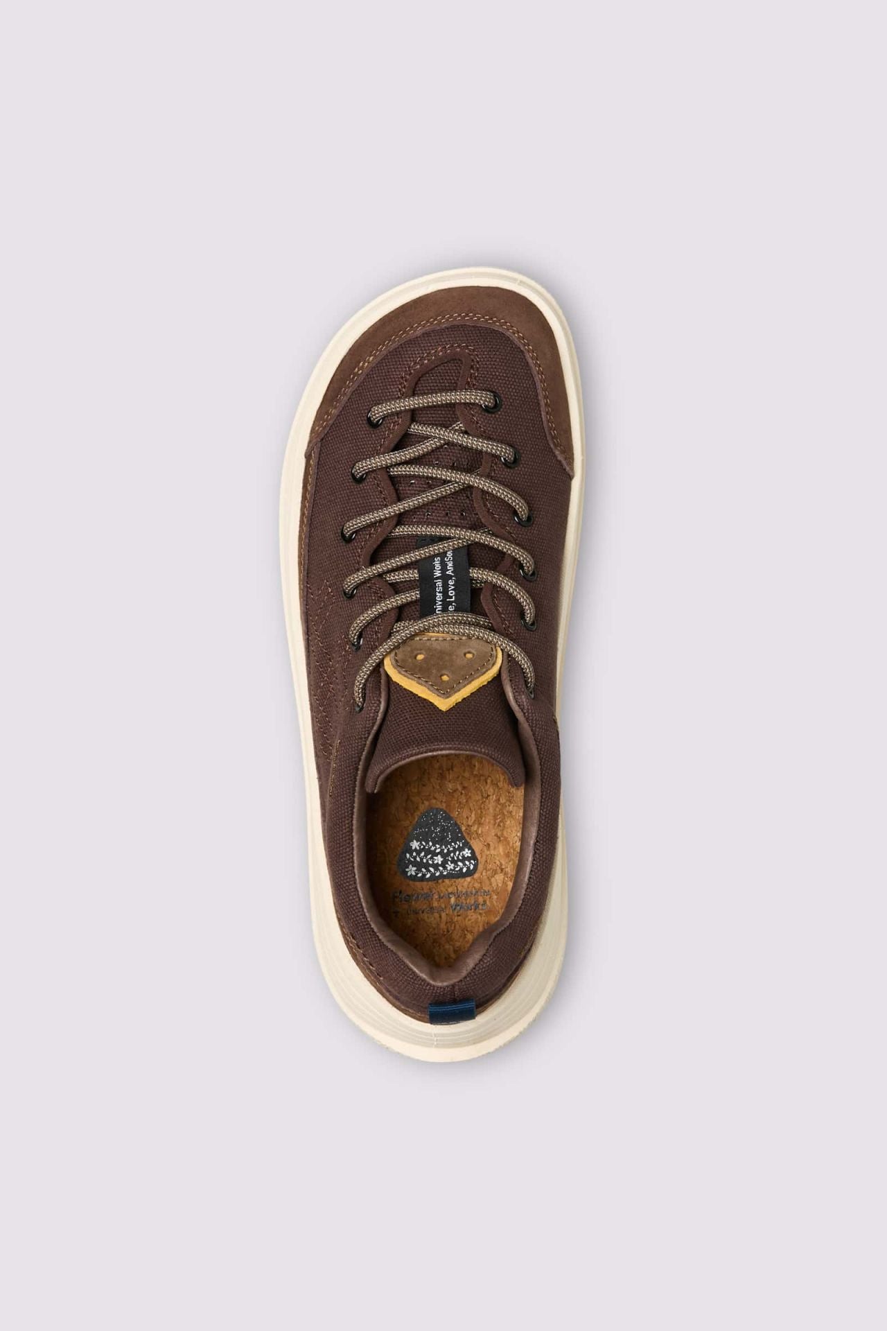 Low top sneaker with casual-inspired lines. The upper is made of cotton fabric with on-tone side stitching and suede trim. Trekking lace closure, leather lining and antibacterial natural cork insole. Bold rubber sole with high profile. This model was created in collaboration with Universal Works.