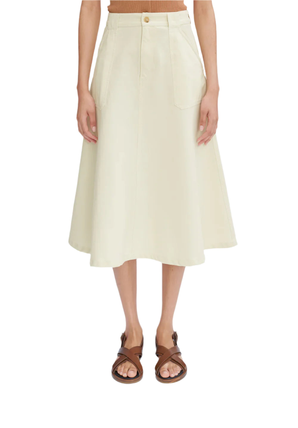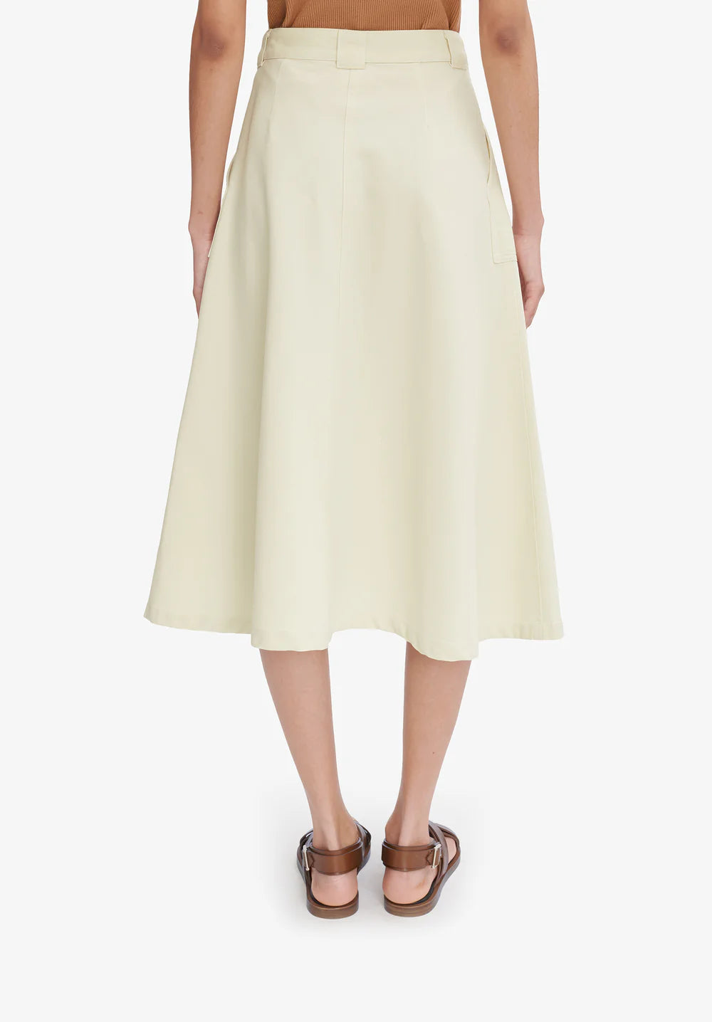 Jupe Laurie from A.P.C. is a skirt that embodies the essence of classic style. The deep navy colour is both elegant and versatile. Crafted from 100% GOTS-Certified cotton, this garment represents quality and ethical fashion. Its A-line silhouette and midi length are designed to flatter while providing a comfortable and graceful fit.