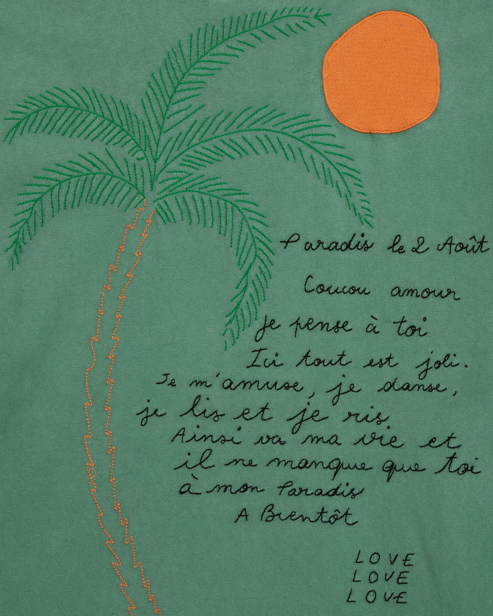 Our essential Patureau t-shirt has a loose fit, a ribbed neckline, and double-needle stitching at the bottom of the sleeves and body. Its embroidery represents a gentle correspondence.