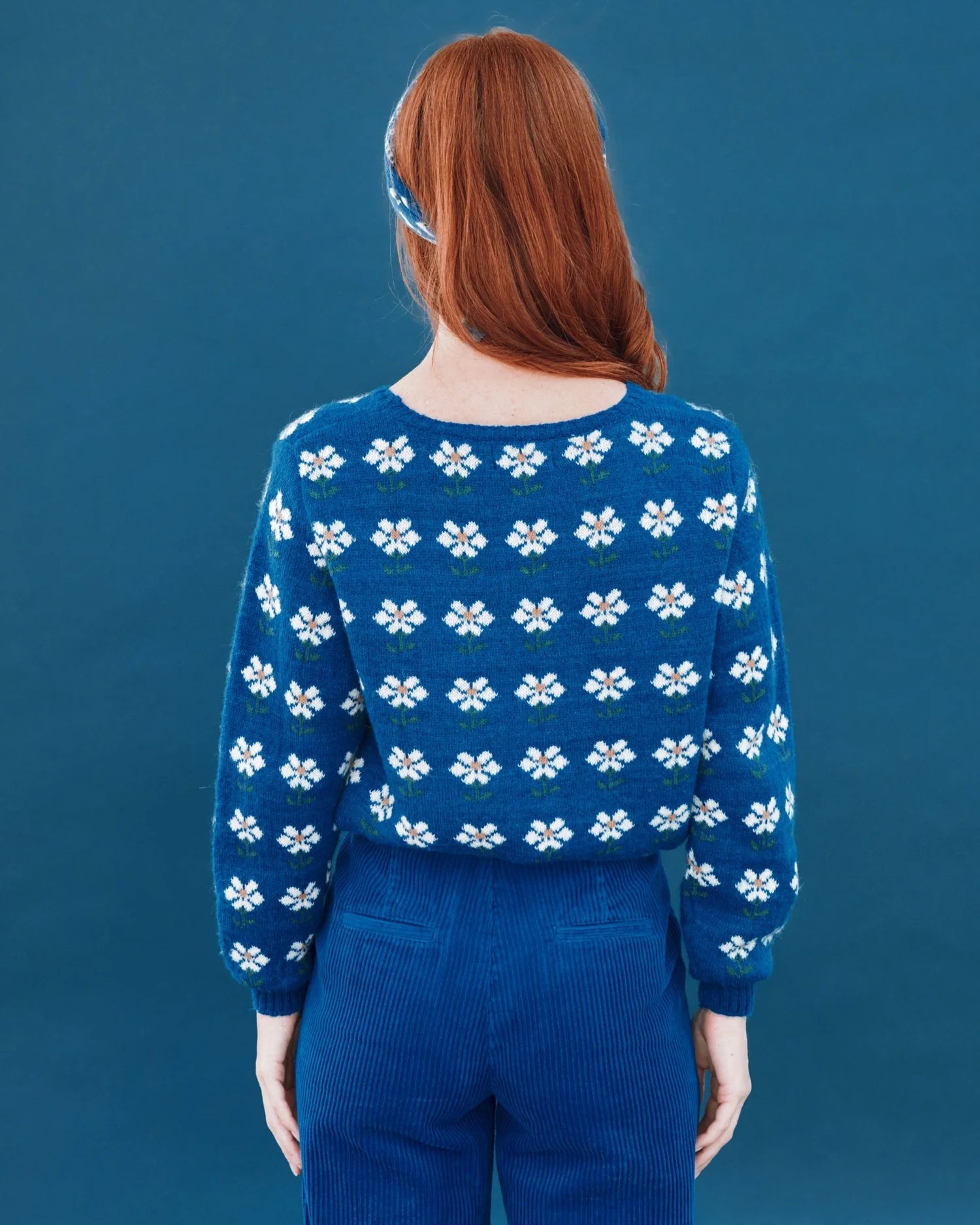 Blue and white sweater in alpaca wool blend. It is knitted in jersey knits and the patterns are made of jacquard.