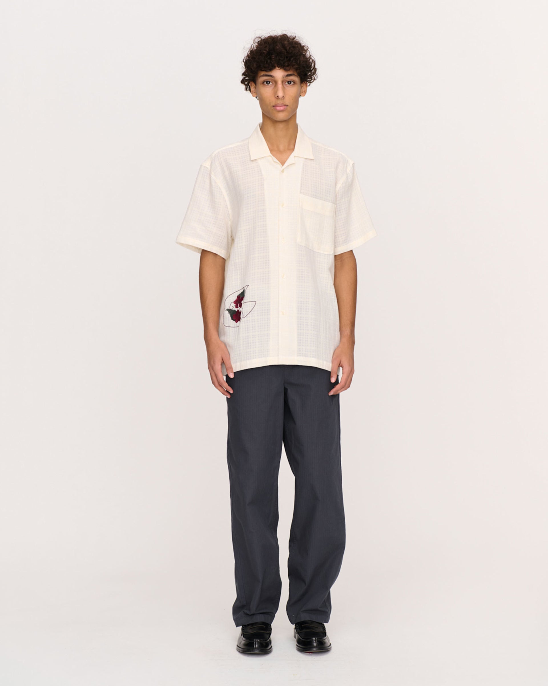 This relaxed short-sleeved shirt comes with a camp-collar in a breezy, textured cotton fabric and embroidered floral artwork on its lower front and lower back. Features a hidden button closure at top of placket. 100% cotton.