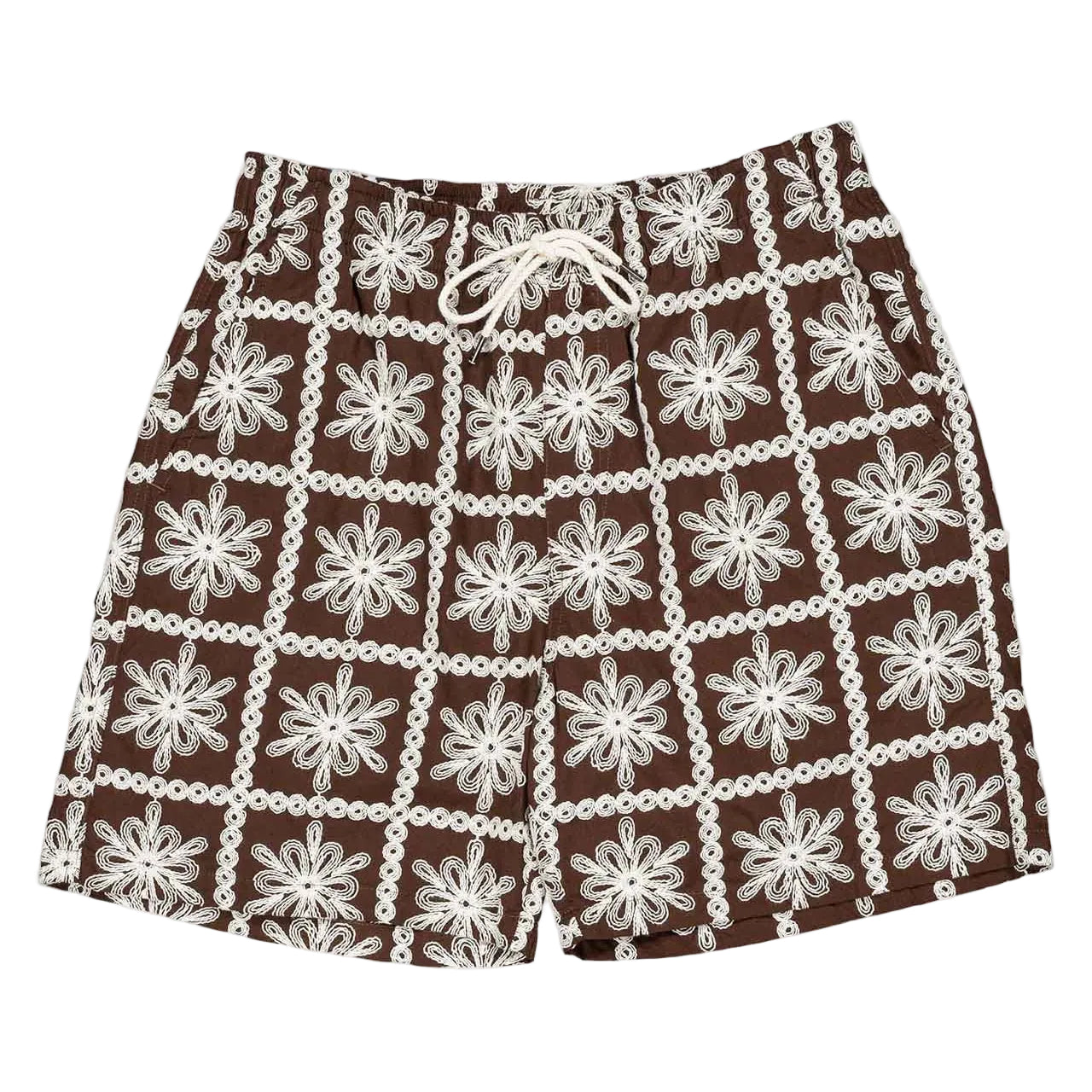 A slightly longer version of our essential Bodhi shorts. It retains all the comfort with its elasticated waistband and loose fit, all in a lightweight and supple cotton, enhanced by all-over floral and graphic embroideries.