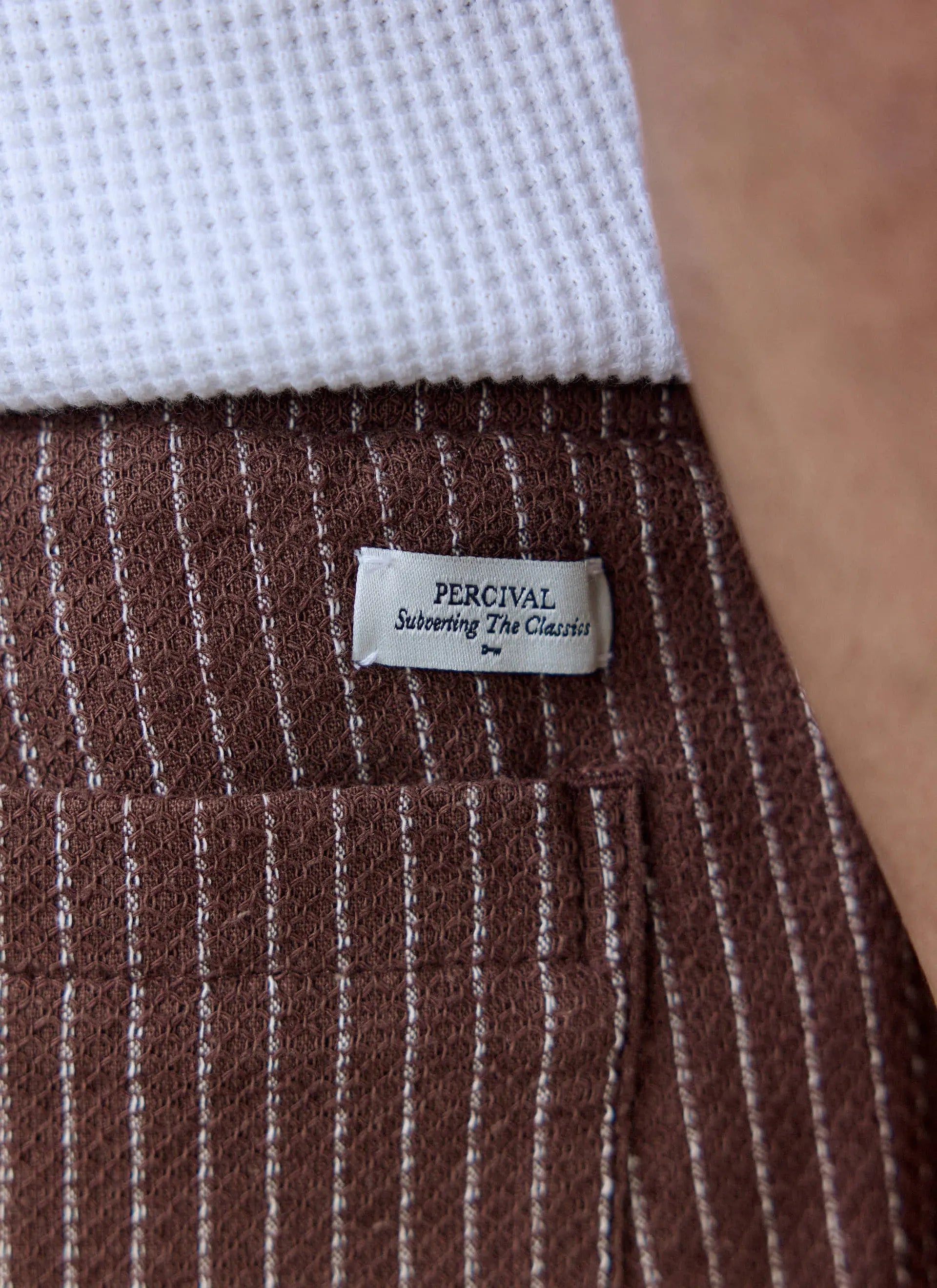 Sorrento, a summer staple. Cut from a breathable cotton linen blend with a relaxed straight leg, these shorts bring ease and polish to warm days. Elasticated waistband, drawcord, pockets for the essentials; smart enough for the city, comfortable enough for the coast. Finished in a rich brown with a subtle vertical stripe.