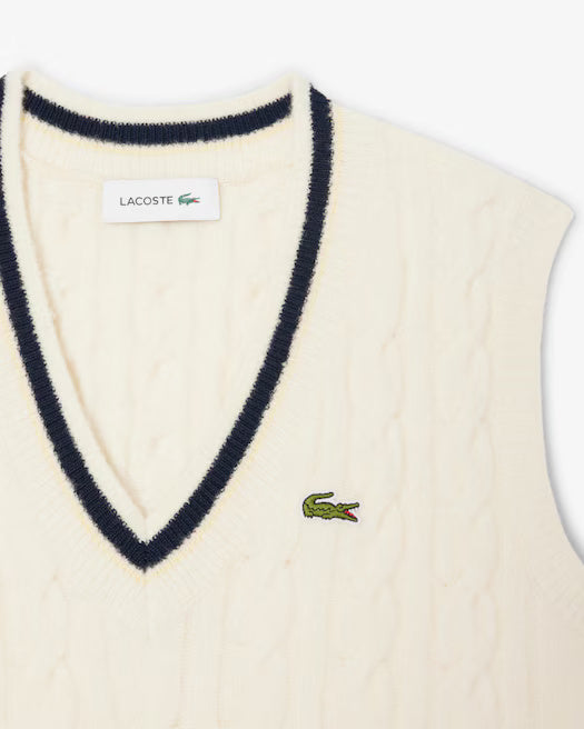 This sweater vest is the fruit of 90 years of Lacoste knitwear expertise. Made from wool with fine contrast stripes and a classic cable knit for a soft, warm, elegant result that's perfect for every day. A relaxed chic piece, finished with the essential crocodile.