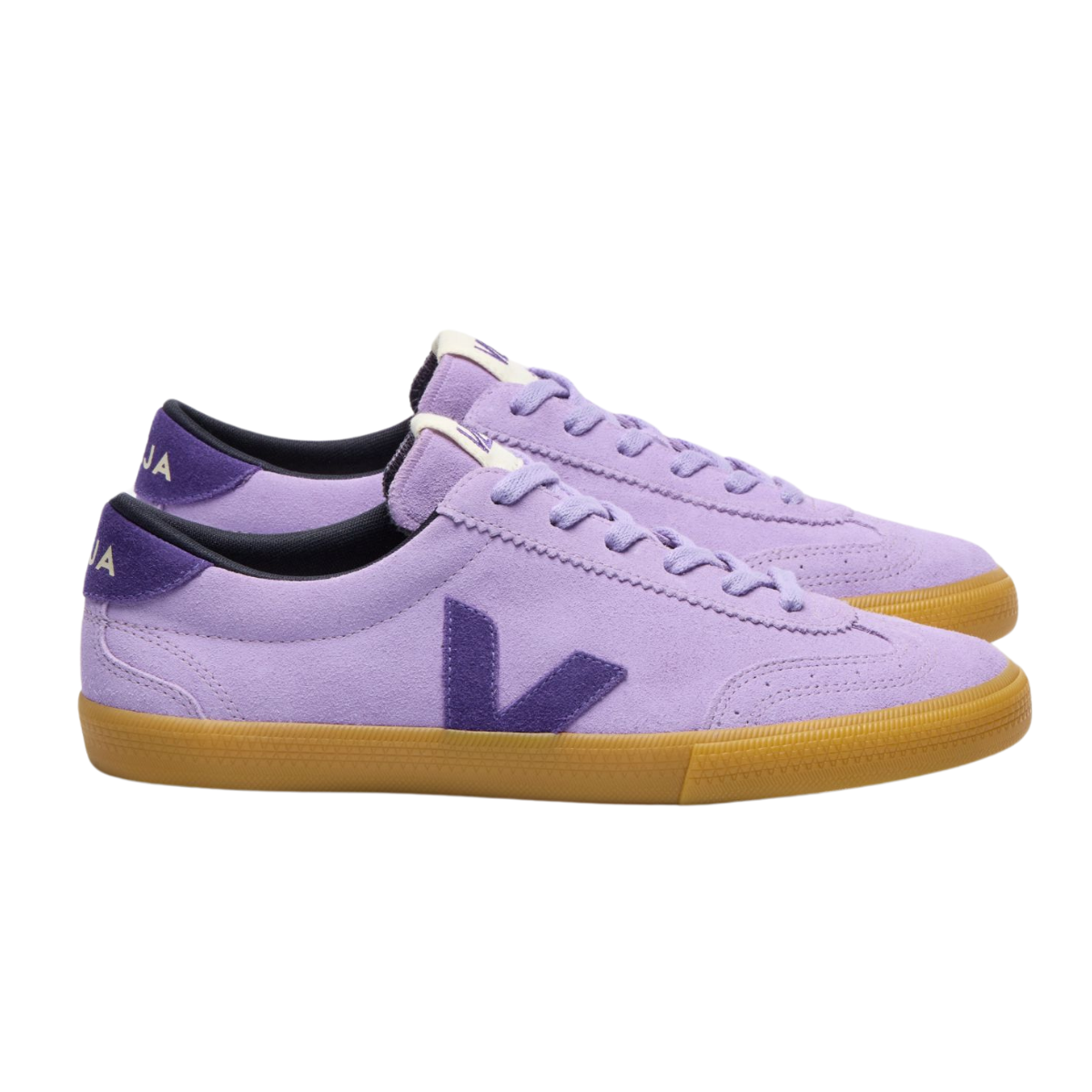 These sneakers by Veja feature a soft lavande (lavender) purple suede construction.