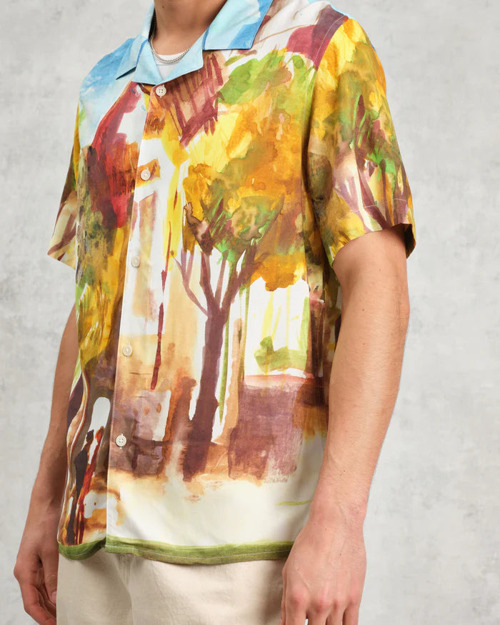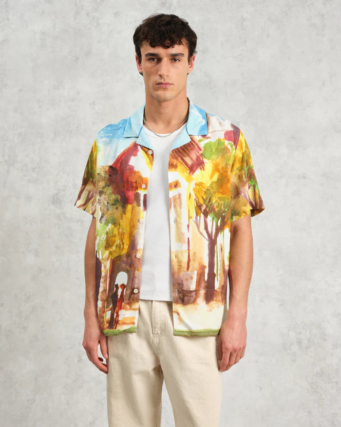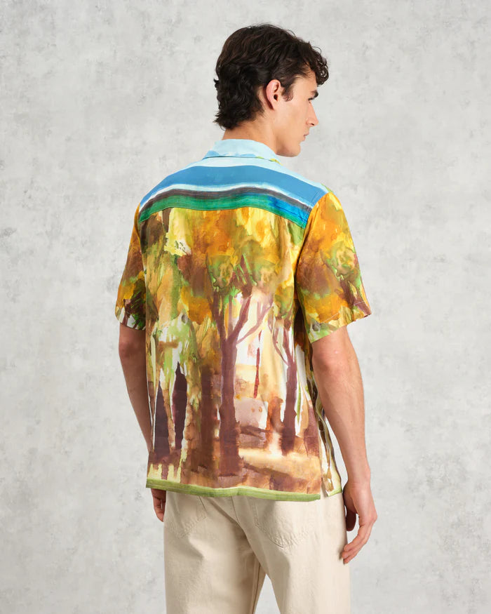Our staple Didcot short-sleeve shirt makes a triumphant return for SS25. Cut for a relaxed, breezy fit, this version is made from 100% viscose and showcases a screen printed watercolour painting design.