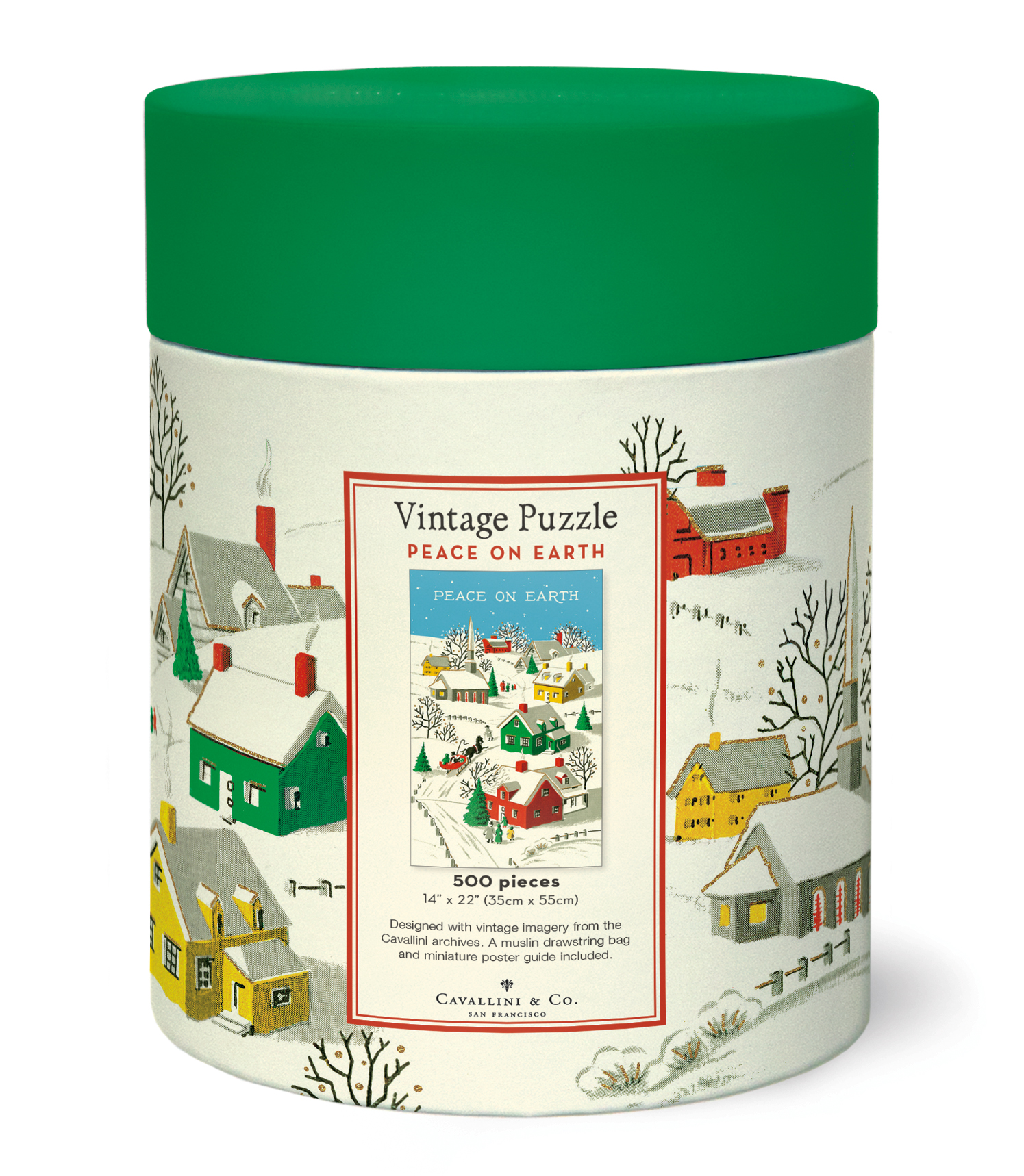 Cavallini's 500 piece puzzles are packaged in a 6.5 inch long cardboard tube, with puzzle pieces safely stored in a muslin bag inside. Finished puzzle measures 14 by 22 inches.