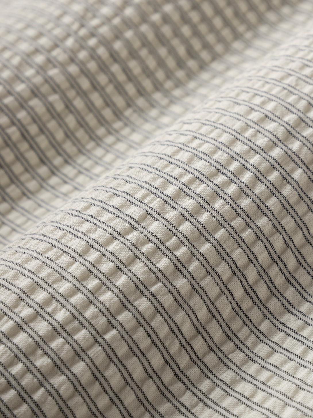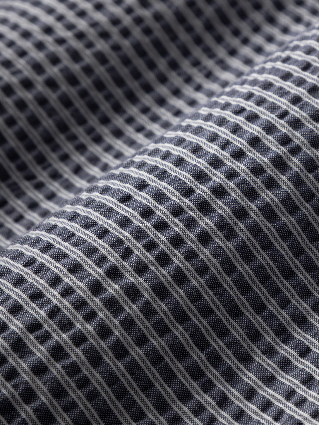 The Aleks Seersucker Stripe Shirt delivers vacation ease through classic seersucker in fine vertical stripes. The modern band collar and dry-touch easy-care finish maintain a sharp look without ironing. Lightweight and breathable, it keeps you cool while pairing effortlessly with holiday outfits—polished resort style with minimal upkeep.