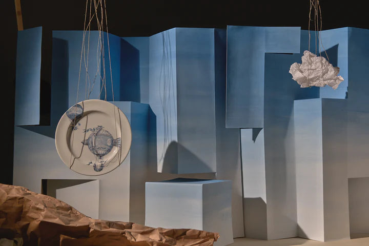 There are no boundaries to keep the small hot air balloons contained as they float freely in the space of the plate, occasionally emerging from it... A new piece is created every time, telling of imagined or fantasized adventures.