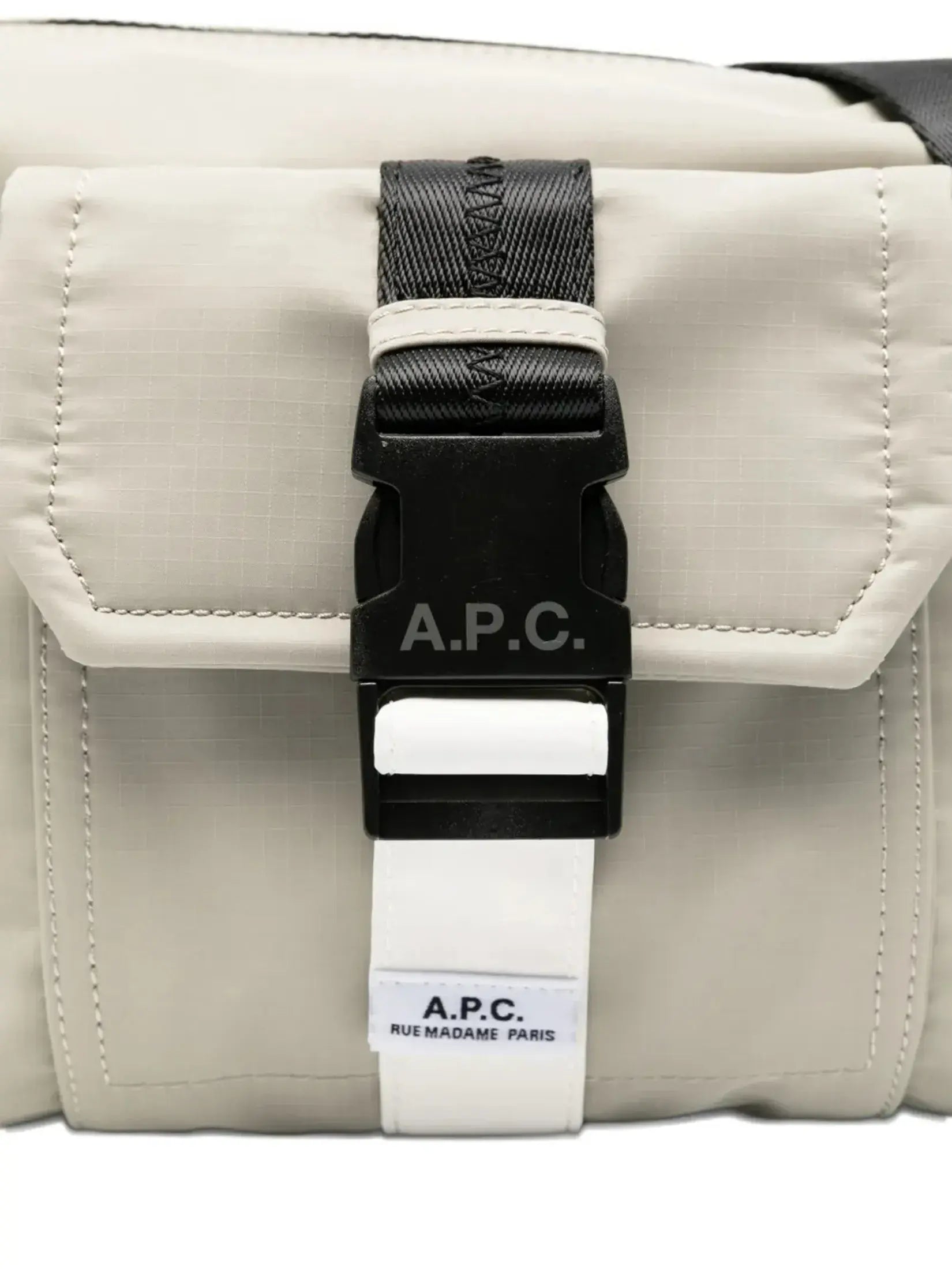 - One front pocket that closes with an A.P.C. logo buckle on a white strap with the "A.P.C. Rue Madame Paris" logo.