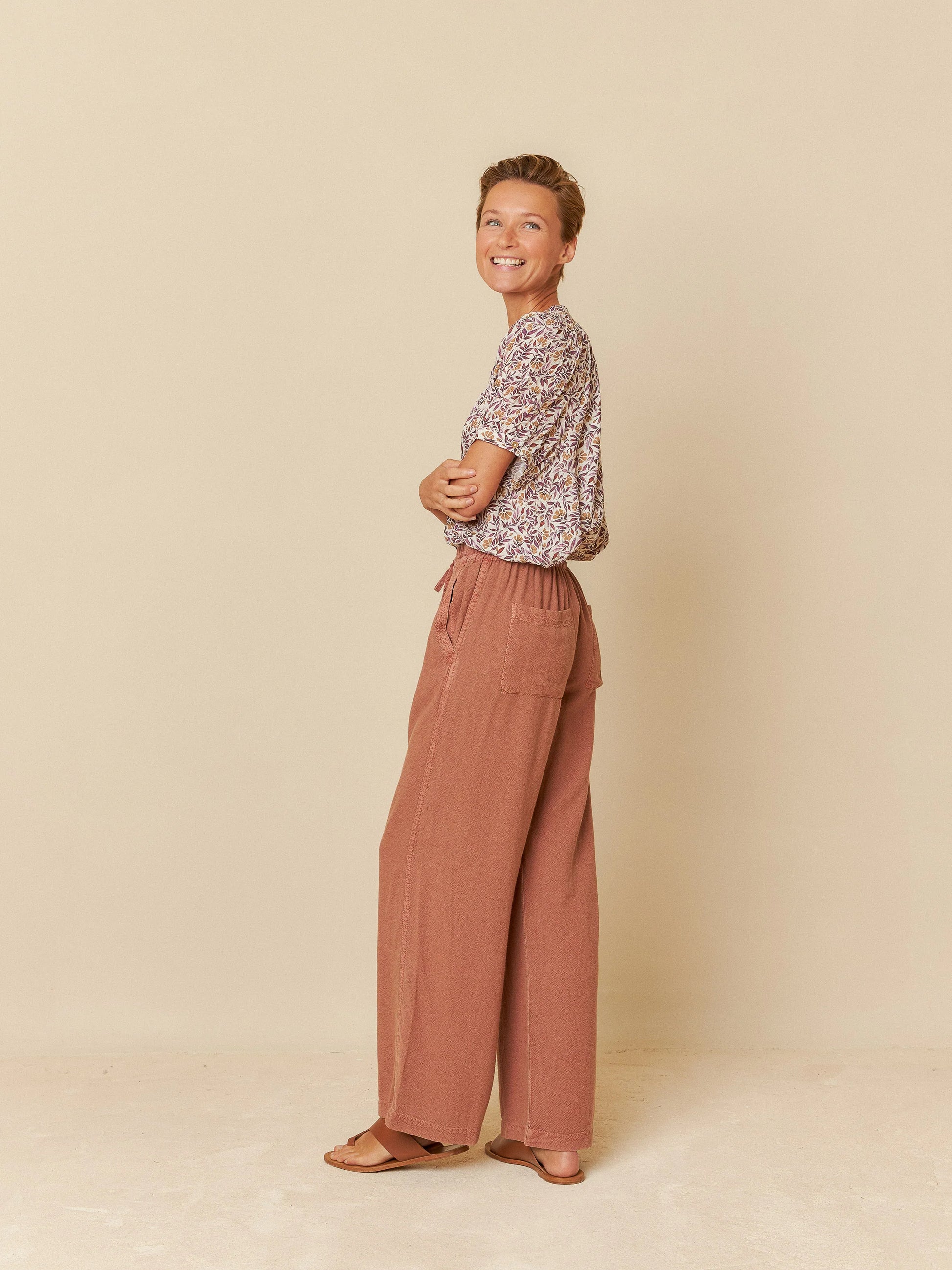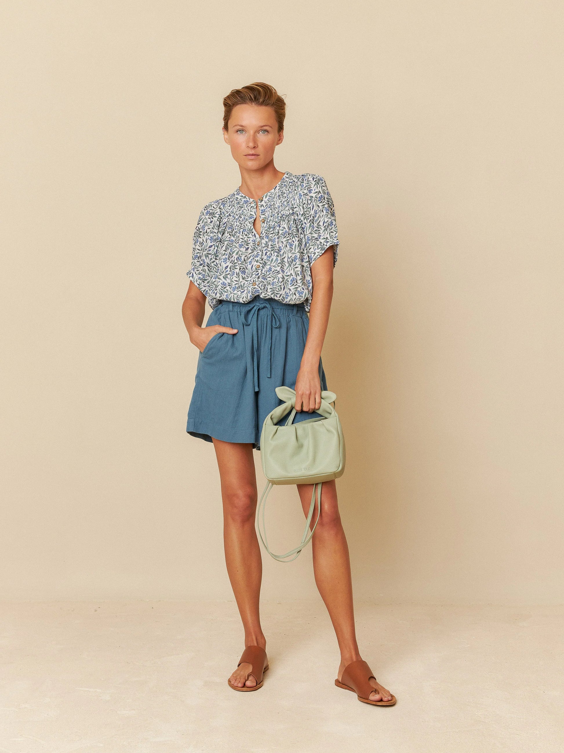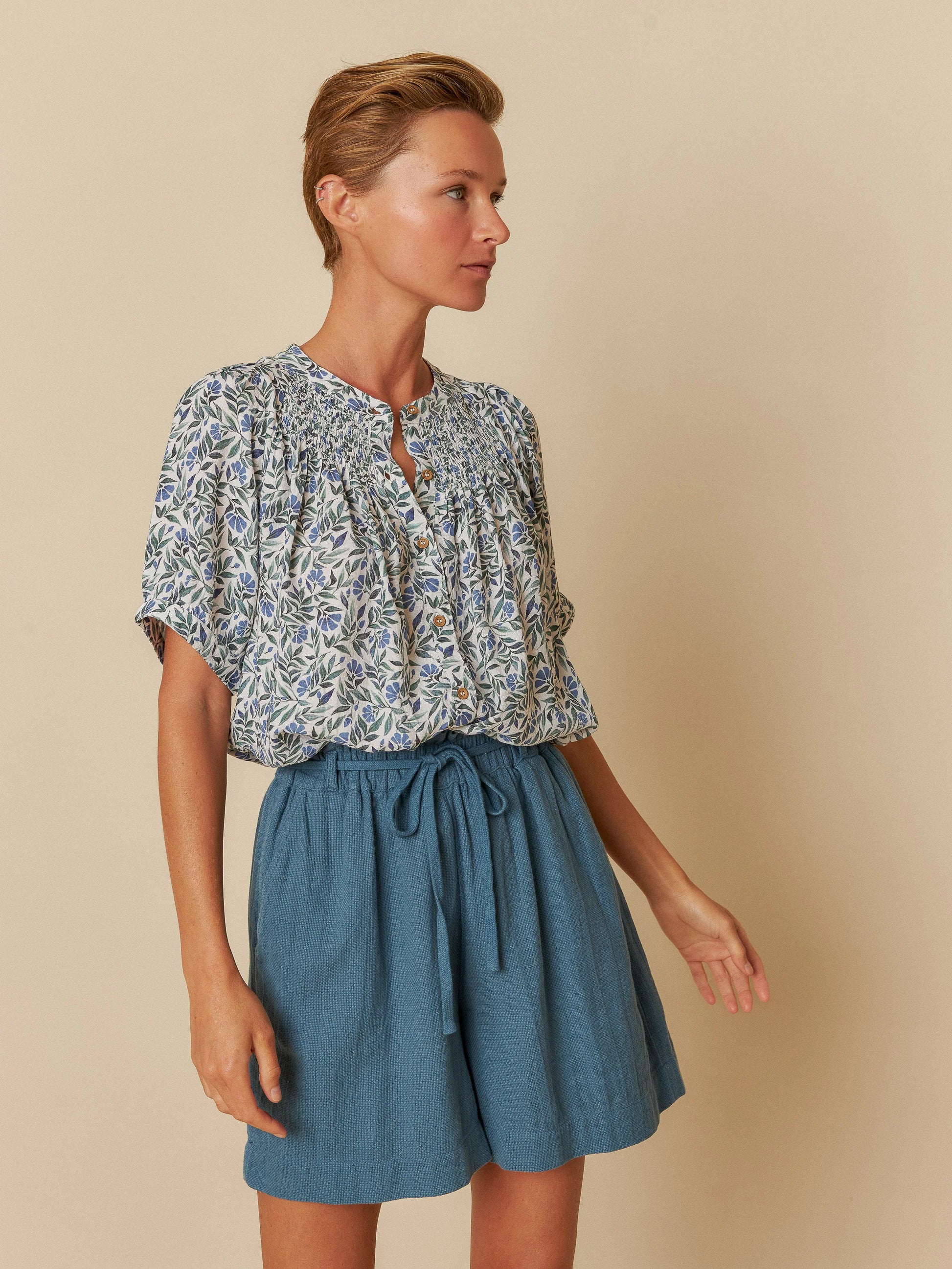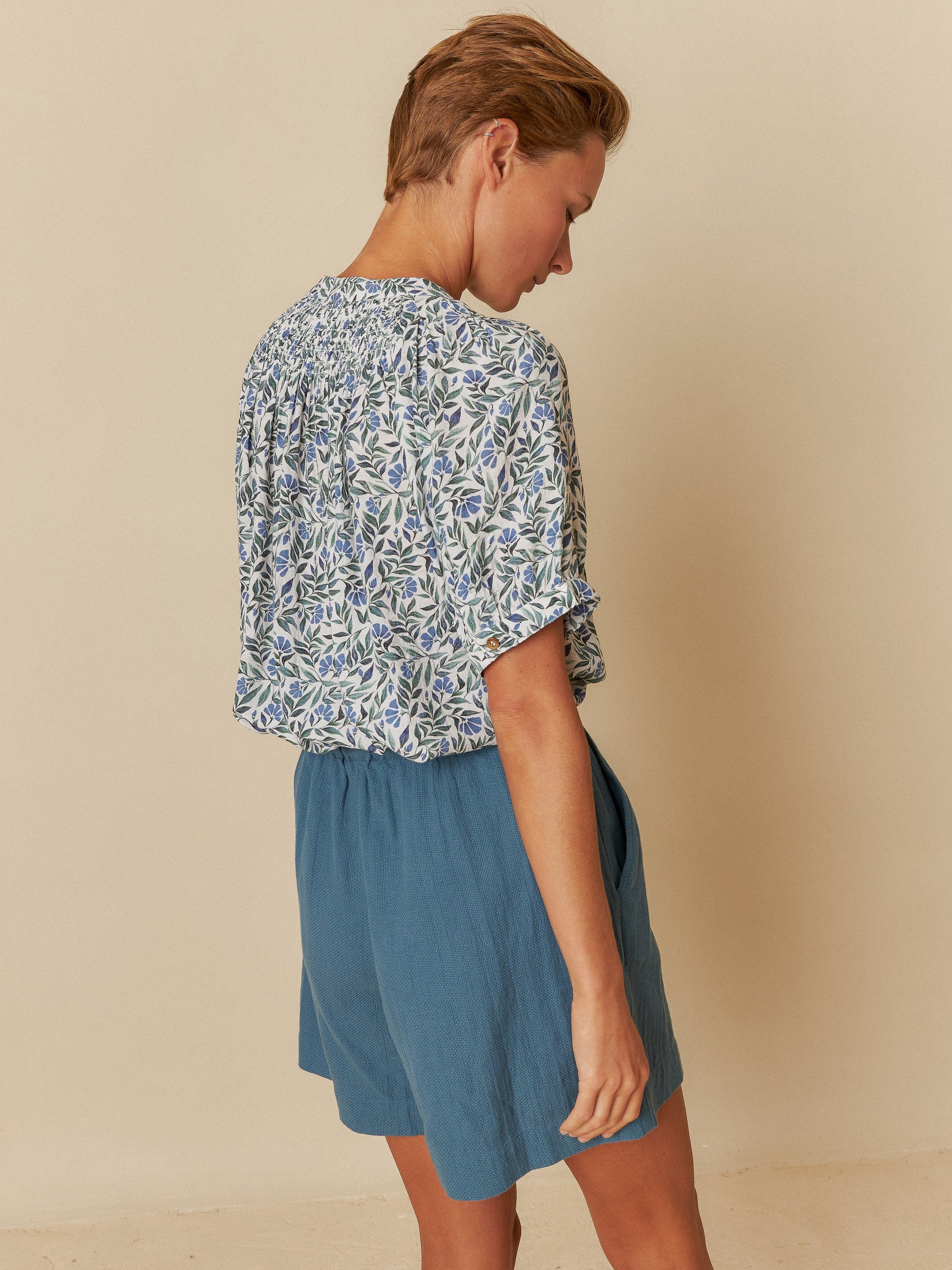This Indi & Cold flows viscose blouse offers a stylish touch to your wardrobe, featuring generous half sleeves with small banded cuffs and a pretty ruched yoke. The mandarin collar and button front add a touch of sophistication. Made with high-quality viscose fabric for a comfortable and elegant fit.