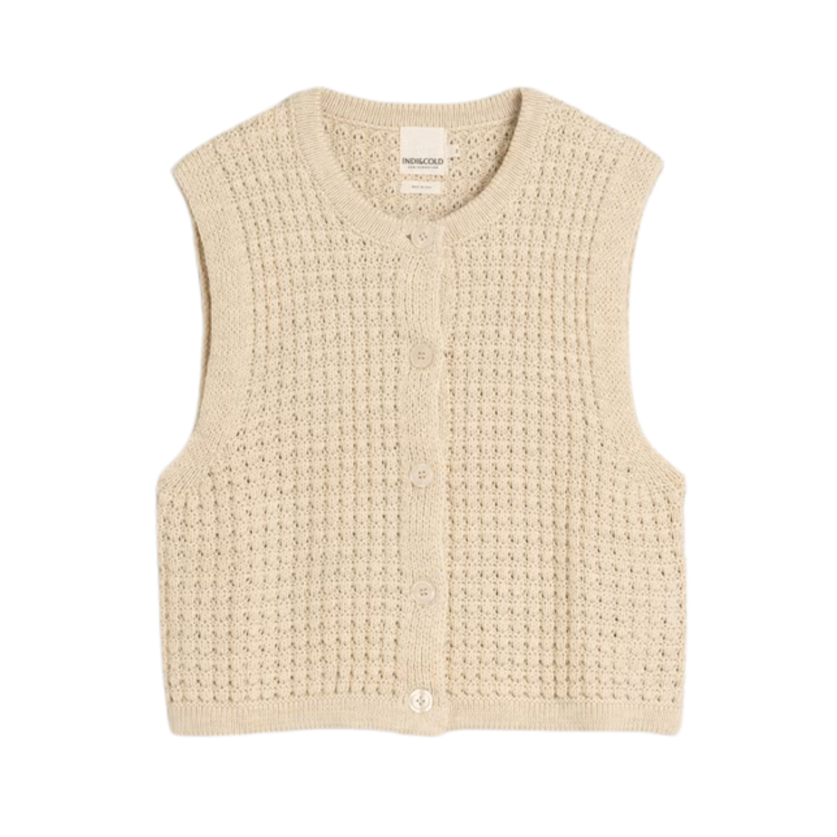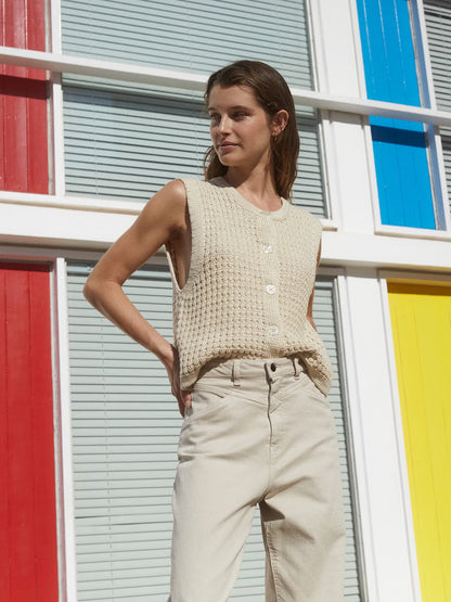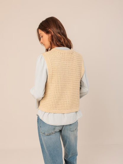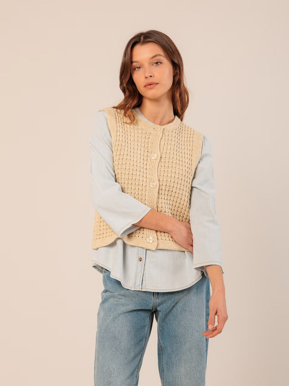 Our basket weave vest is unique. It has a basket weave stitch that gives the garment a waffle-like texture. We like to combine it with simple pants or an easy skirt. Have you tried it?