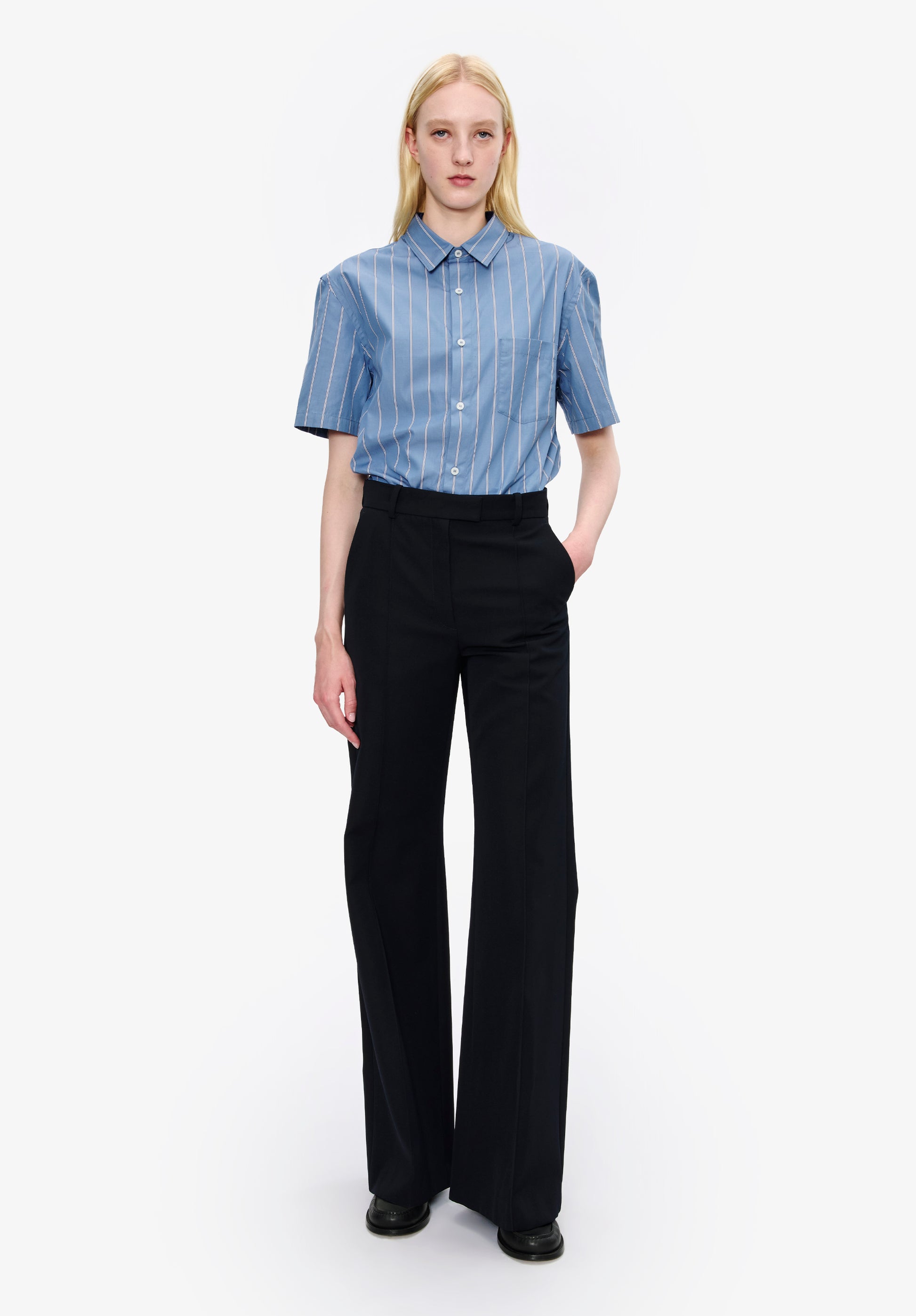 - Cropped, slightly flared cut with an oversized fit.