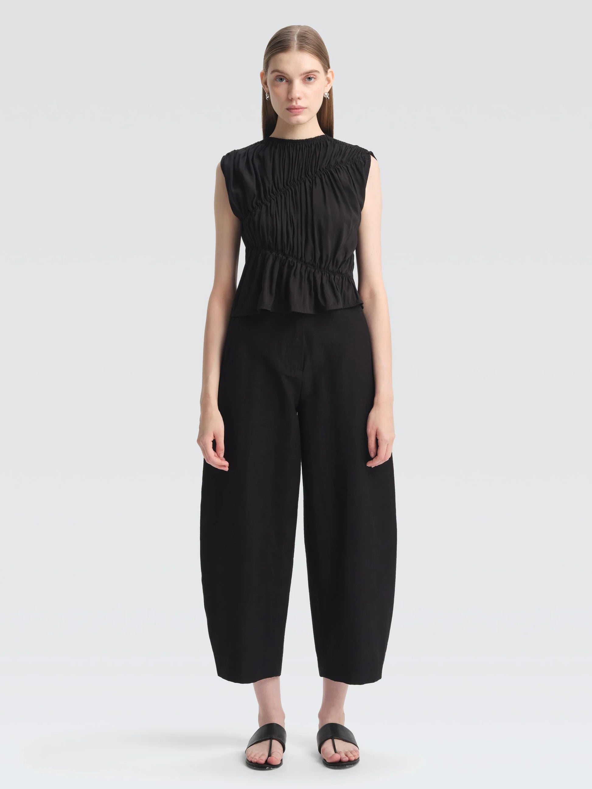 Crafted from lightweight cotton-linen, this top is cut in a cropped silhouette with shirring across the front and back for soft texture. Finished with a rounded neckline and clean stitching, it’s an easy, modern piece to pair with high- or mid-rise trousers.