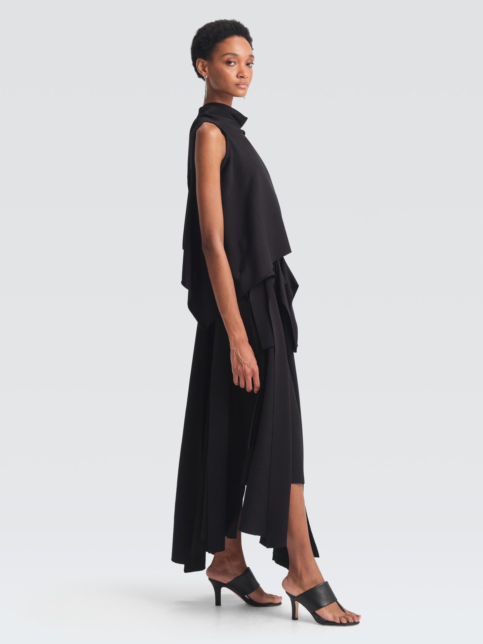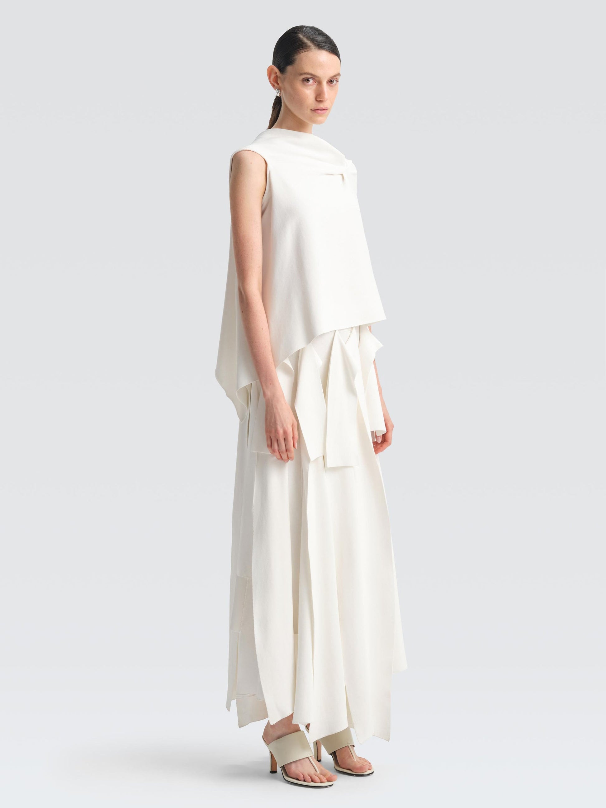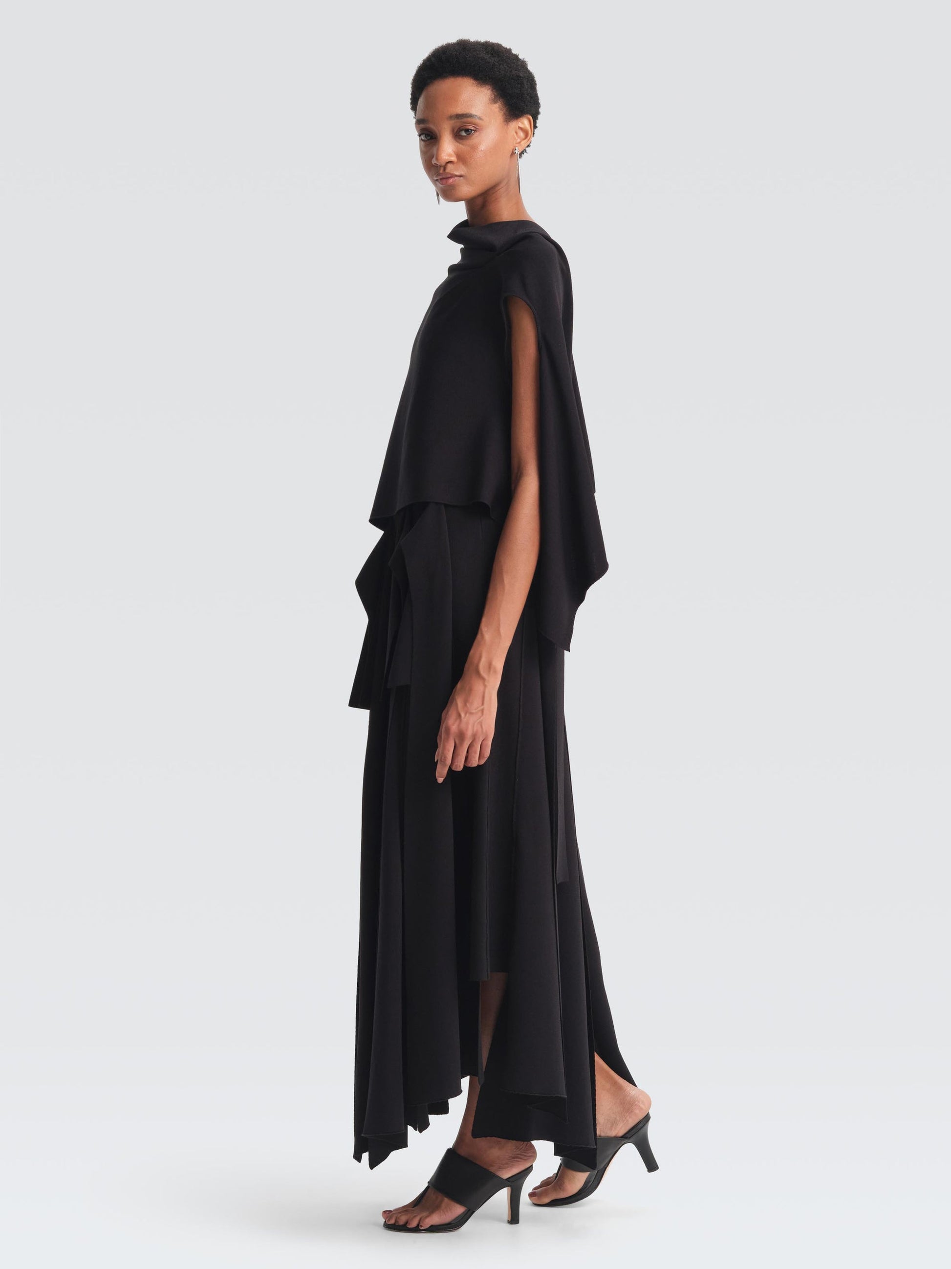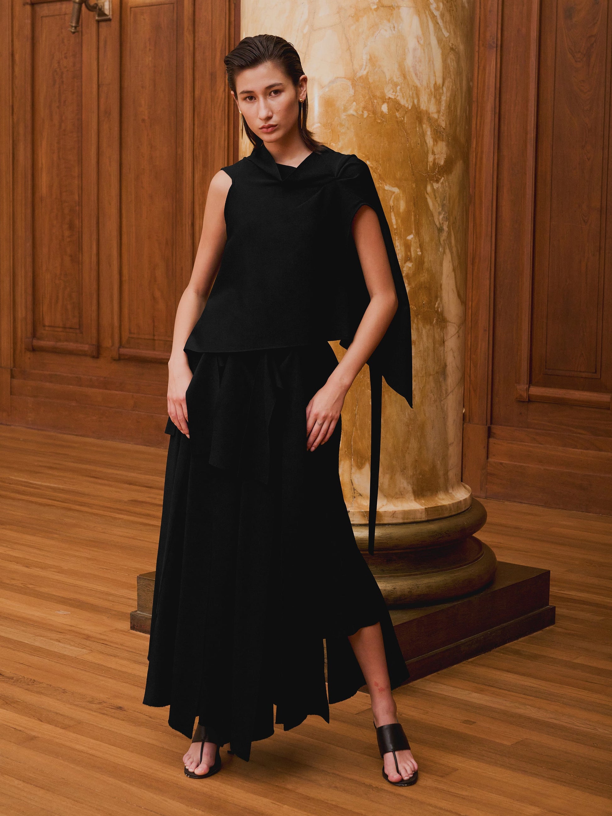 The HARPER top is crafted from a single knit panel that joins at the back, creating a draped neckline and an asymmetrical silhouette. Simple yet expressive, style it with the coordinating TUYMAN skirt, as seen on our runway.