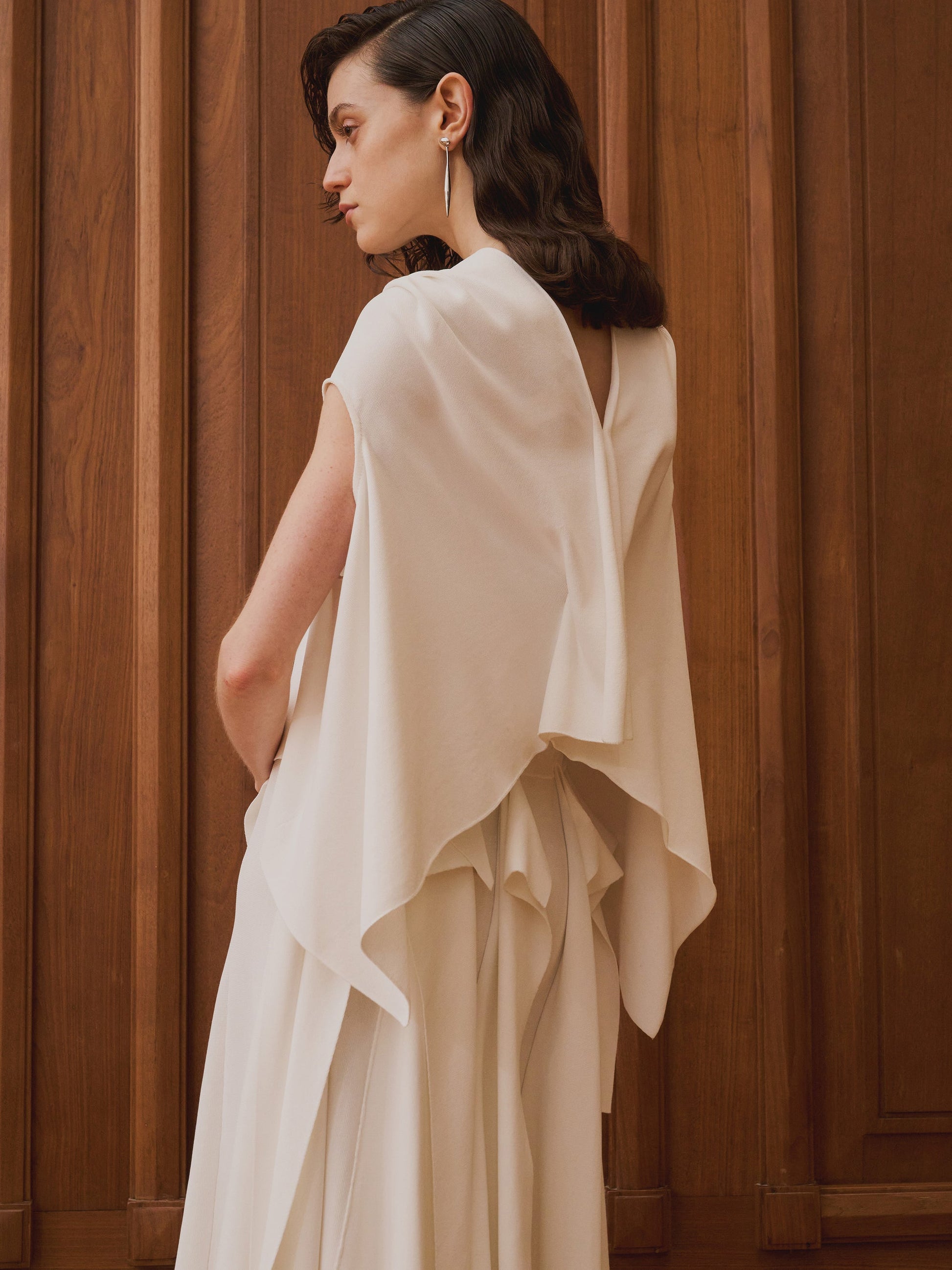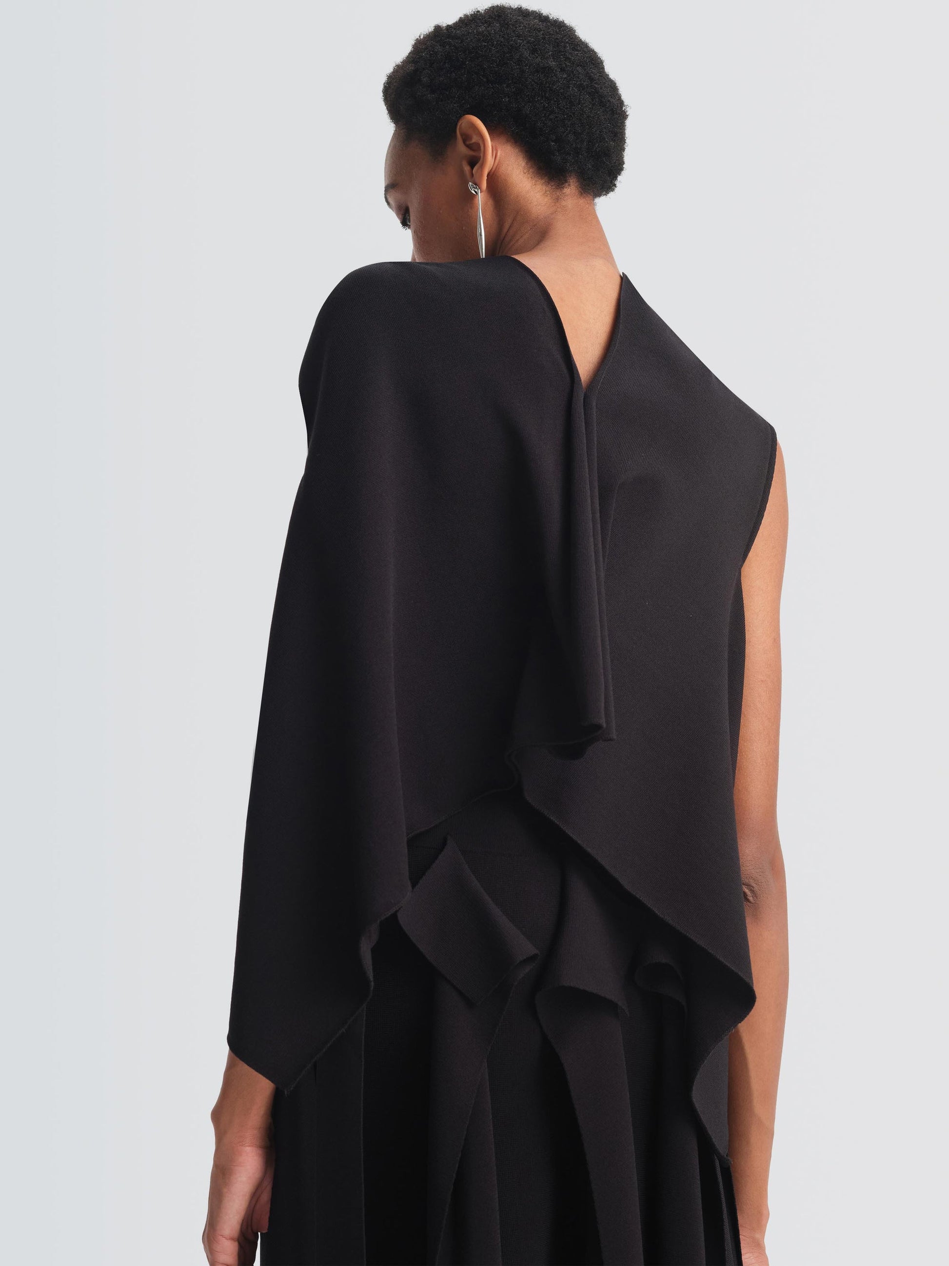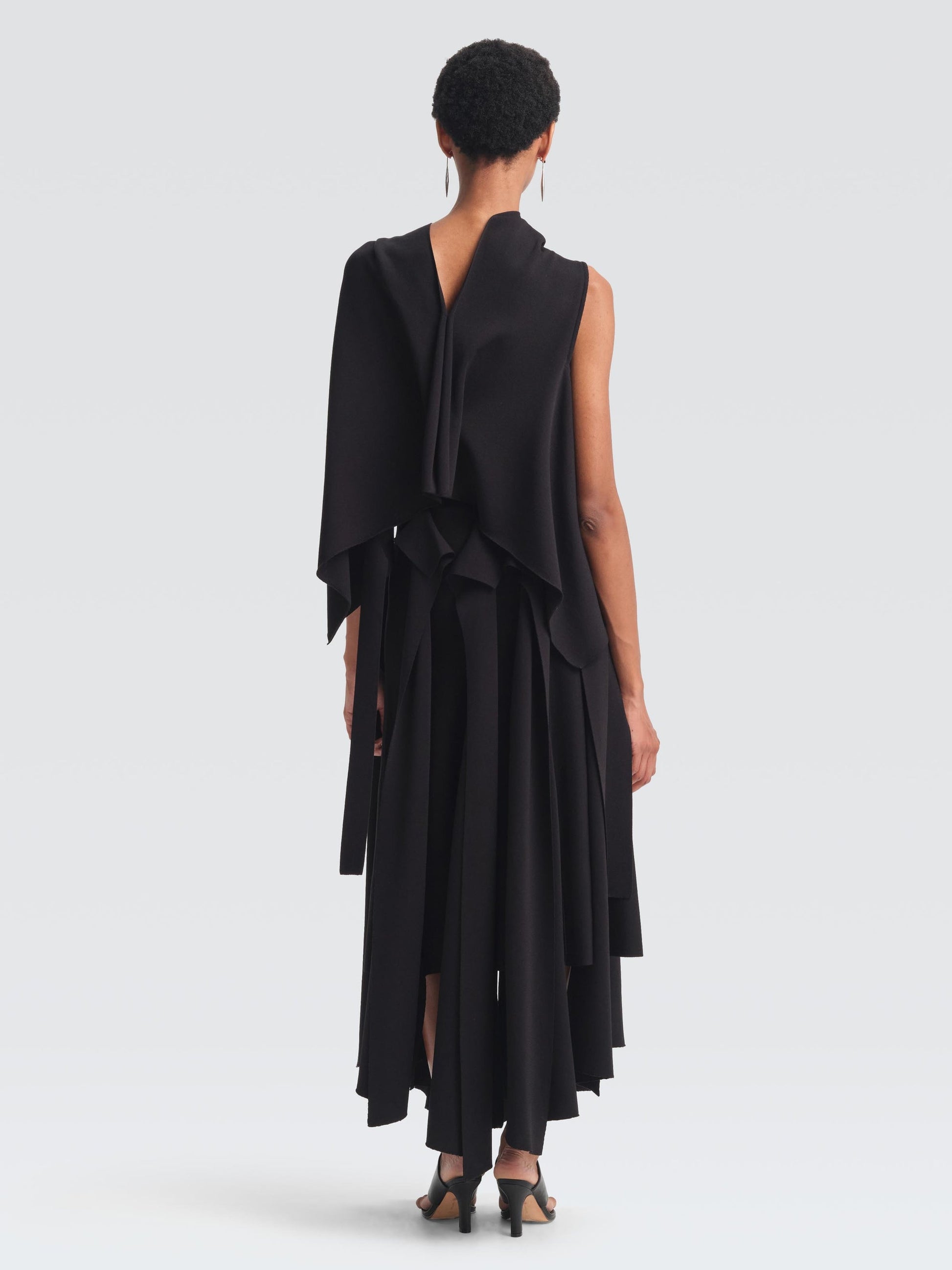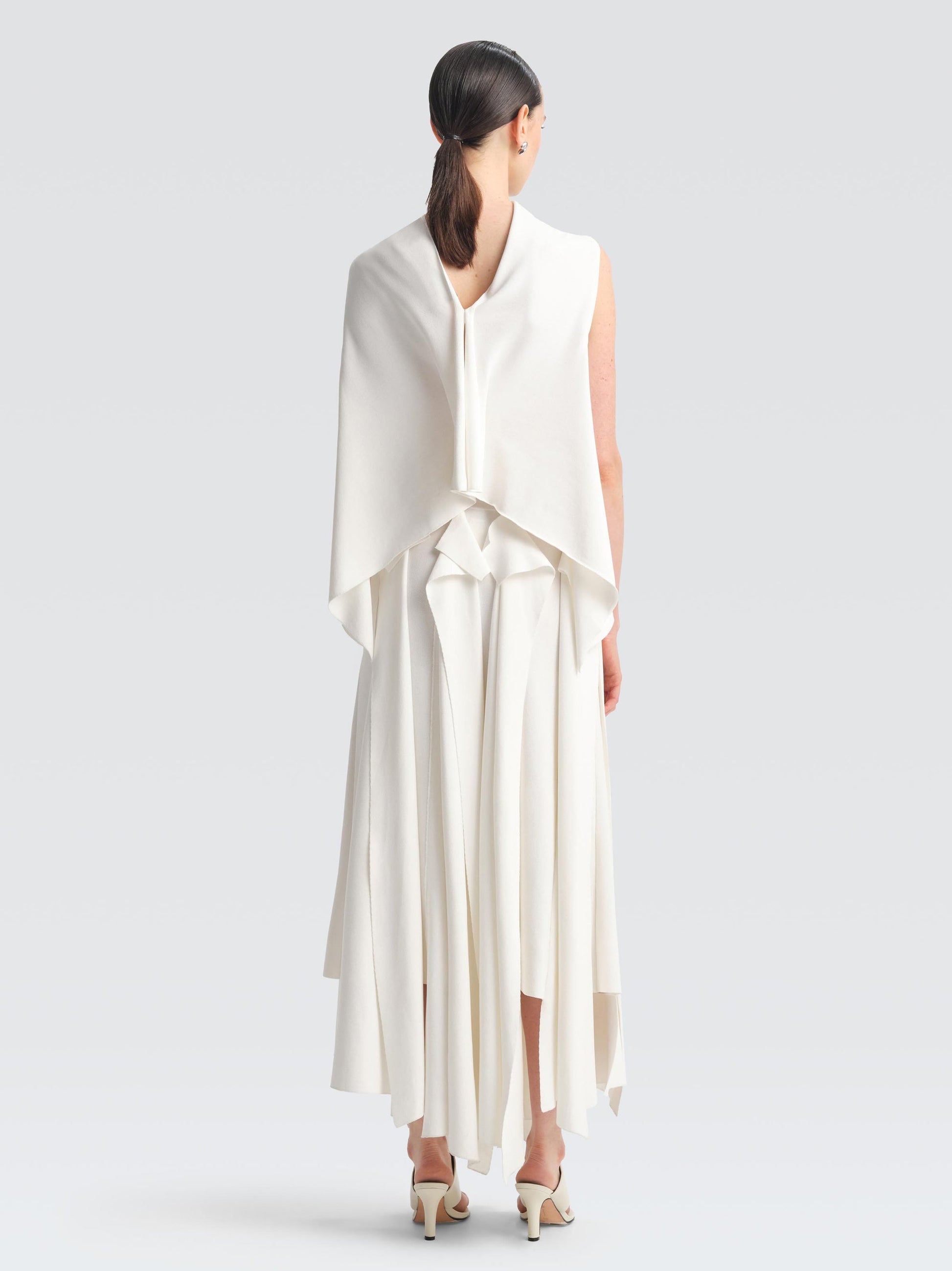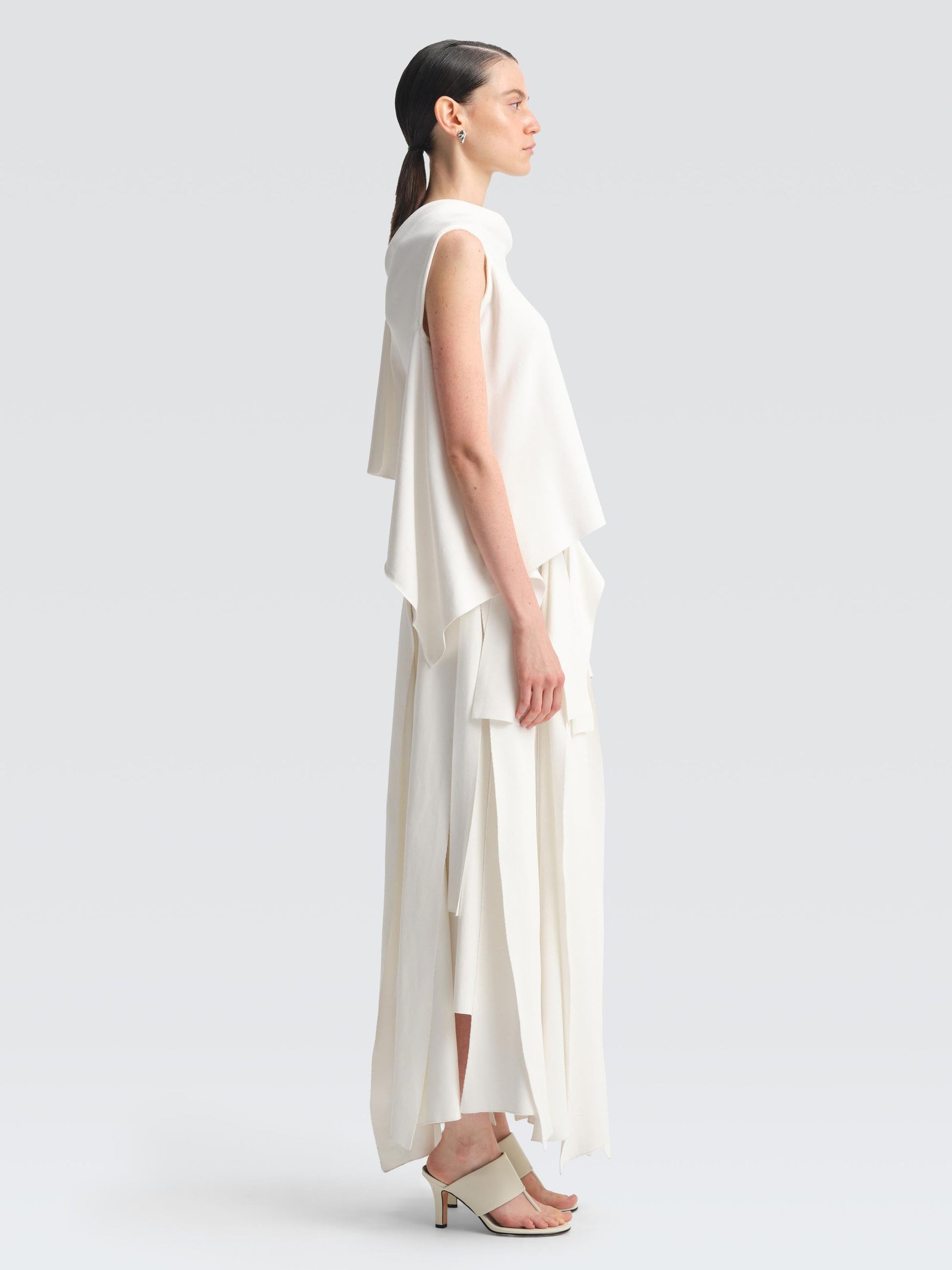 The HARPER top is crafted from a single knit panel that joins at the back, creating a draped neckline and an asymmetrical silhouette. Simple yet expressive, style it with the coordinating TUYMAN skirt, as seen on our runway.