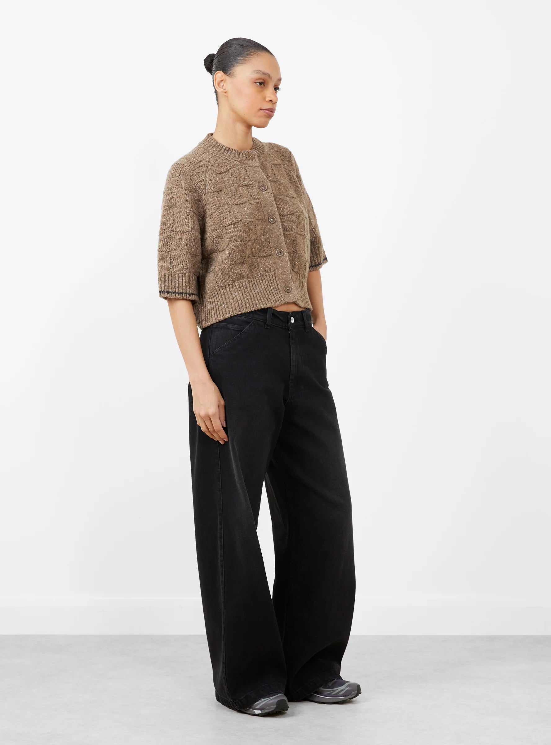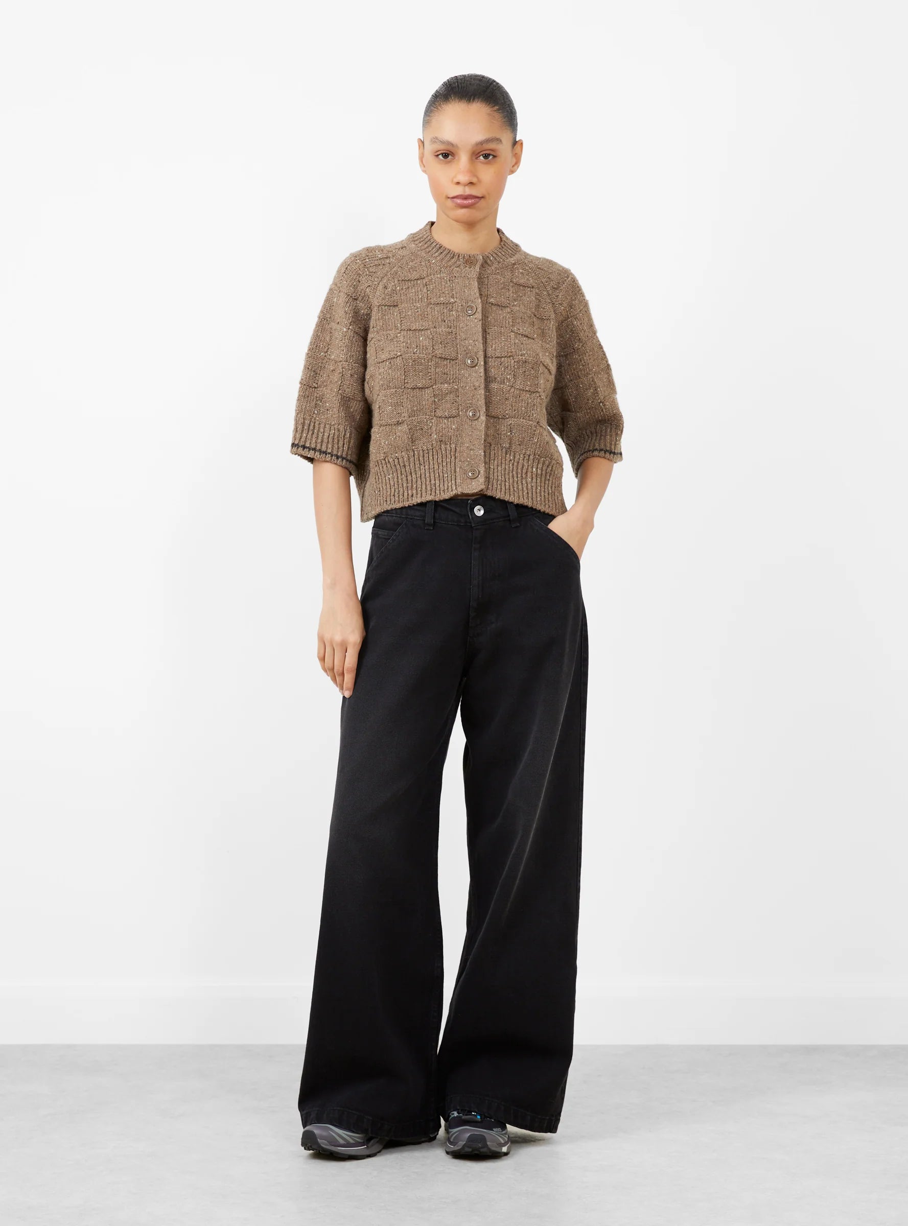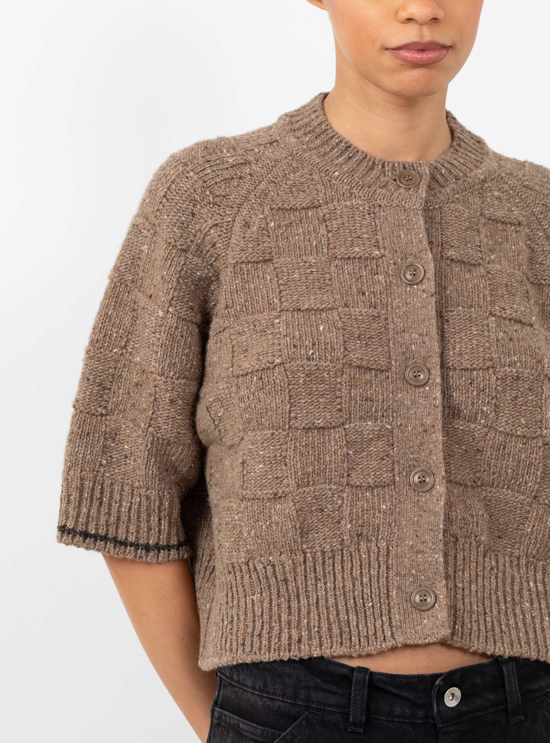 The Kwai Knit Cardigan from YMC arrives in Taupe. Made in Portugal from a merino wool blend, it is cut as a cropped short-sleeve cardigan with a regular fit. The cardigan features a knitted checked design in Donegal yarn, ribbed cuffs and hem, and a corozo button fastening.