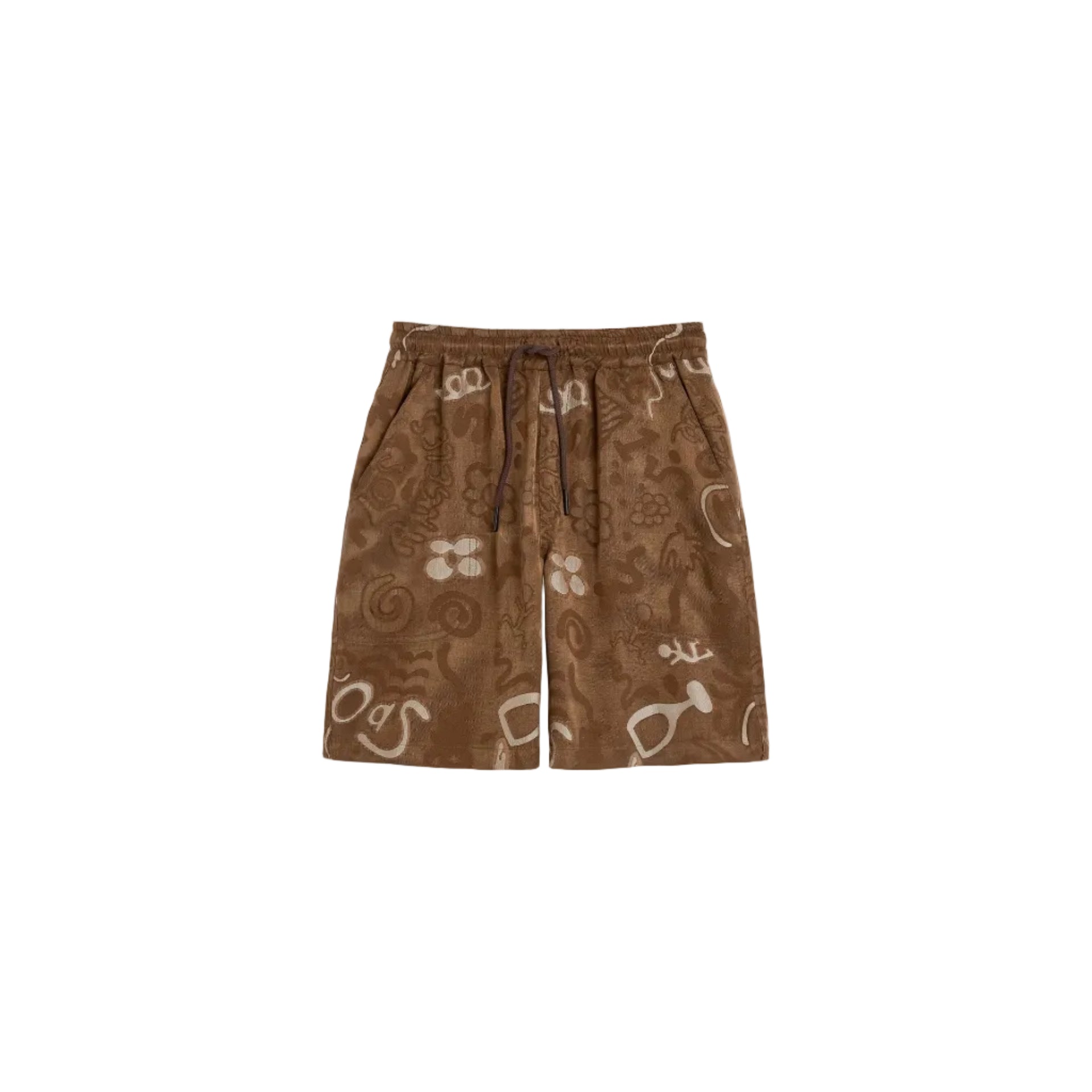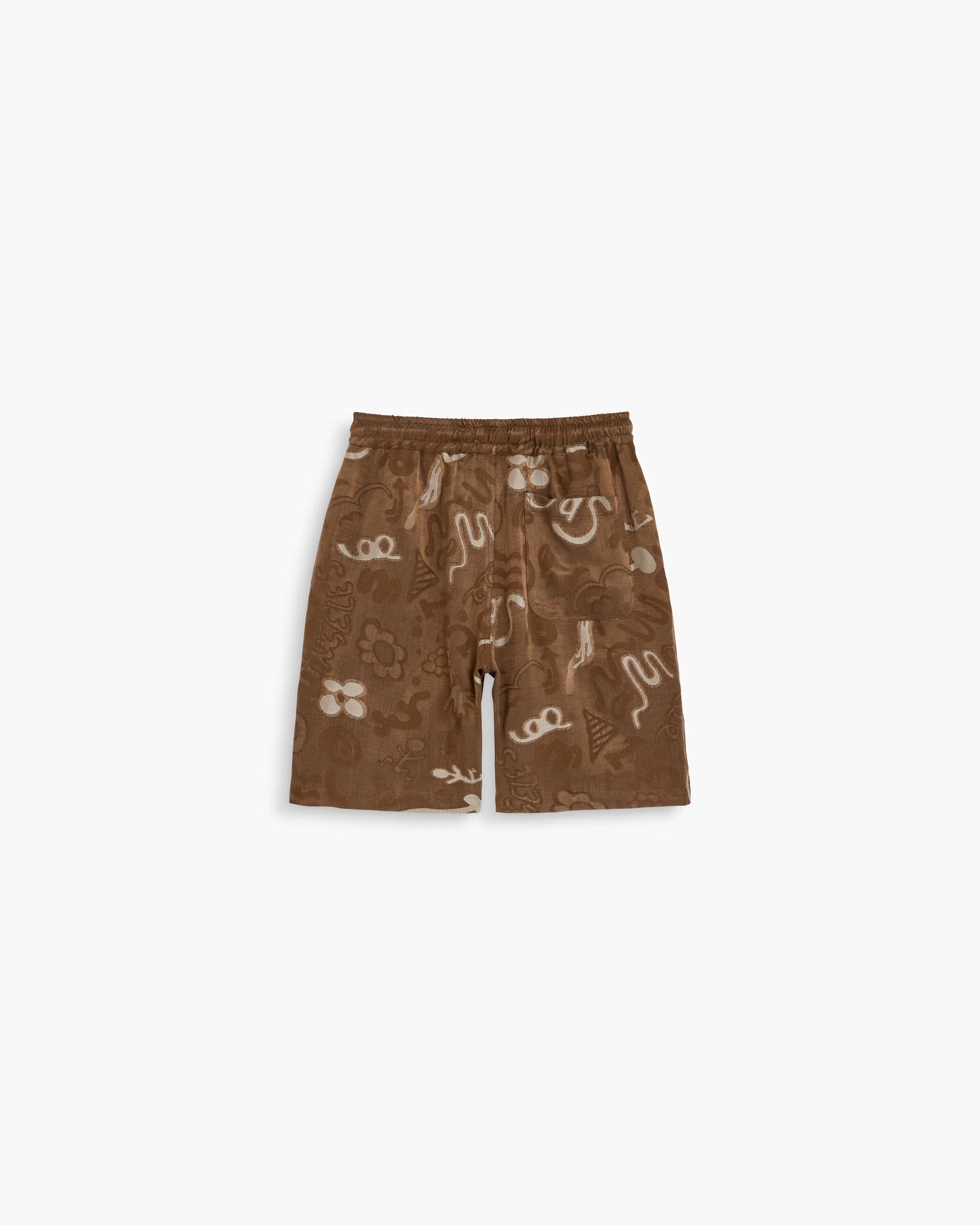 Brown jacquard shorts with abstract beige and off-white pattern of scribbles and organic shapes. Soft texture with elastic waist and side pockets. Relaxed fit with longer legs.