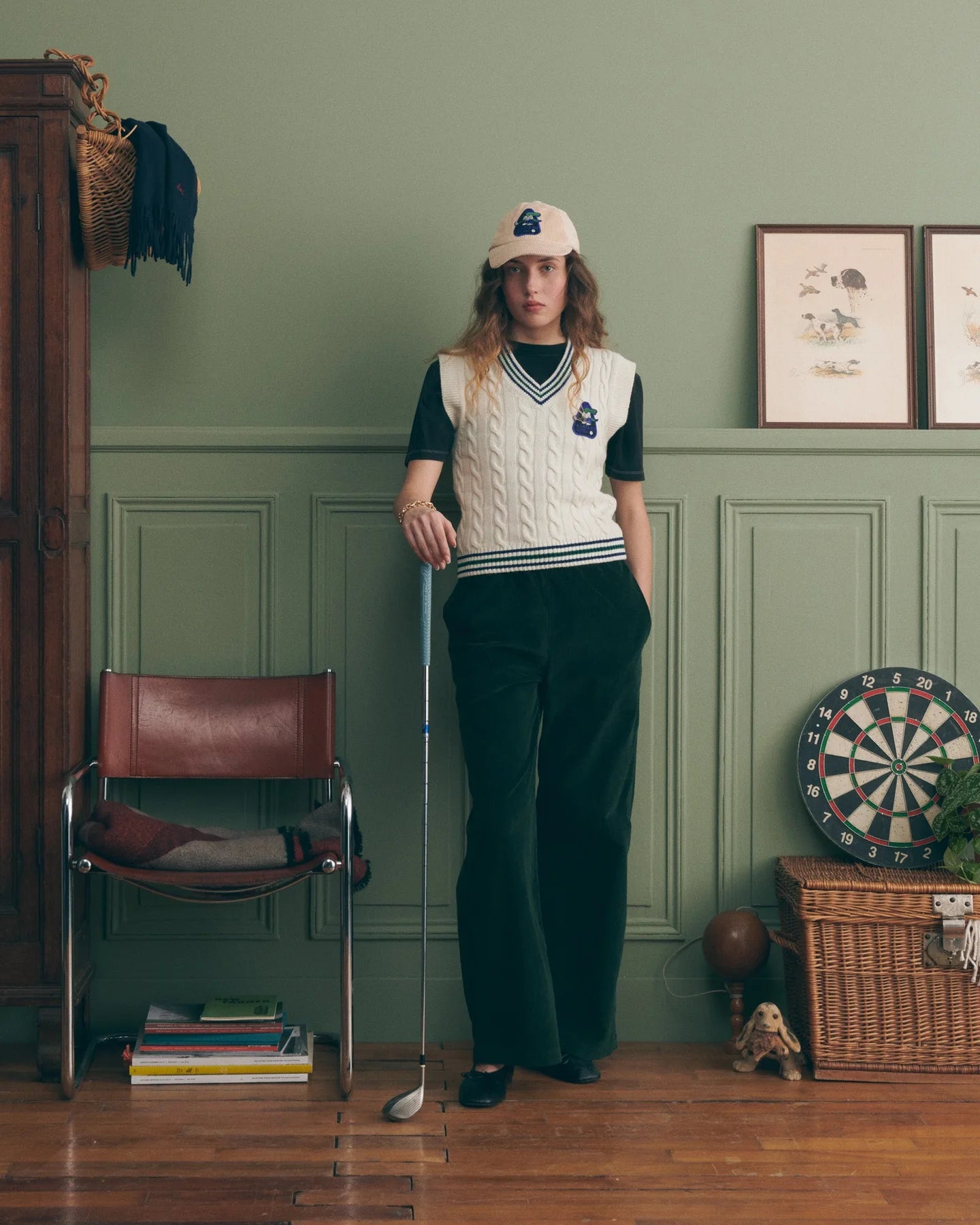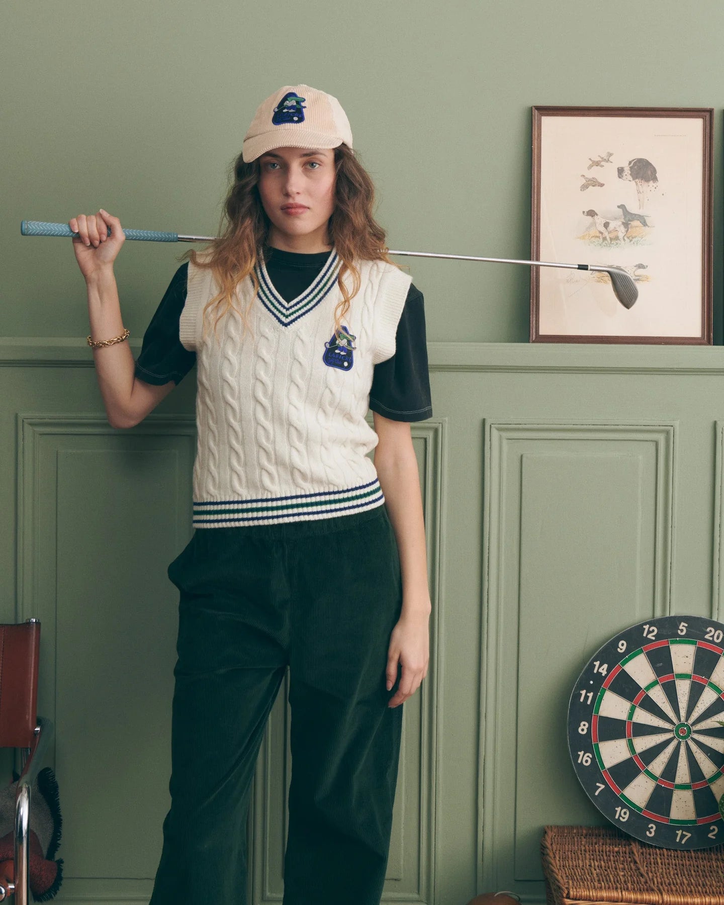 Our sleeveless Mithouard sweater has a fitted cut, a V neckline, and twists. Its embroidered patch is for those who swing with style.