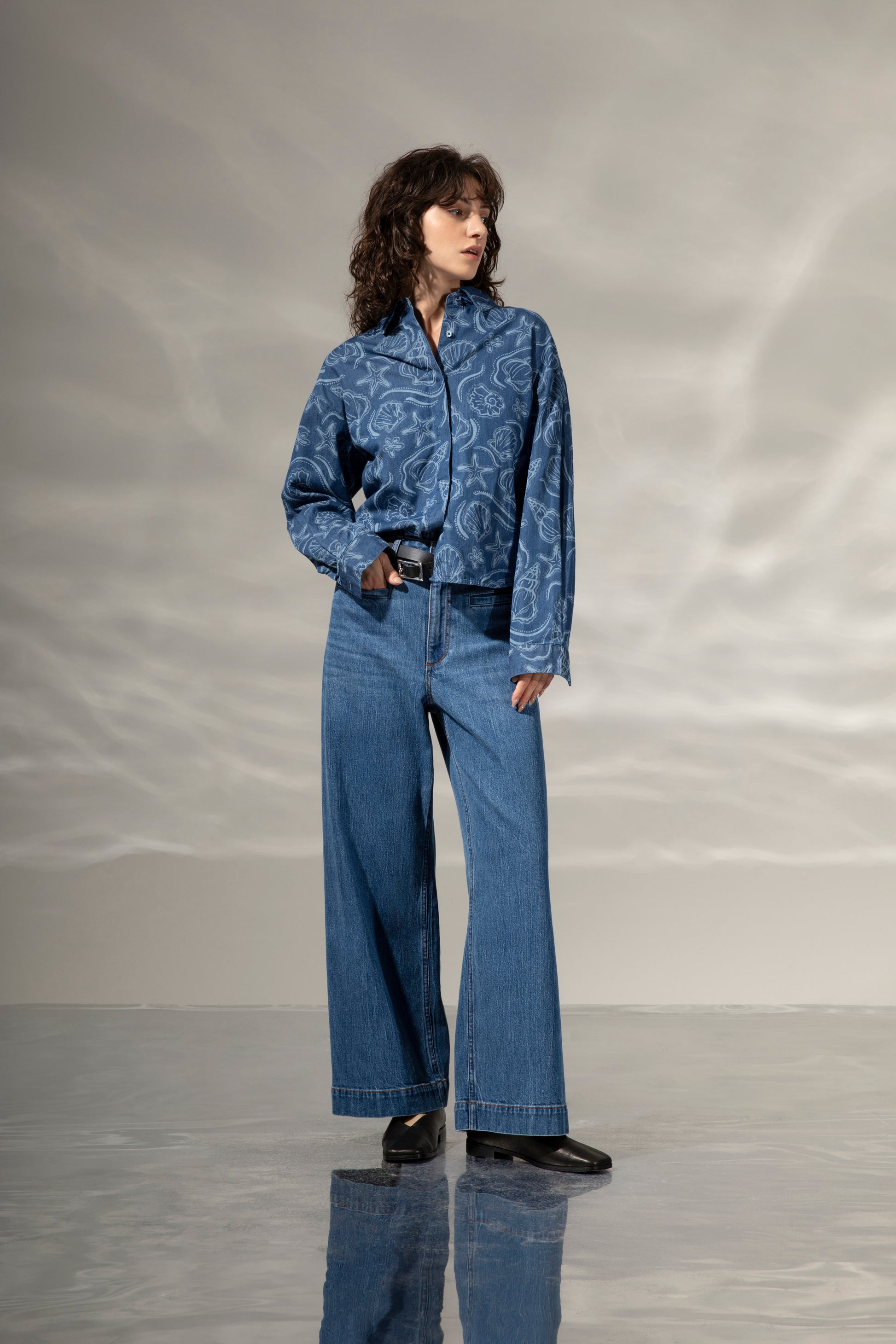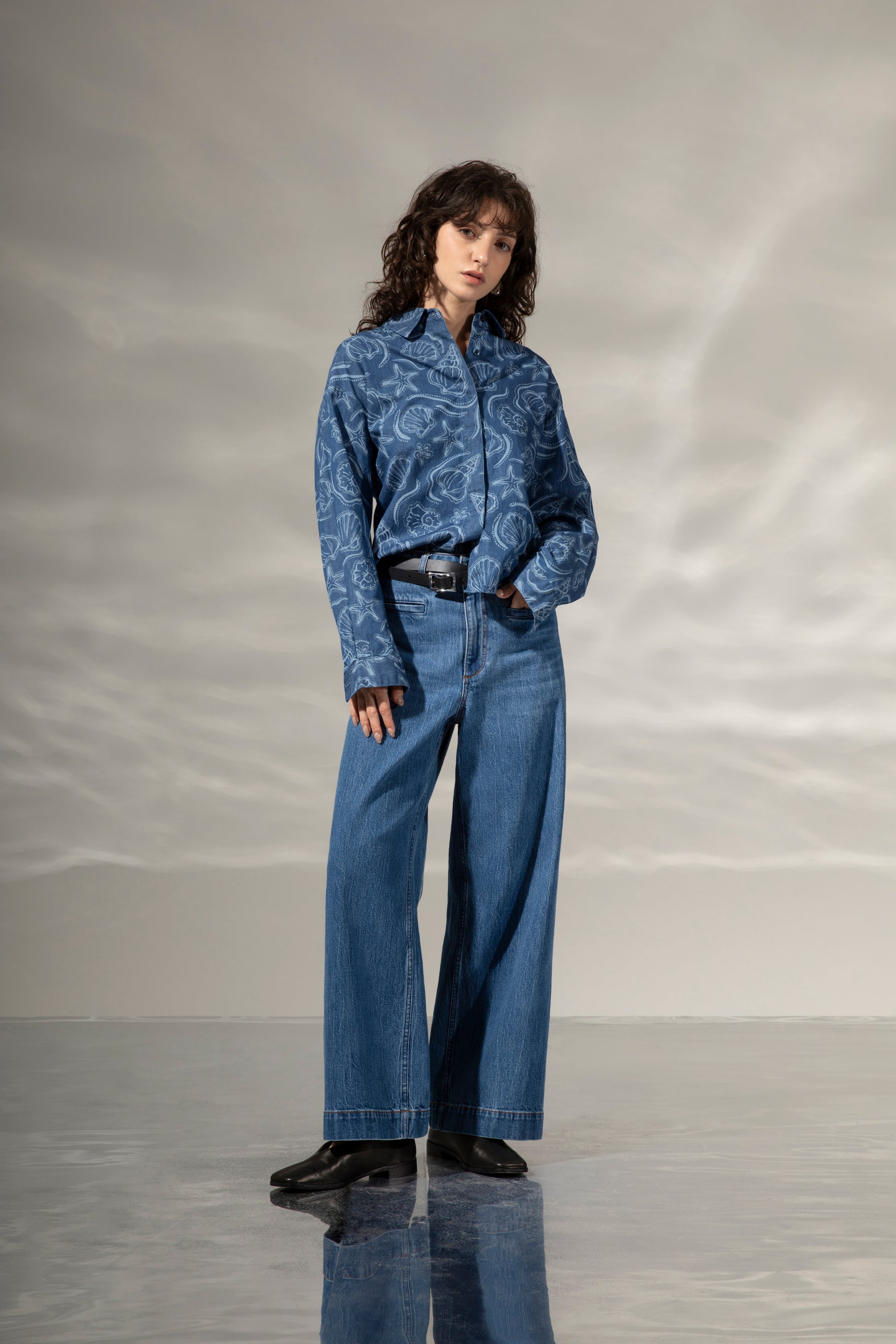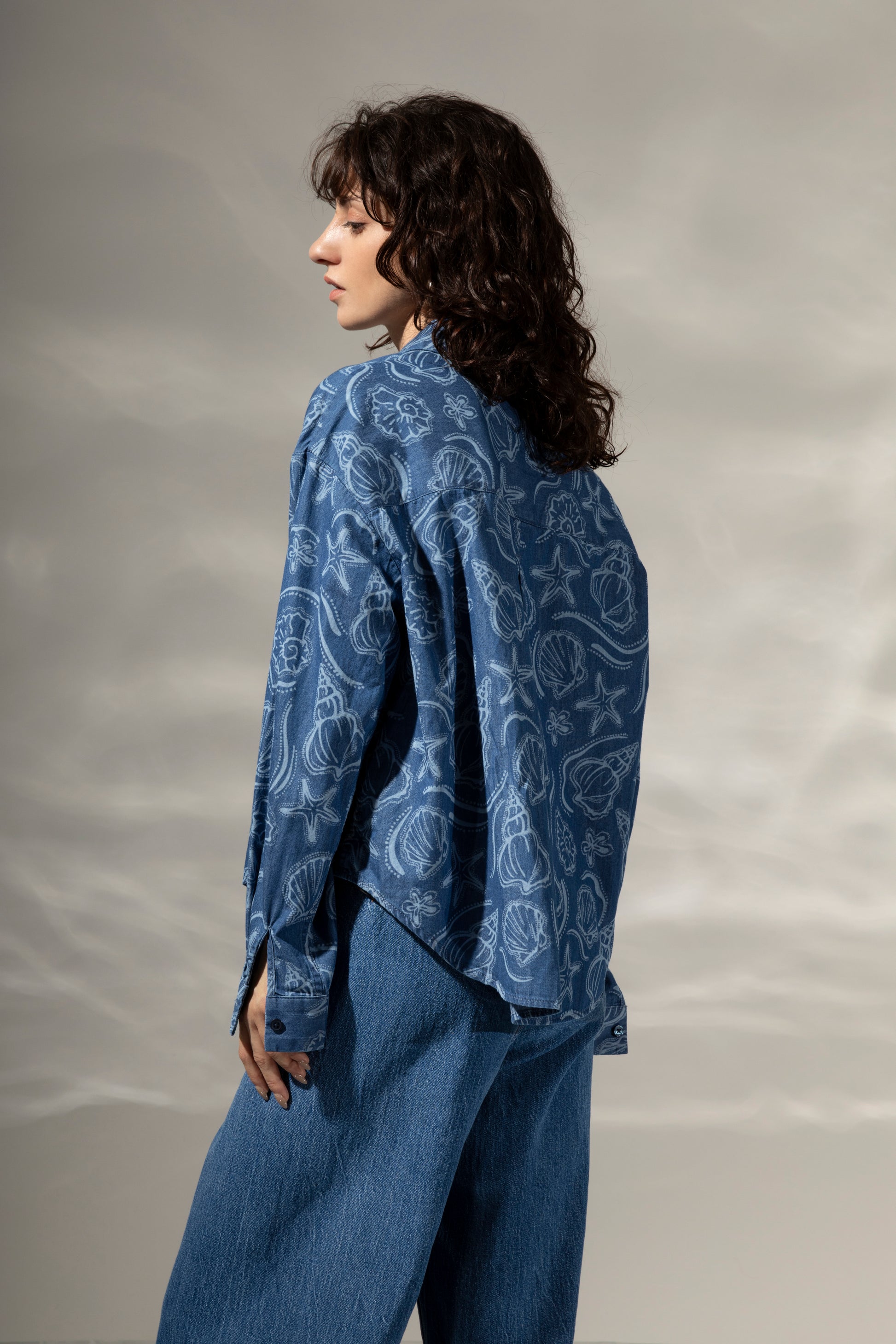 Introducing our Seashell Denim Shirt featuring our seasonal seashell pattern inspired by Oceans Bloom. The striking coastal denim shirt has long sleeves with a classic collar and concealed placket, giving it a modern silhouette. Wear on its own or layer as an overshirt. A playful and elegant piece to bring contemporary style to everyday wear.
