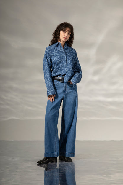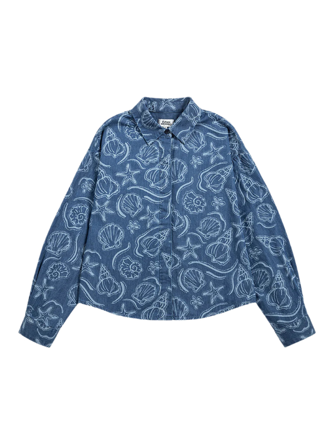 This shirt by Future Classics is made from denim fabric with a subtle seashell design.
