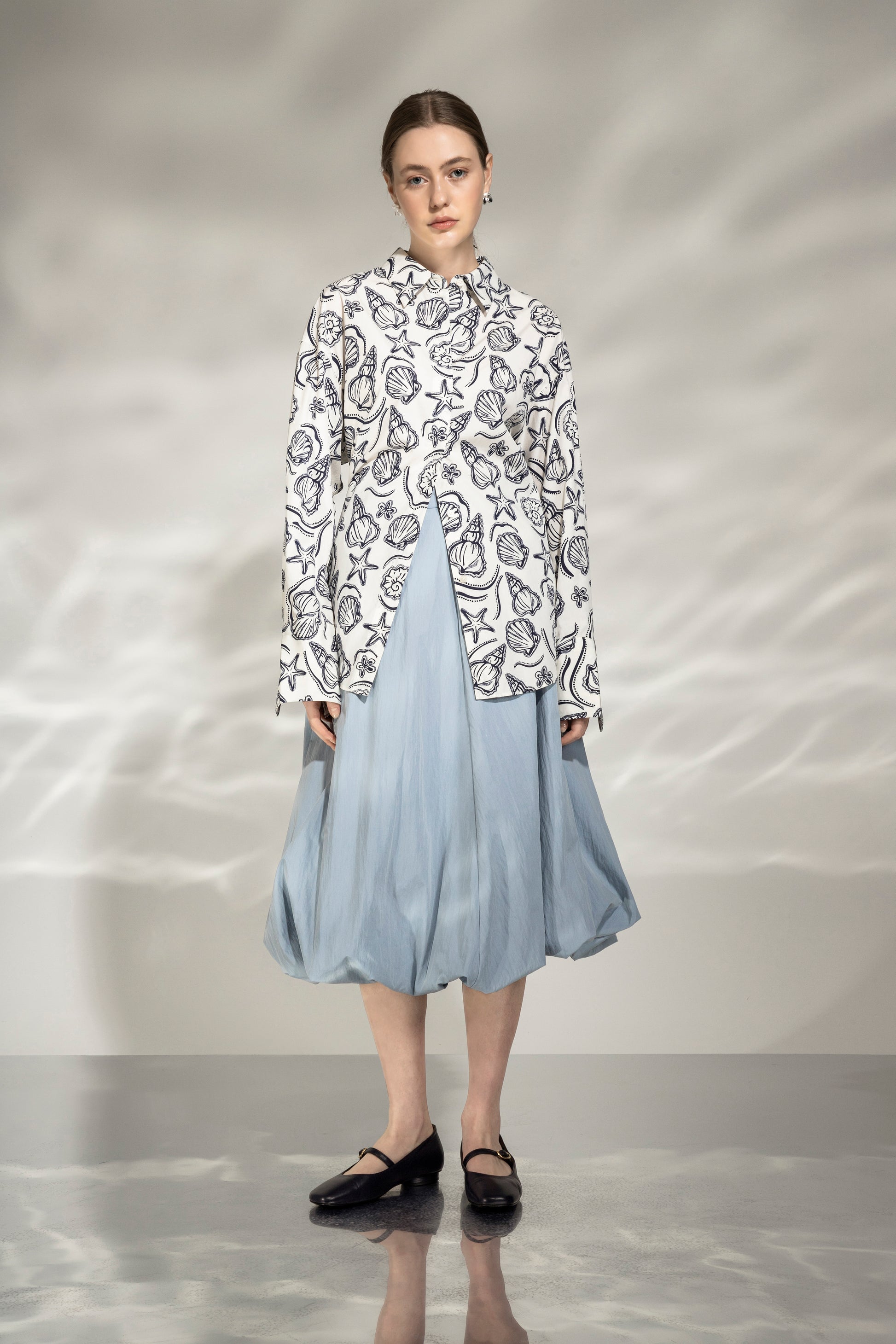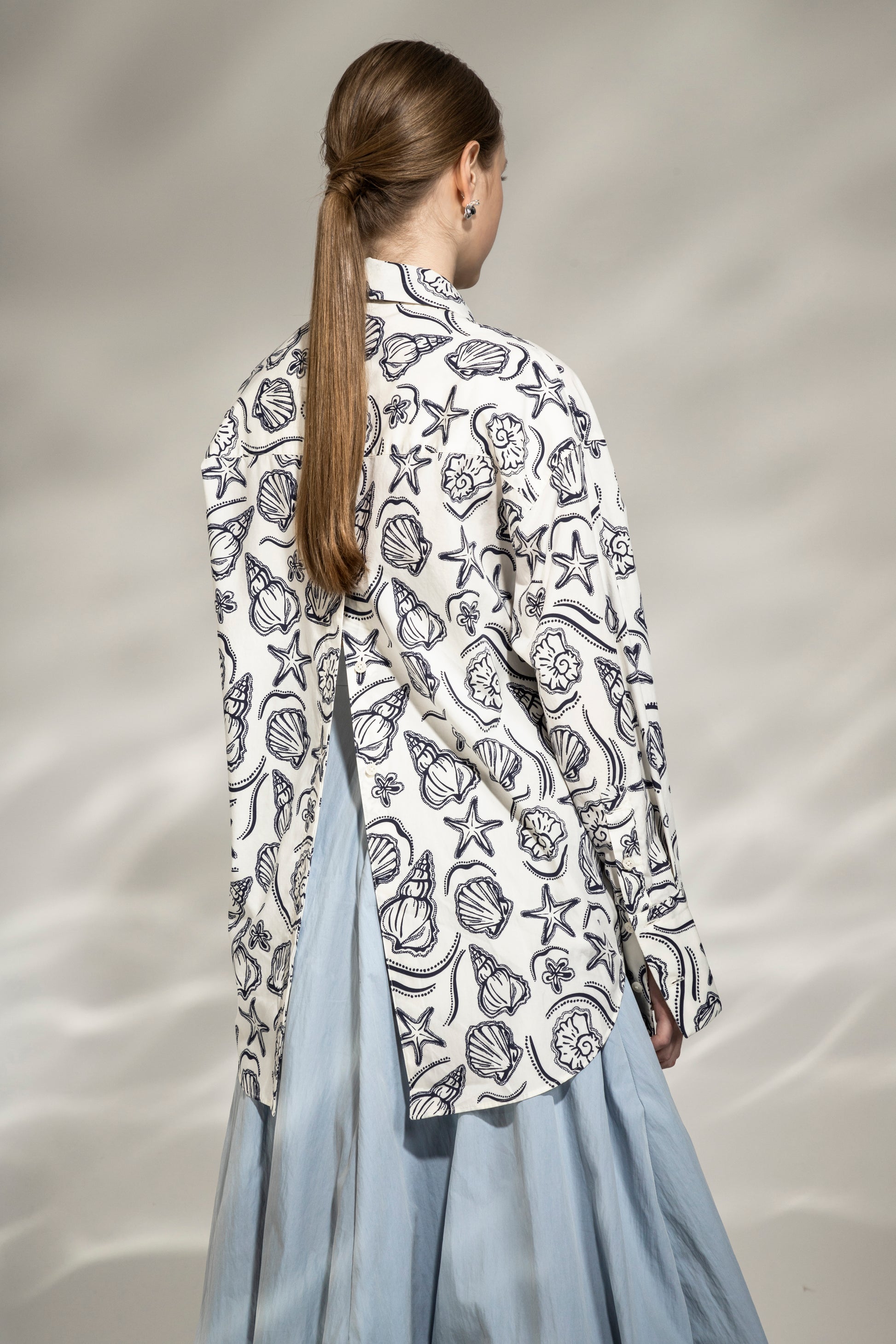Our best seller Back Slit Shirt is back this season in Oceans Bloom inspired all-over print. The oversized fit is designed with a hidden button placket on the back slit. An office essential to those who seek to infuse a coastal vibe into their workspace this season.
