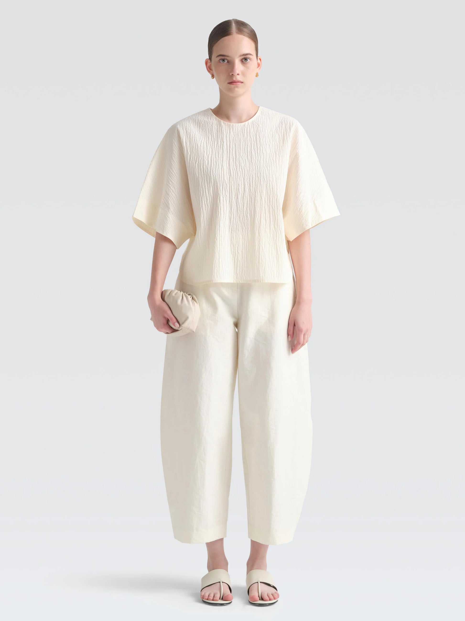 A minimal cotton seersucker top with a relaxed fit and subtle texture, cut slightly cropped for effortless layering. Style over tailored shorts or sleek trousers for a polished, modern look.