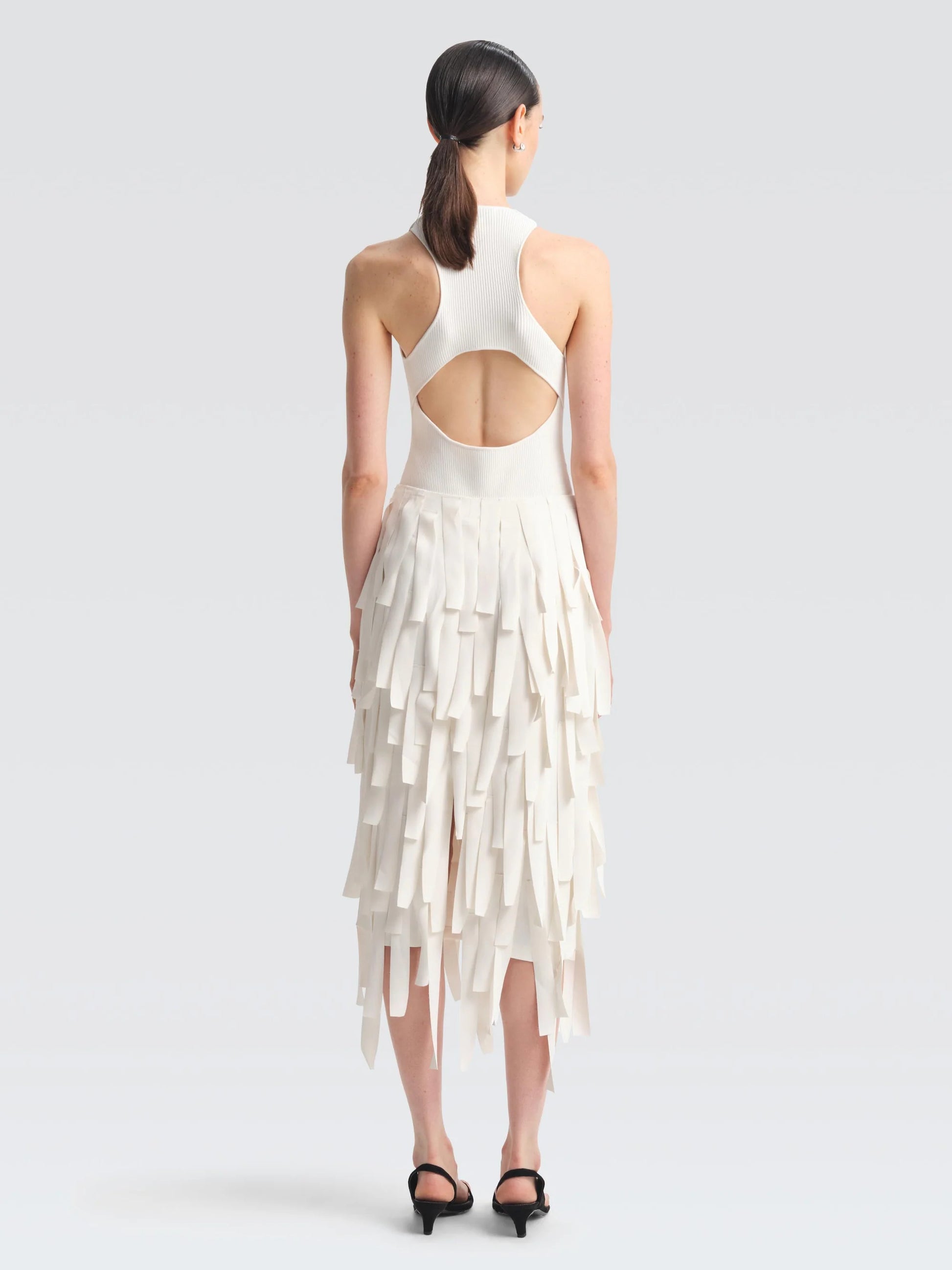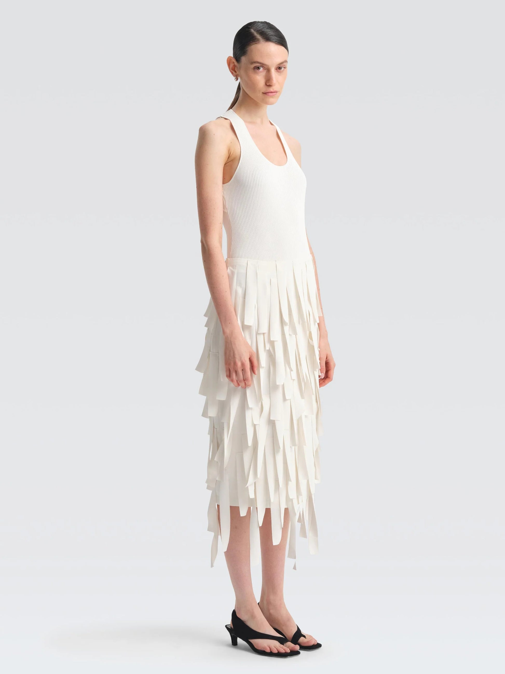 A key style from our runway collection, this triacetate piece is crafted with layered, laser-cut rectangles that create a fringed effect, fluttering beautifully with every movement. Falling just below the knee, it pairs effortlessly with a simple tank to keep the detail in focus.