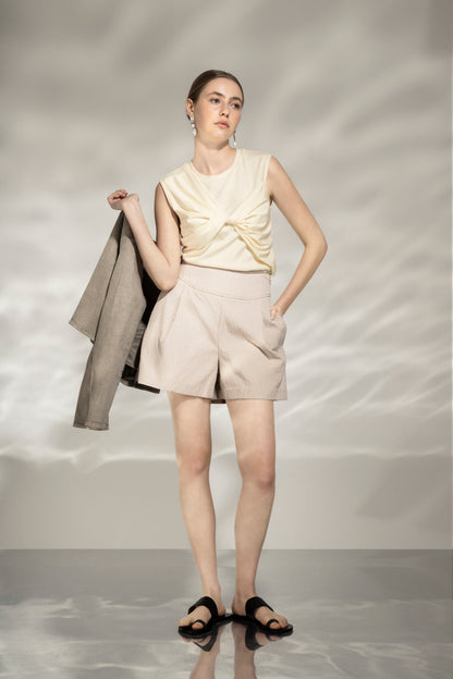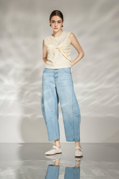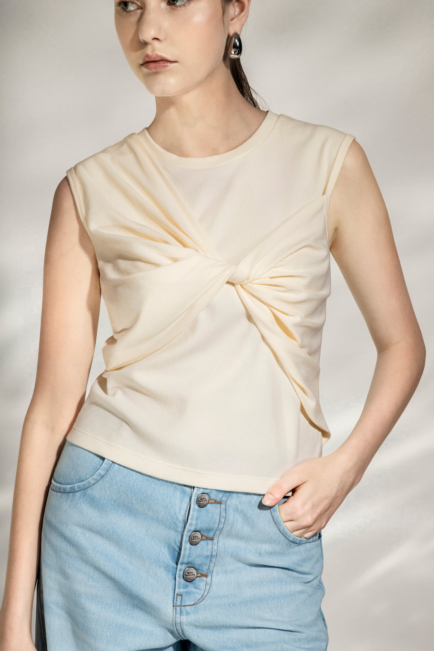 Our Twist Tank Top is a soft and chic top that is slim fitted to highlight your features. An added unique twist layer runs across from shoulder to chest. A casual tank top perfect to pair with our Bleached 3D Barrel Jeans.