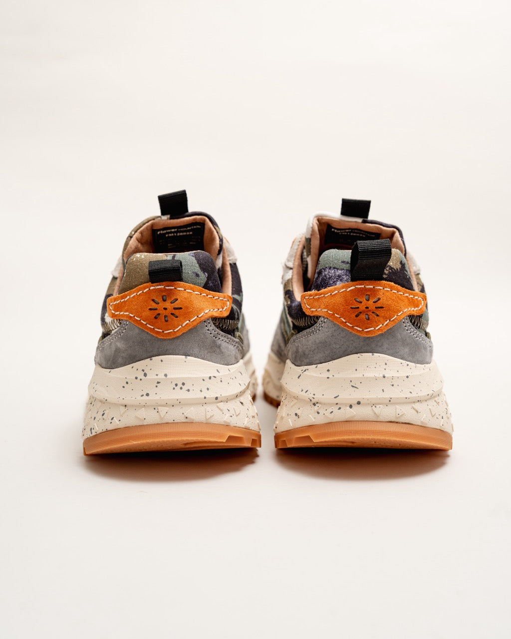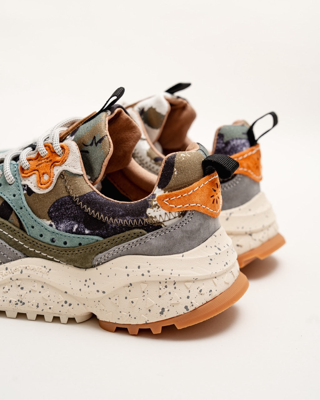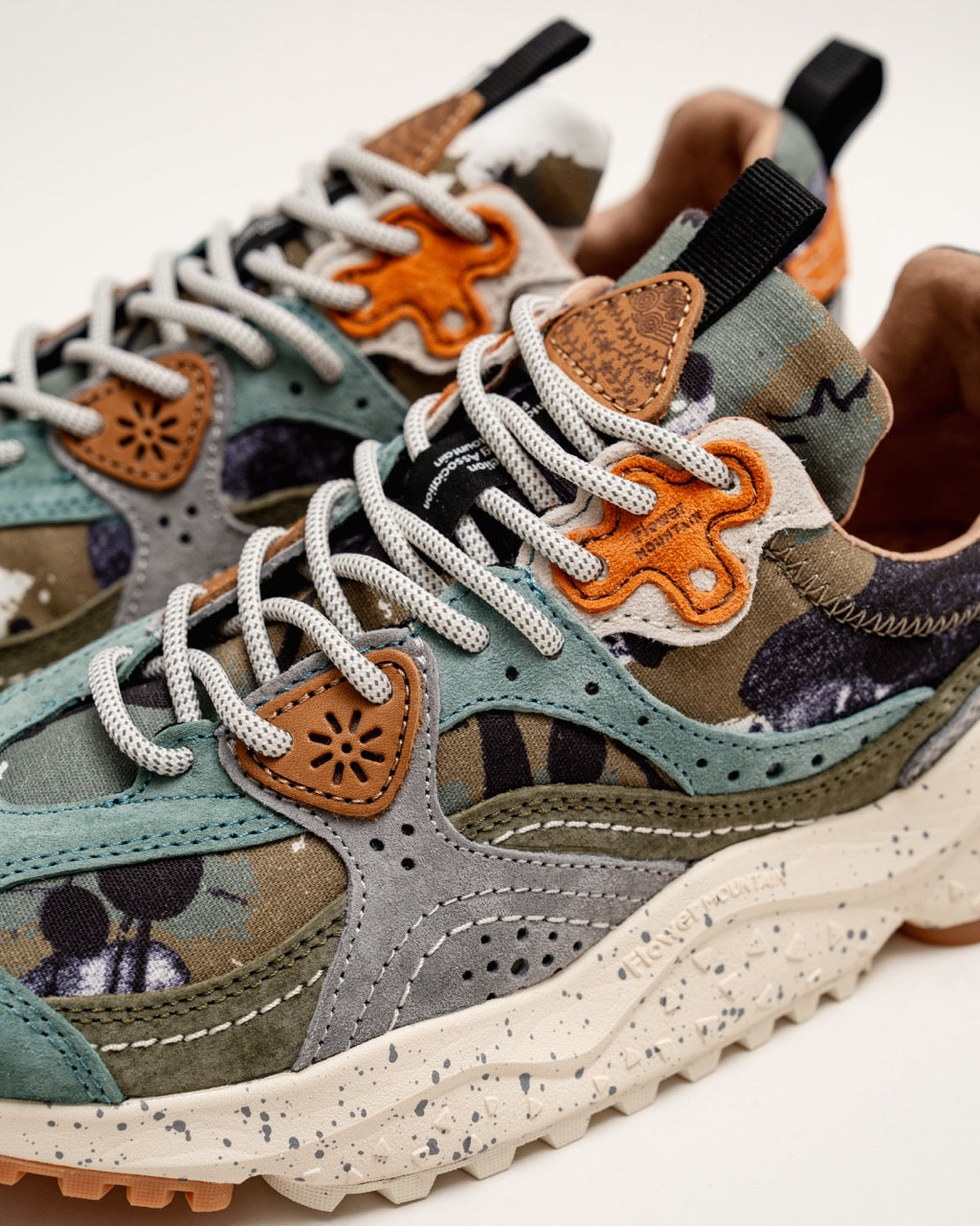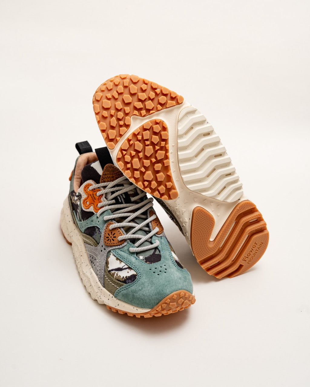 Sporty sneakers with upper in brushed suede with a two-tone effect, completed by inserts worked with the overlapping technique. The closure is made with trekking laces and eyelets in the iconic flower shape. Inner lining in leather and fabric, natural antibacterial cork insole. Ultra-lightweight rubber sole with two-tone tread.
