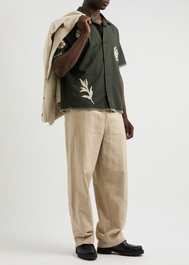 Constructed from a cotton-linen blend in Black and adorned with applique designs in Beige. It is cut for a relaxed fit with a new straight hem.