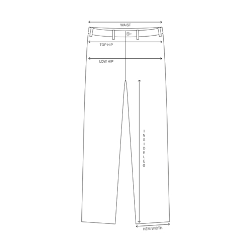 | Size | Inside Leg | Waist | Top Hip | Low Hip | Hem Width |
