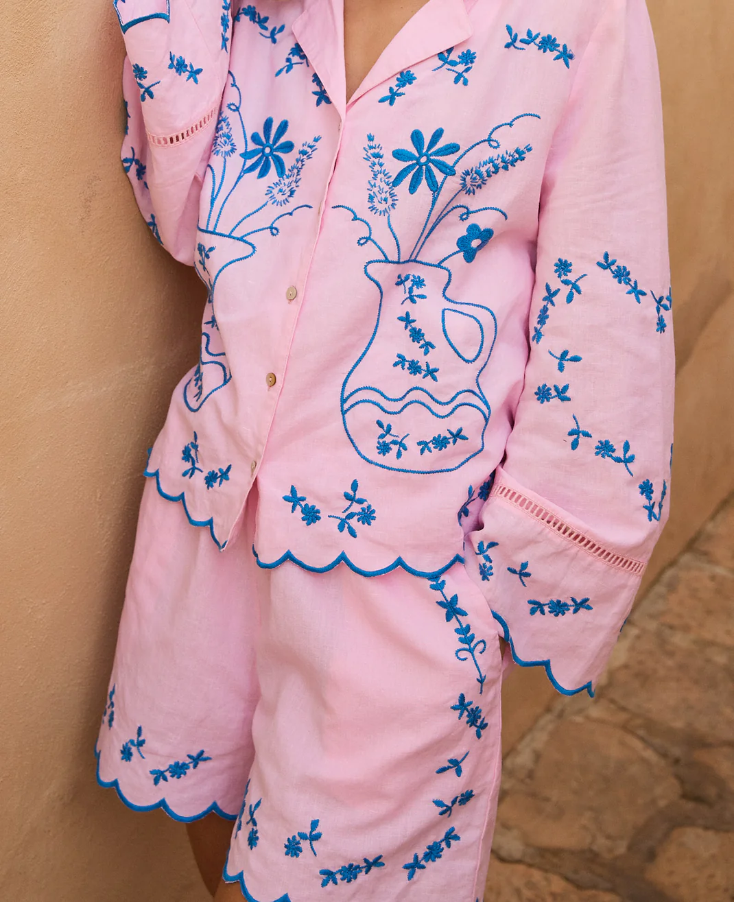 Belma Shorts have a loose and relaxed fit and are made in a mix of organic cotton and linen. They feature an elasticated waistband that enhances the comfortable fit and have pockets in the side seams. The shorts are decorated with poetic floral embroidery in a contrasting color and have elegant, embroidered scalloped edges, adding a decorative detail.