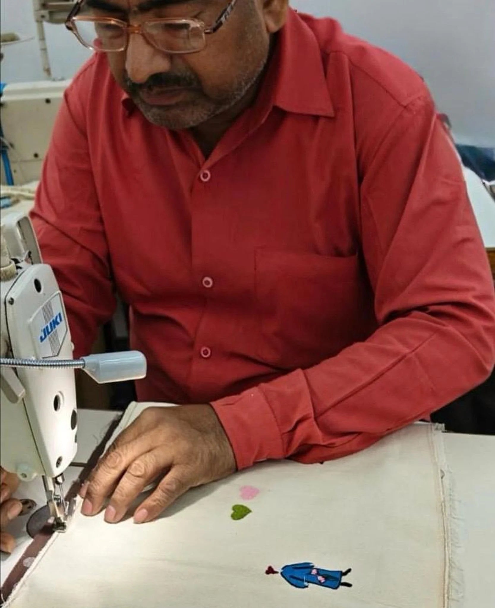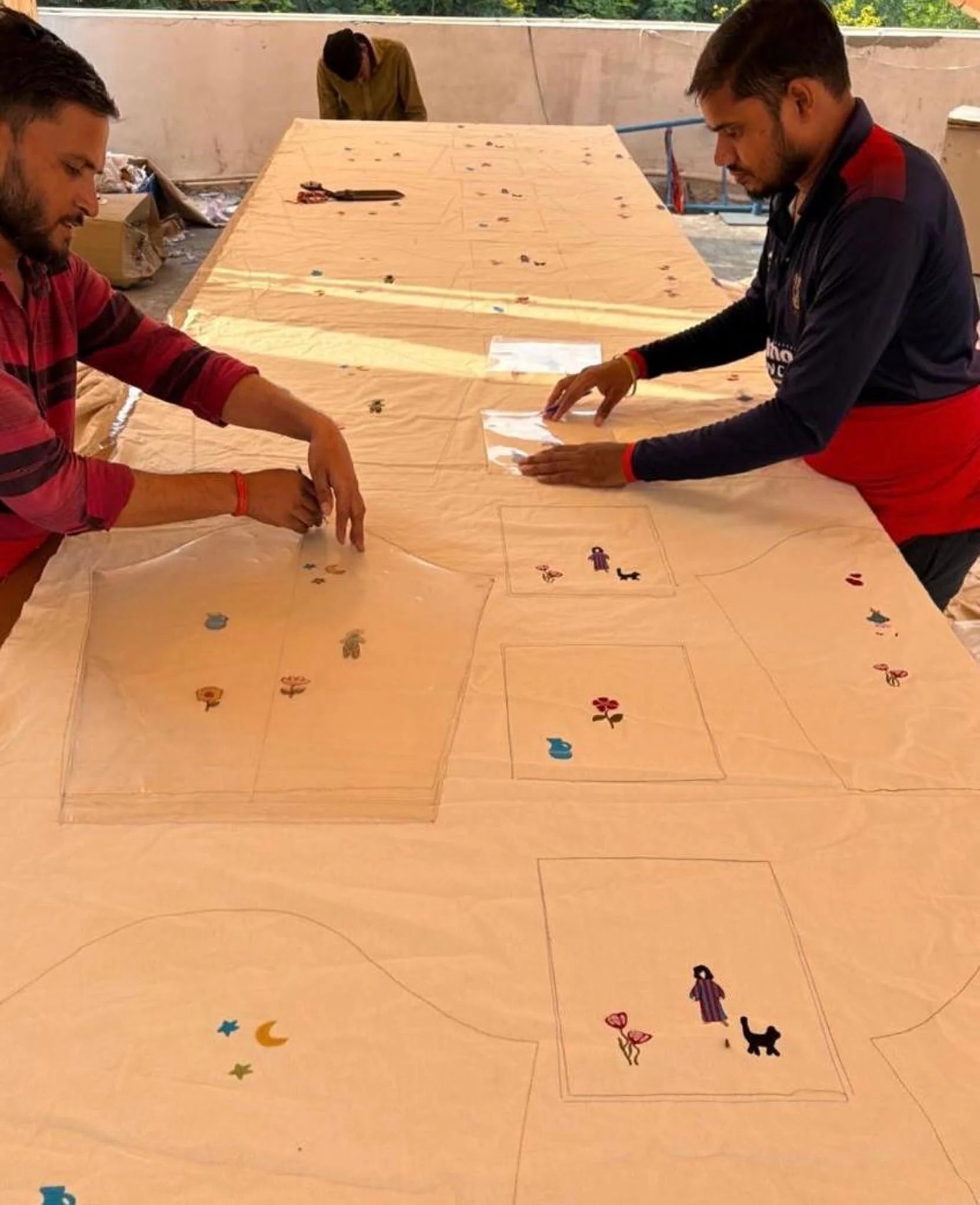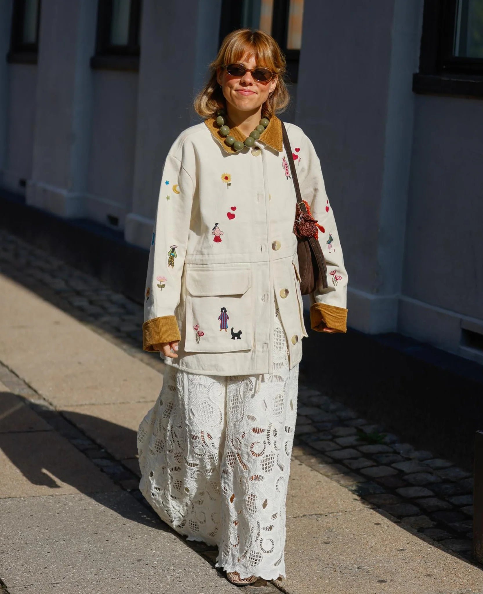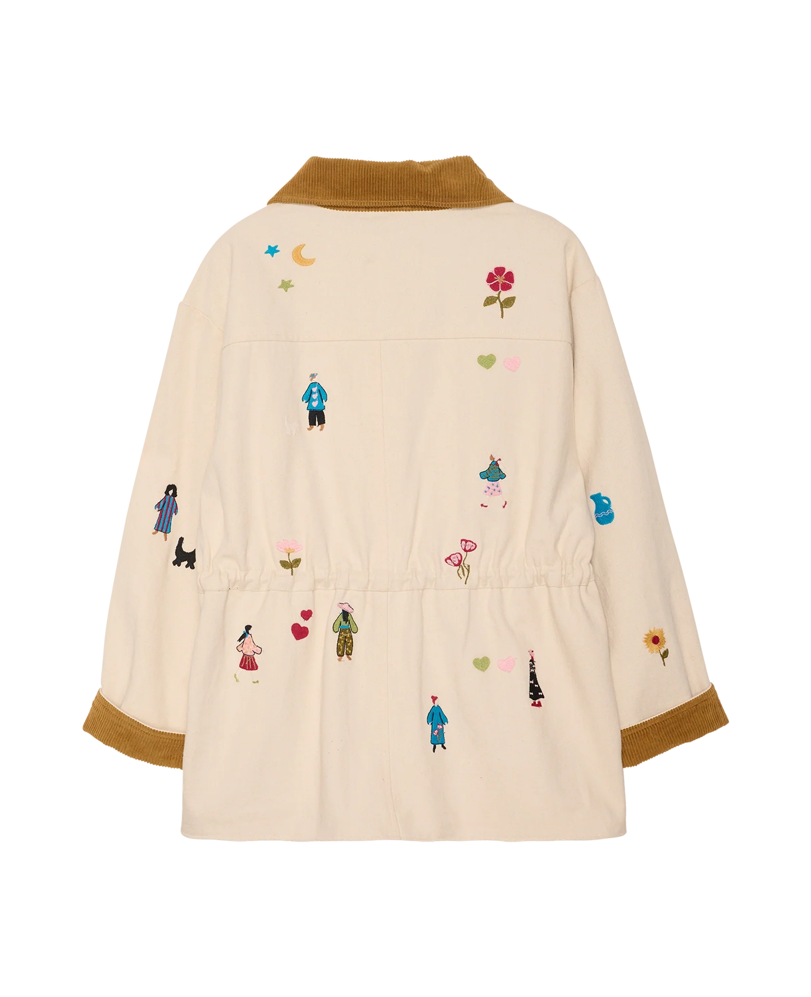 Cara Jacket has a loose fit with dropped shoulders and is made in 100% organic cotton twill. The collar and the inside of the sleeve bottoms are lined with leftover corduroy in a contrasting dark color, visible when the sleeves are turned up. It features two large utility pockets with flaps, lined with leftover corduroy, and a drawstring at the waist for an adjustable fit. The jacket is lined with leftover cotton featuring a dot print. Delicate embroidered motifs are spread across the jacket, telling a vibrant tale full of joy and life.