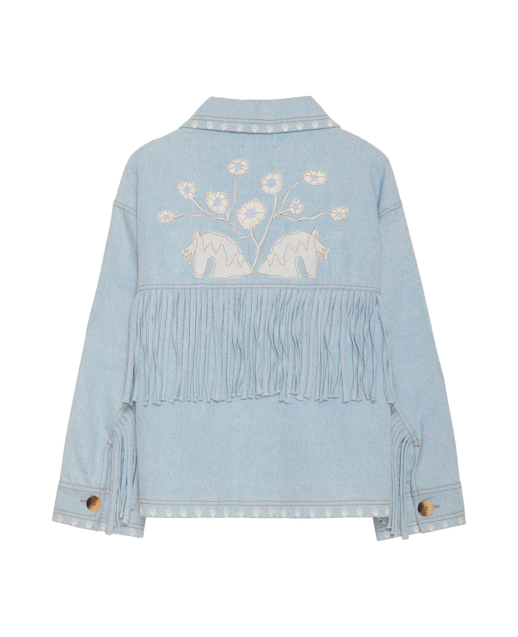 Christer Jacket is made of leftover denim in an oversized fit. It features shaped sleeves, a big collar and two front pockets. Fringes in matching fabric run along the back yoke and sleeve seams, adding a playful touch. The body of the jacket is lined with striped leftover cotton for a finished look. It is detailed with doubled top stitches and a poetic embroidery artwork, delicately decorated with beads.