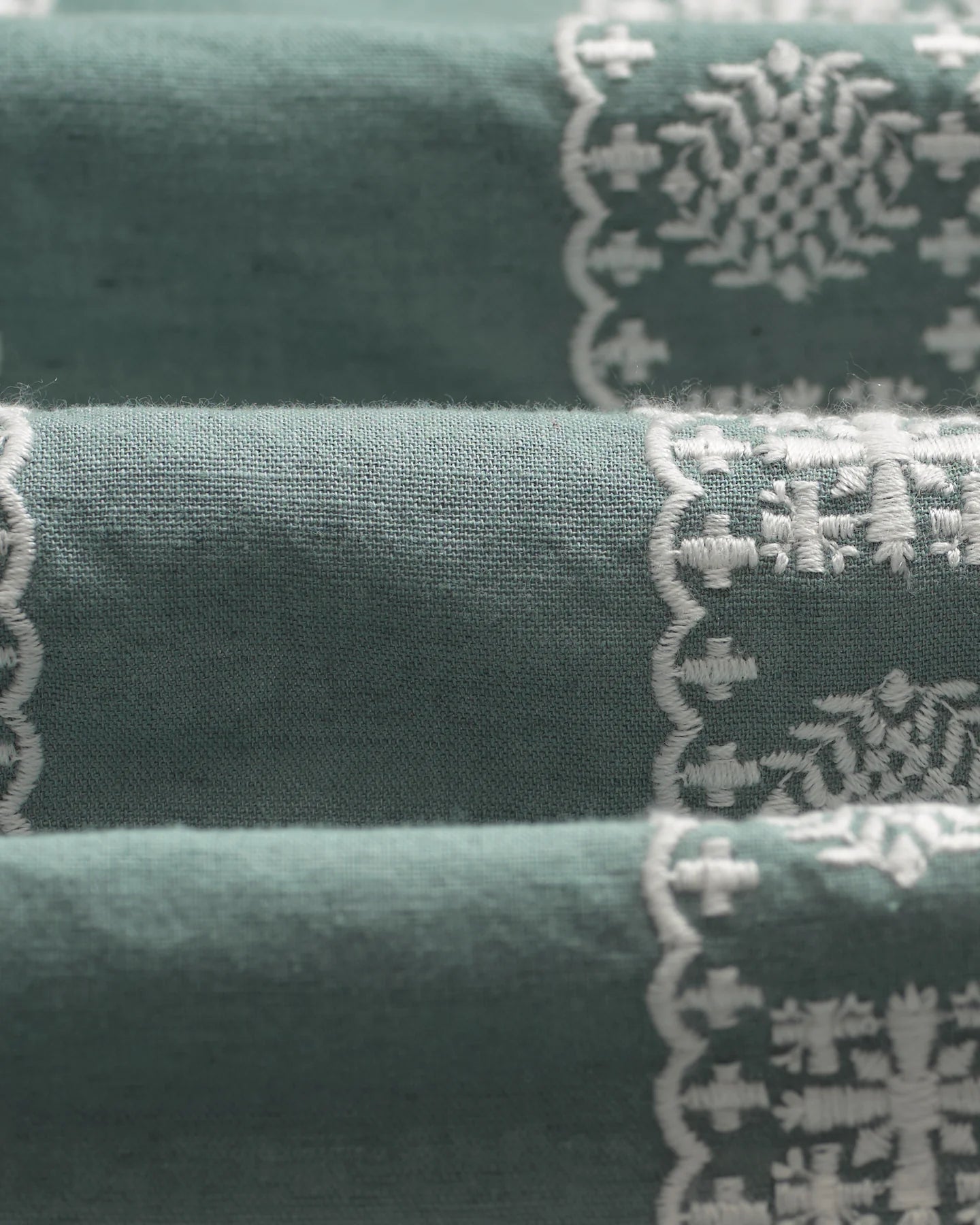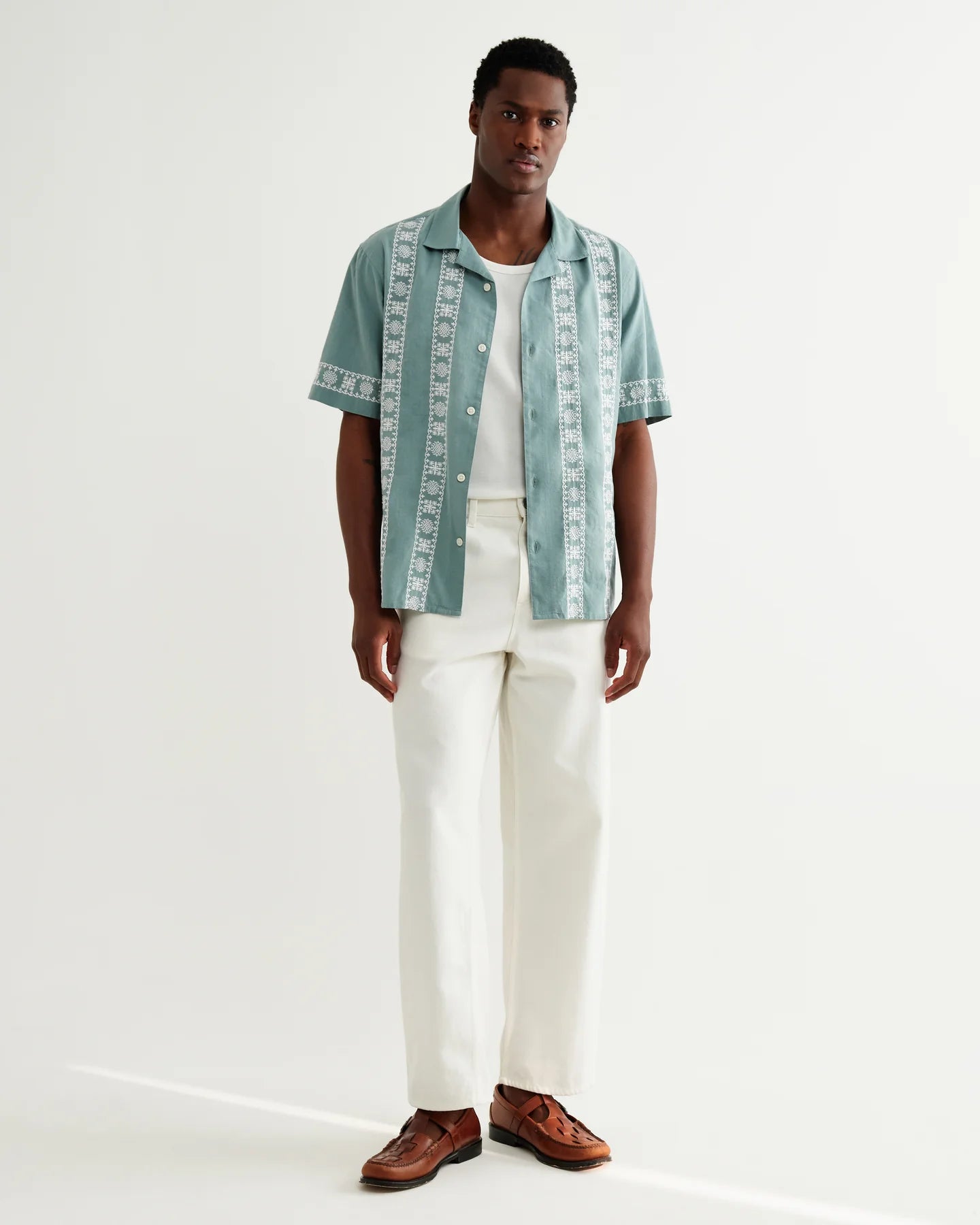 The Didcot returns in a softly washed cotton-linen blend for lightweight, breathable comfort. Set on a sea green base, an ecru embroidered design forms a stripe down the front panels and sleeves, adding subtle structure and considered detail to the shape.