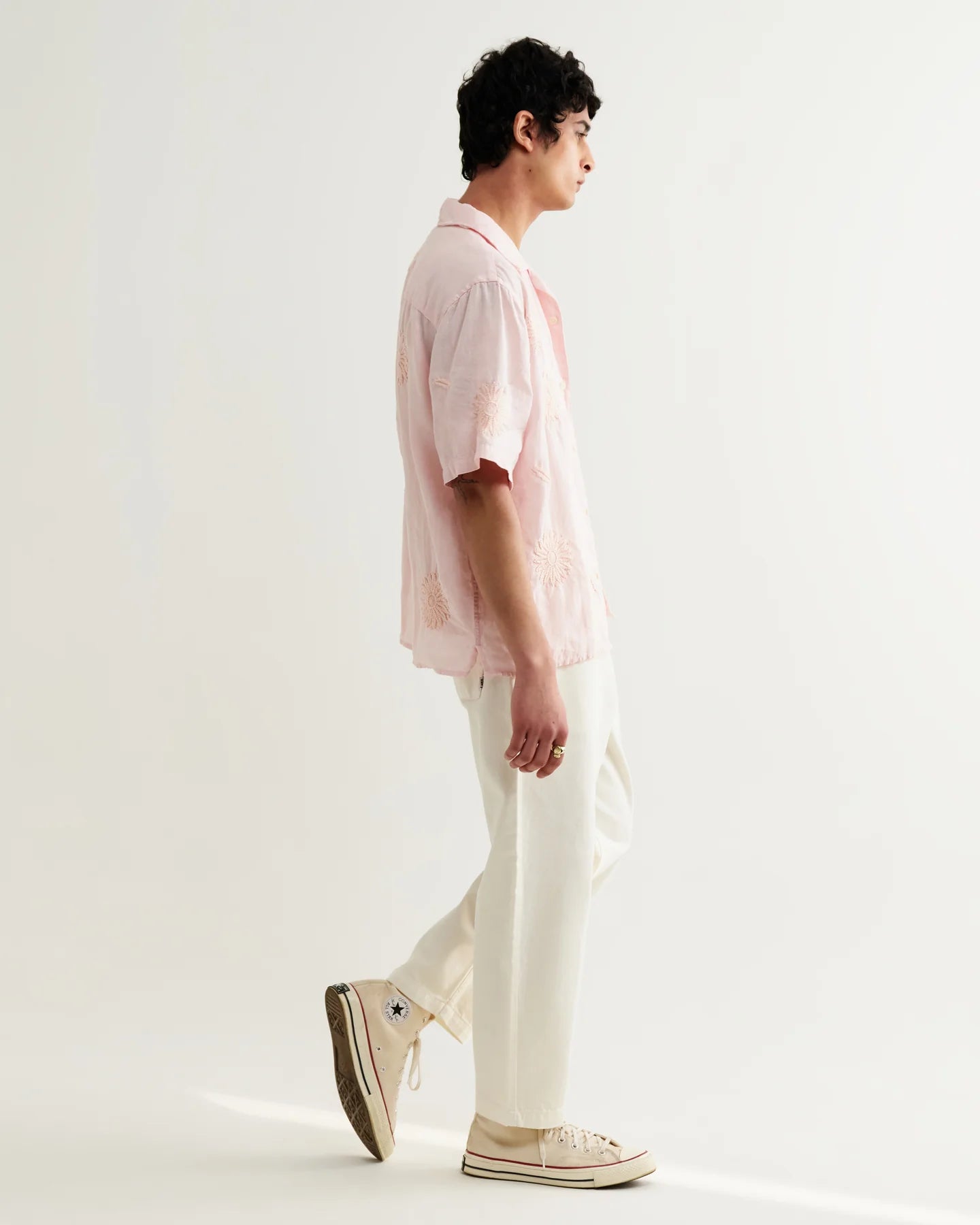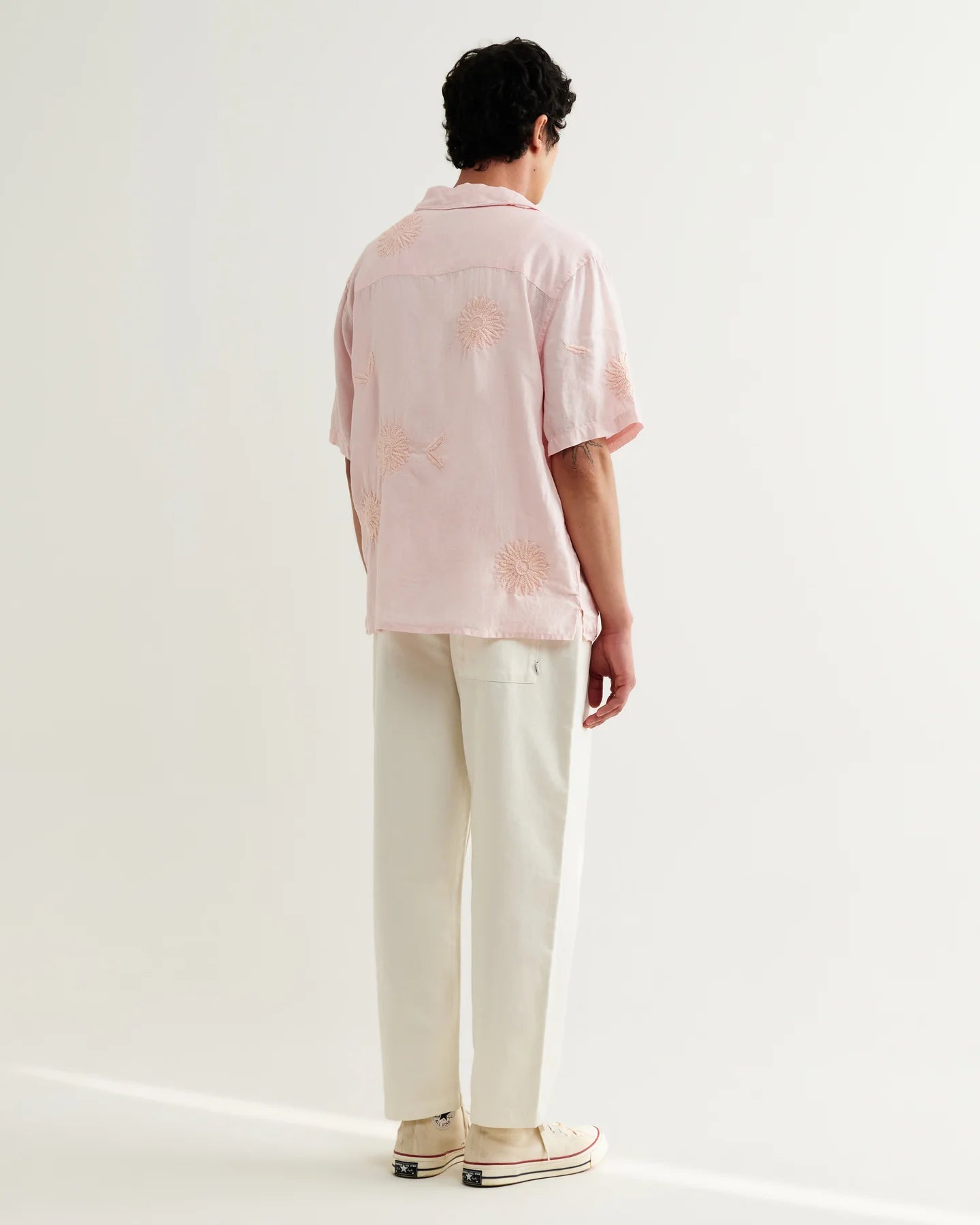 The Didcot returns in a lightweight pink 100% linen base. Designed for warm-weather wear, it features tonal embroidered flowers inspired by our vintage fabric sourcing, adding subtle depth and texture to a clean seasonal staple.