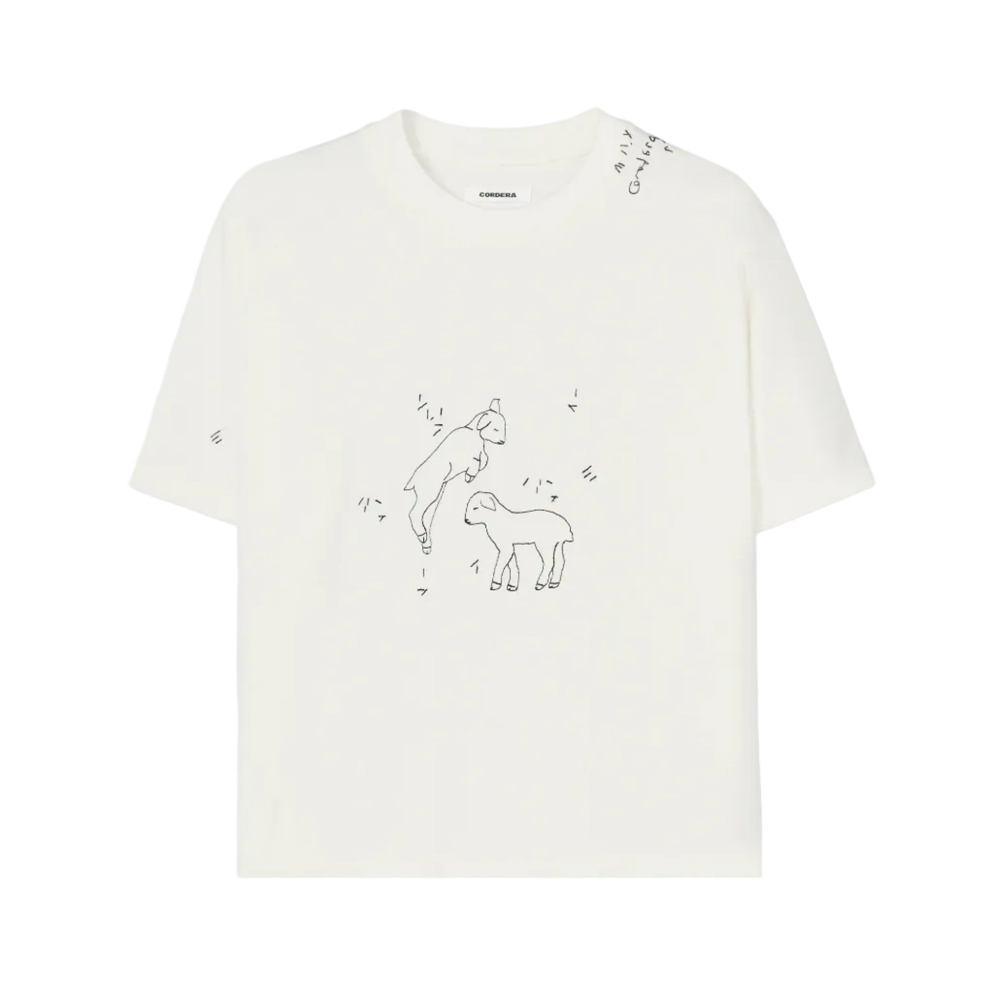 A classic t-shirt silhouette elevated with subtle embroidered details on the front, featuring two charming lamb motifs, and delicate accents on the sleeves. A signature design that reflects the brand’s identity and timeless aesthetic, crafted in crisp white for effortless styling.