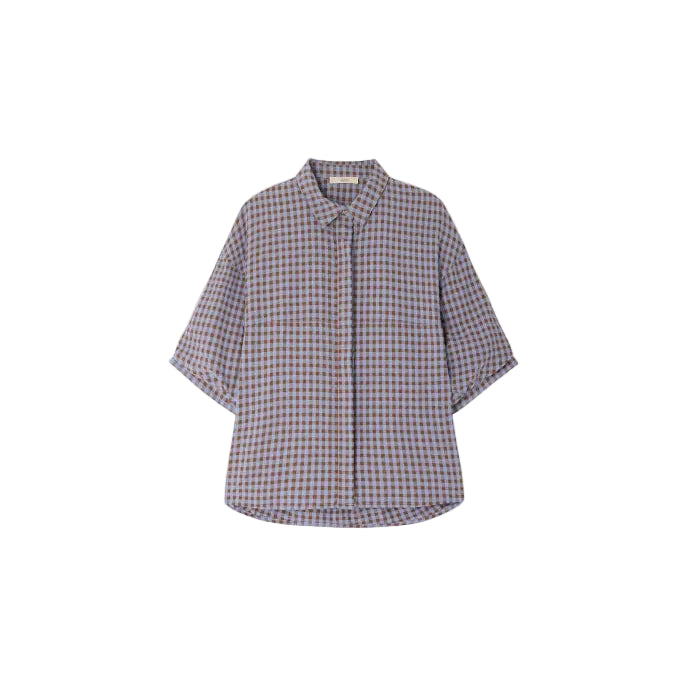 Blouse with short balloon sleeves, made from lightly textured cotton fabric with a two-toned gingham pattern, woven in Spain.