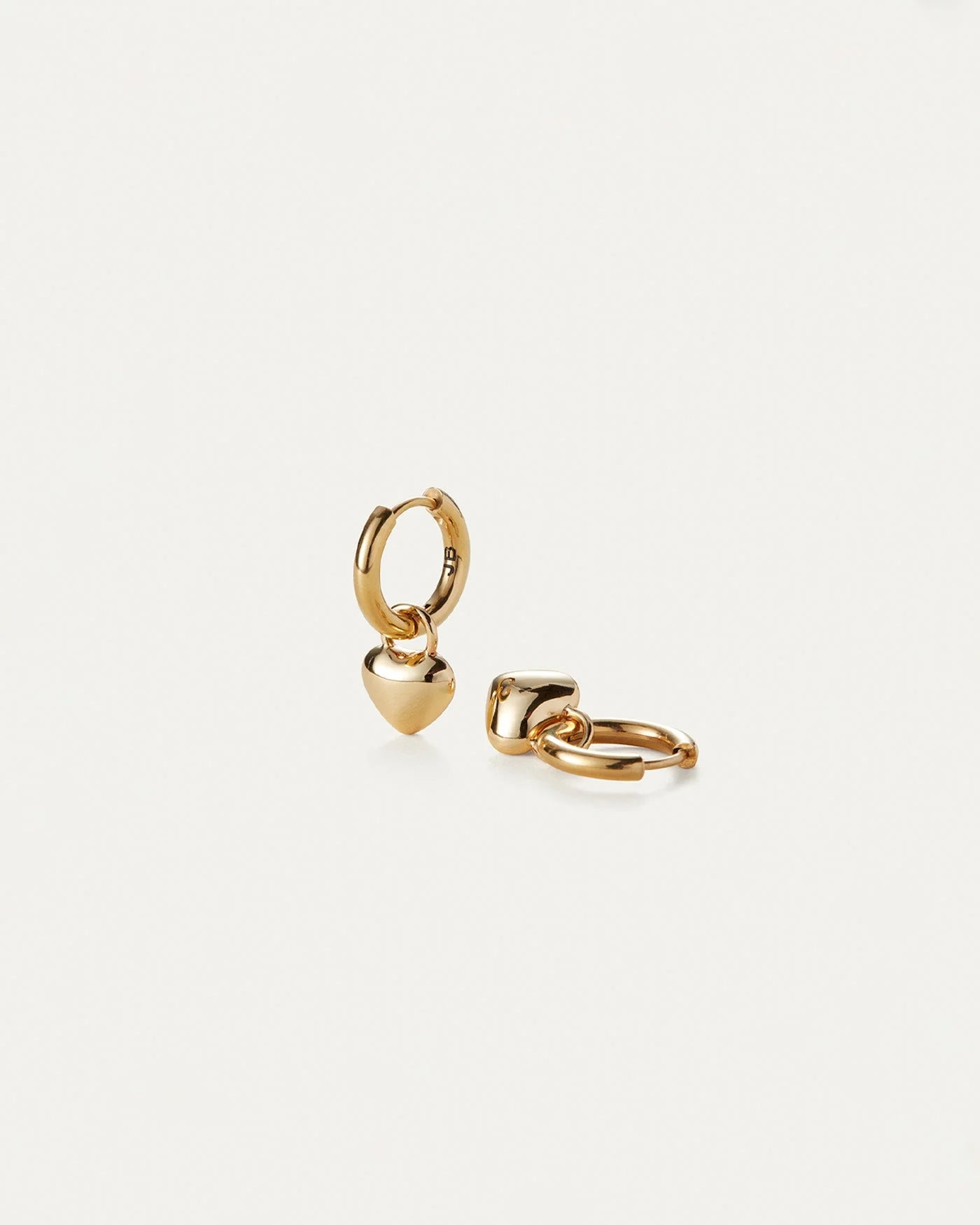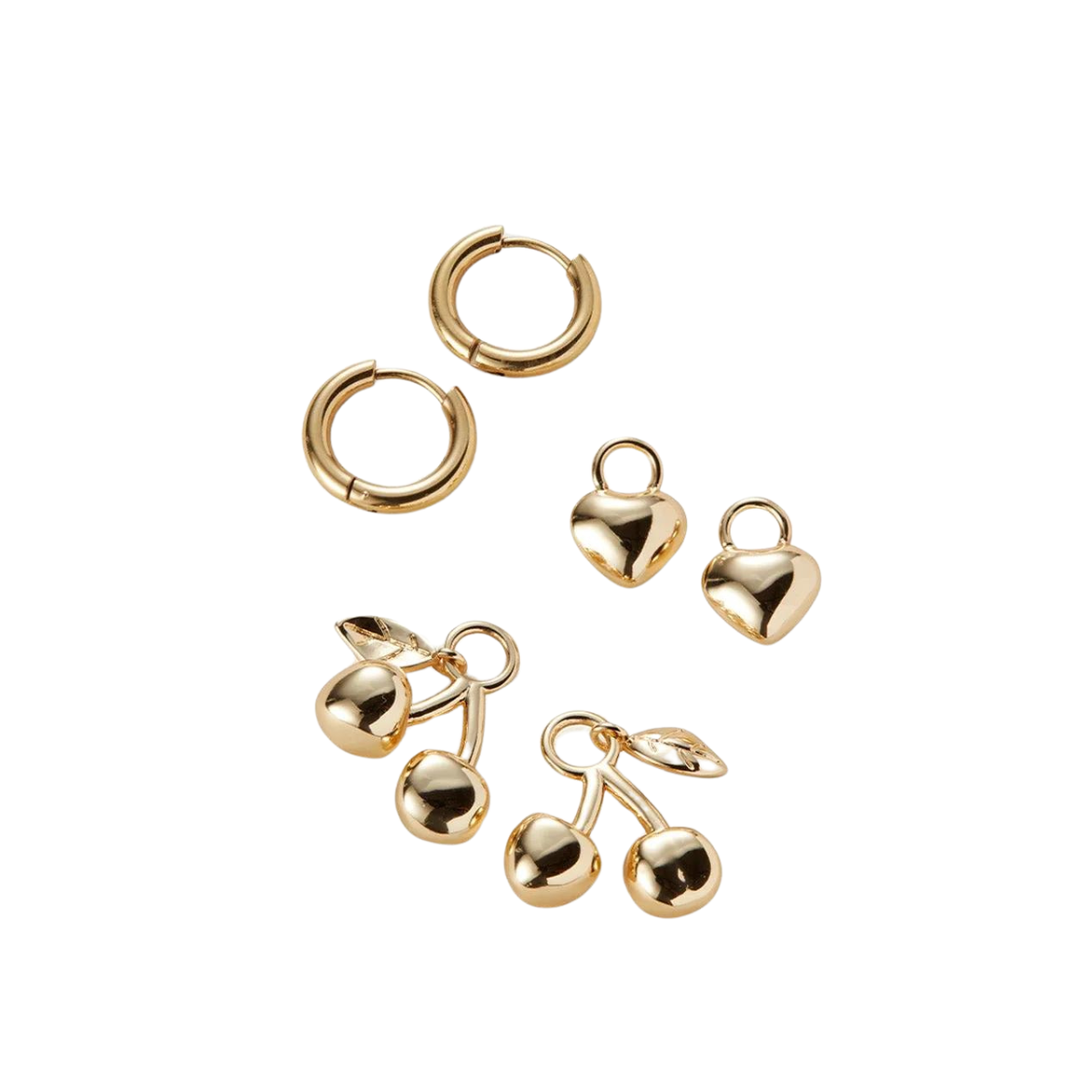 Play with the versatility of this earring kit by switching between Puffy Hearts and Cherry charms, which can be removed from a set of huggies. Remove charms for a set of water-durable, stainless steel huggies. Finished in high-polish gold.