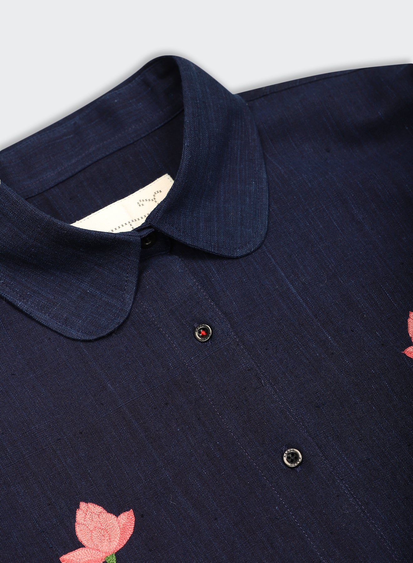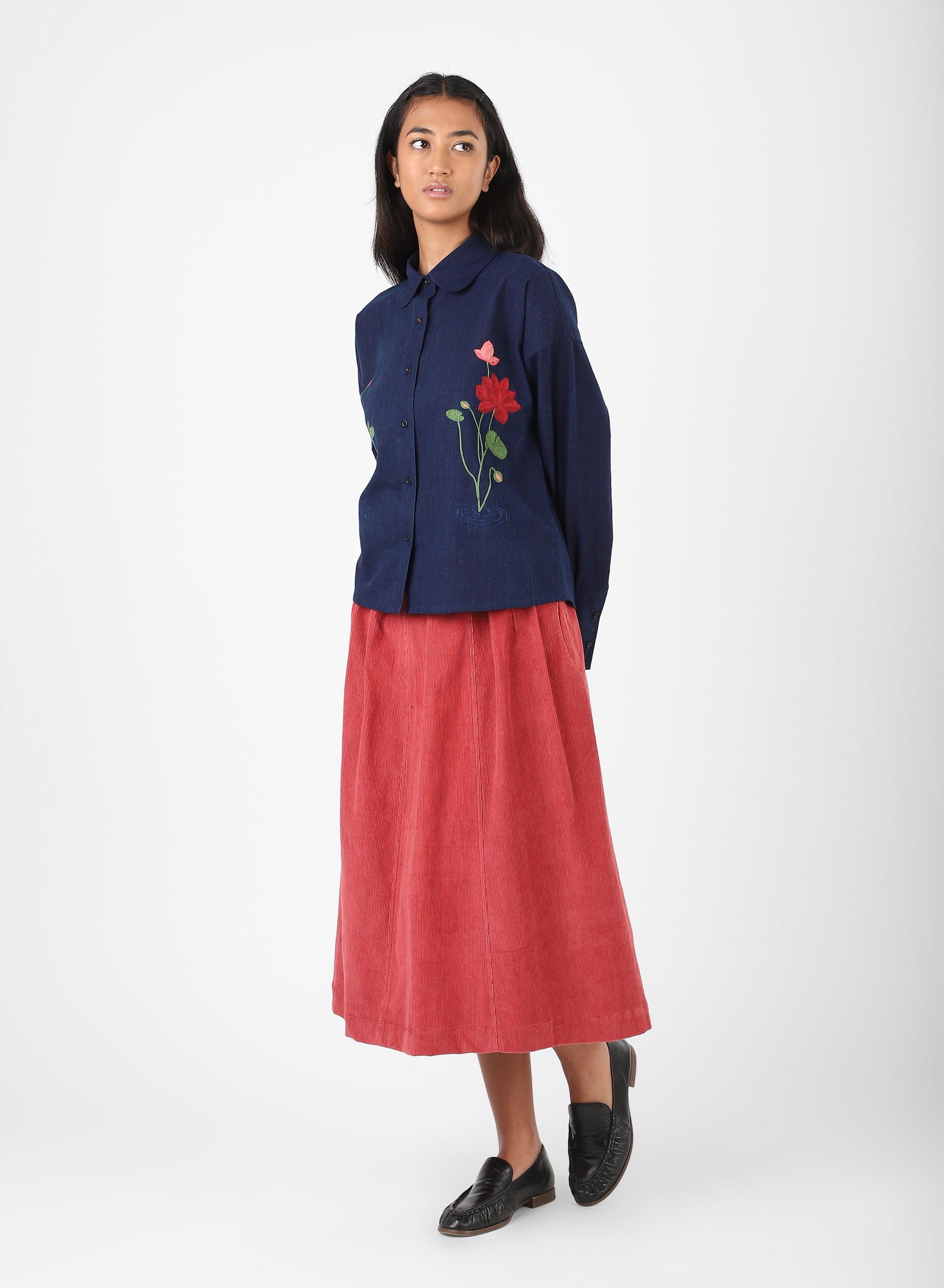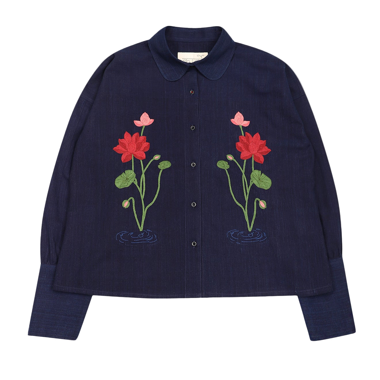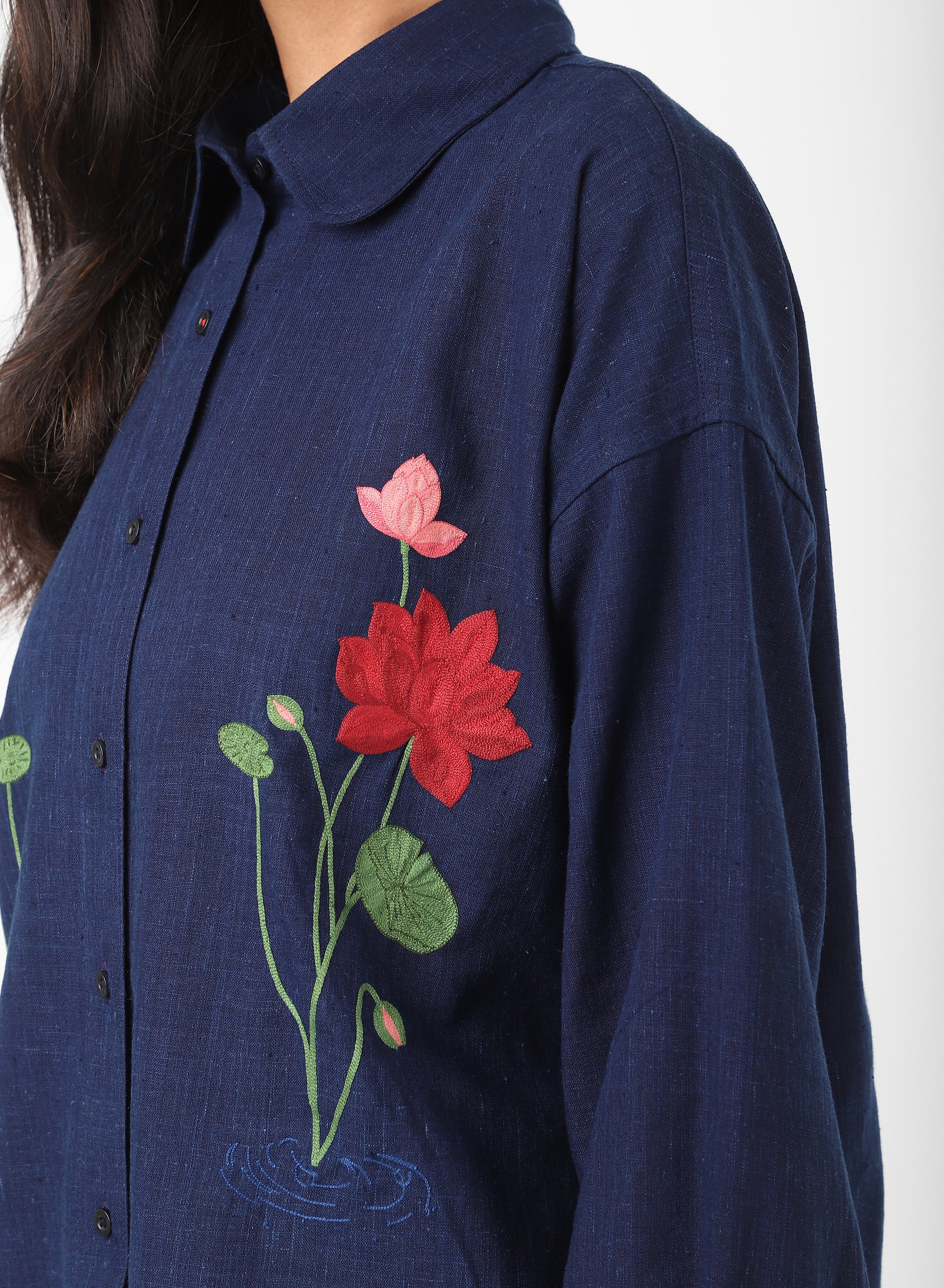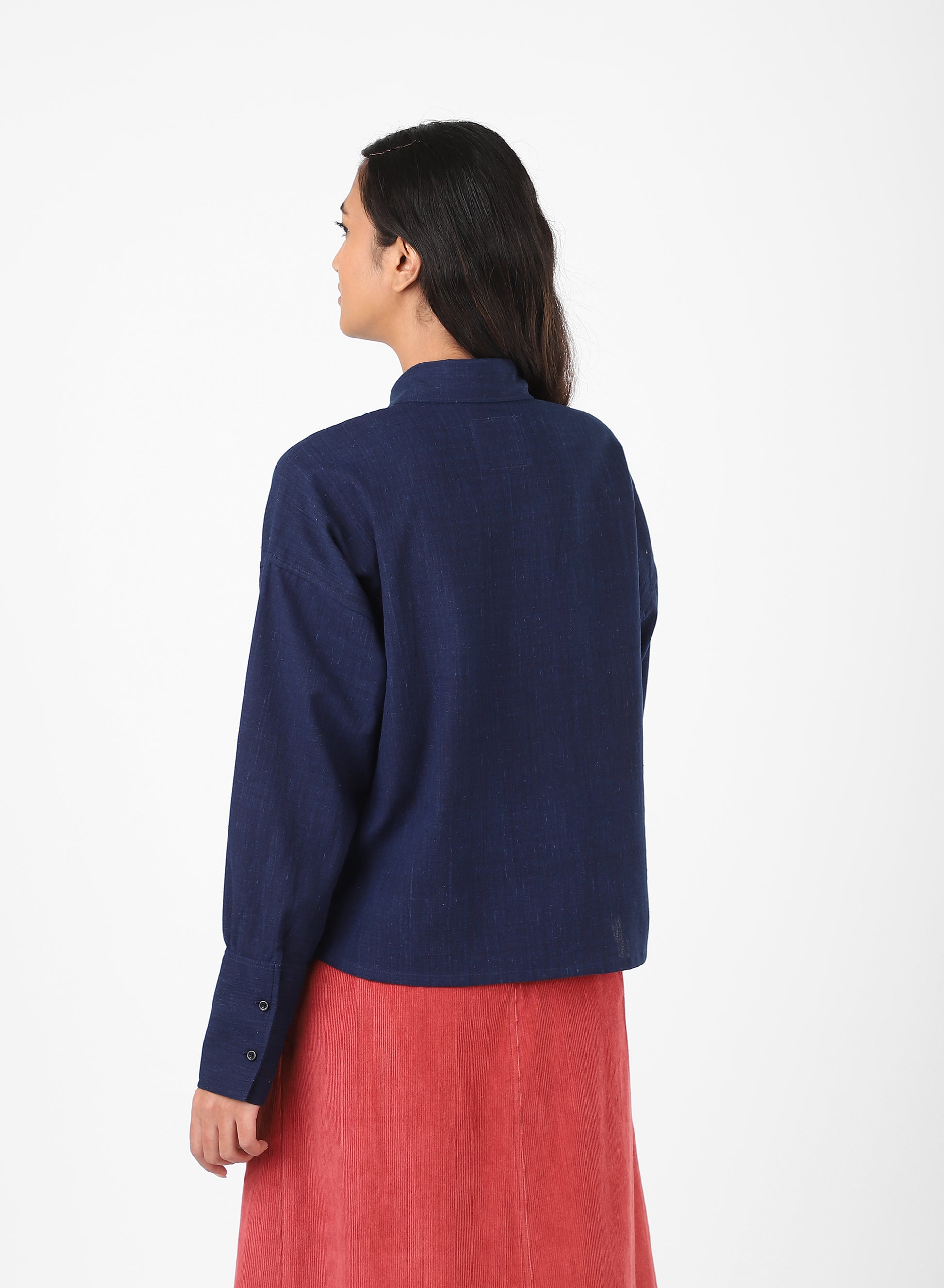 LEAH is a boxy shirt cut with a round-tip collar and long cuffs. The shape holds width through the body, allowing the fabric to fall straight when worn. Its cuffs extend the line of the sleeve, giving quiet emphasis to the wrist.