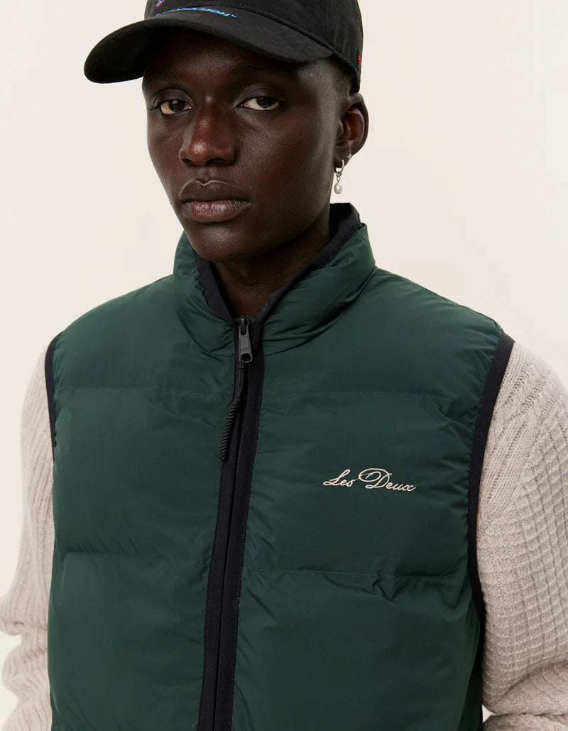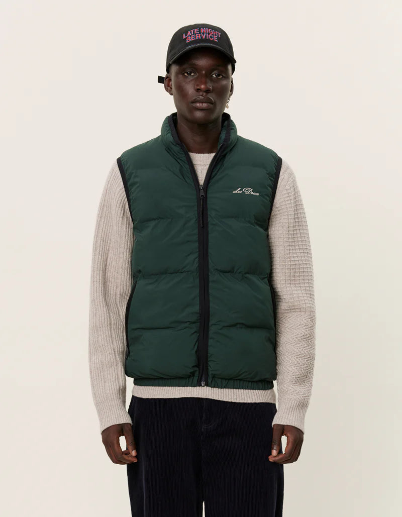 Lightweight, water repellent, padded vest with elastic edge tape in contrast color and zipper at front and pockets