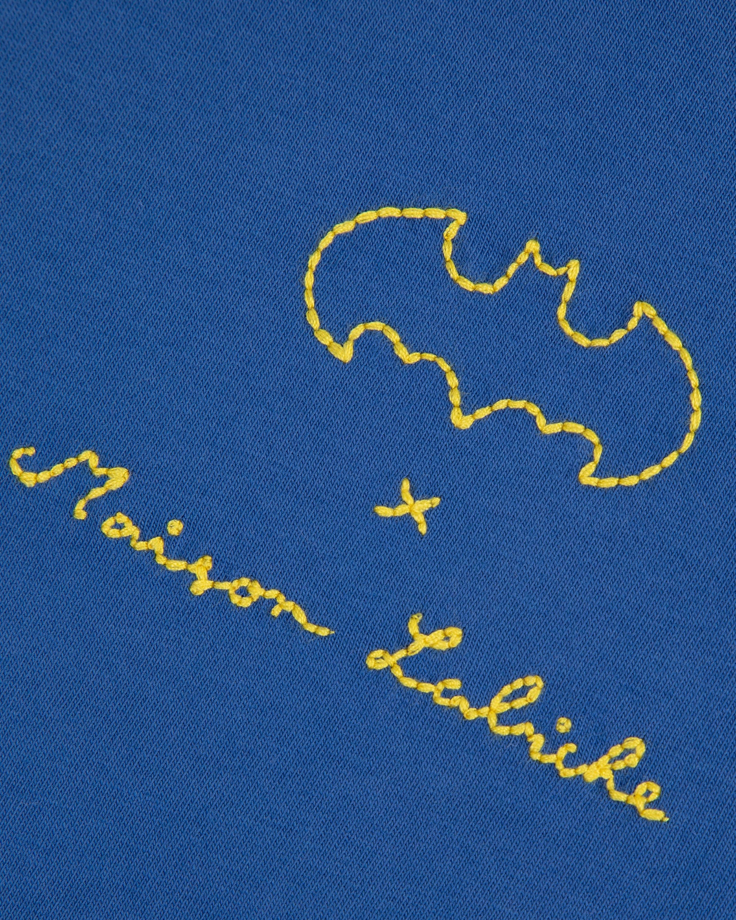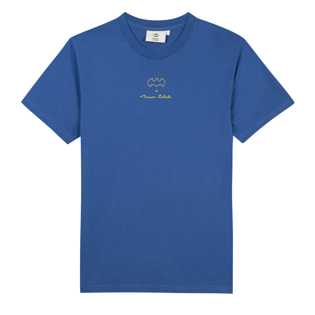 The 'Popincourt' t-shirt by Maison Labiche, made with GOTS certified cotton, features a 'Batman X MLB' design.