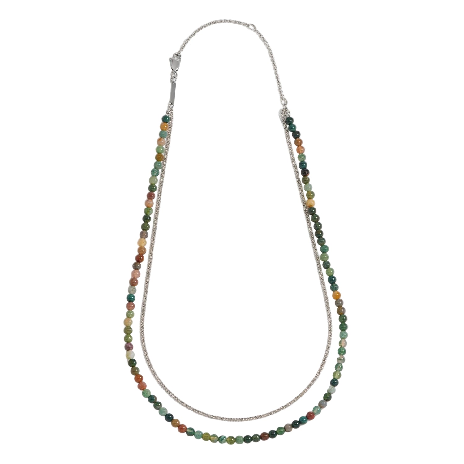 Stacking done for you! Our Mixed Green Agate Double Necklace features beautiful green agate beads paired with a delicate silver-plated chain, offering the illusion of wearing two necklaces at the same time.