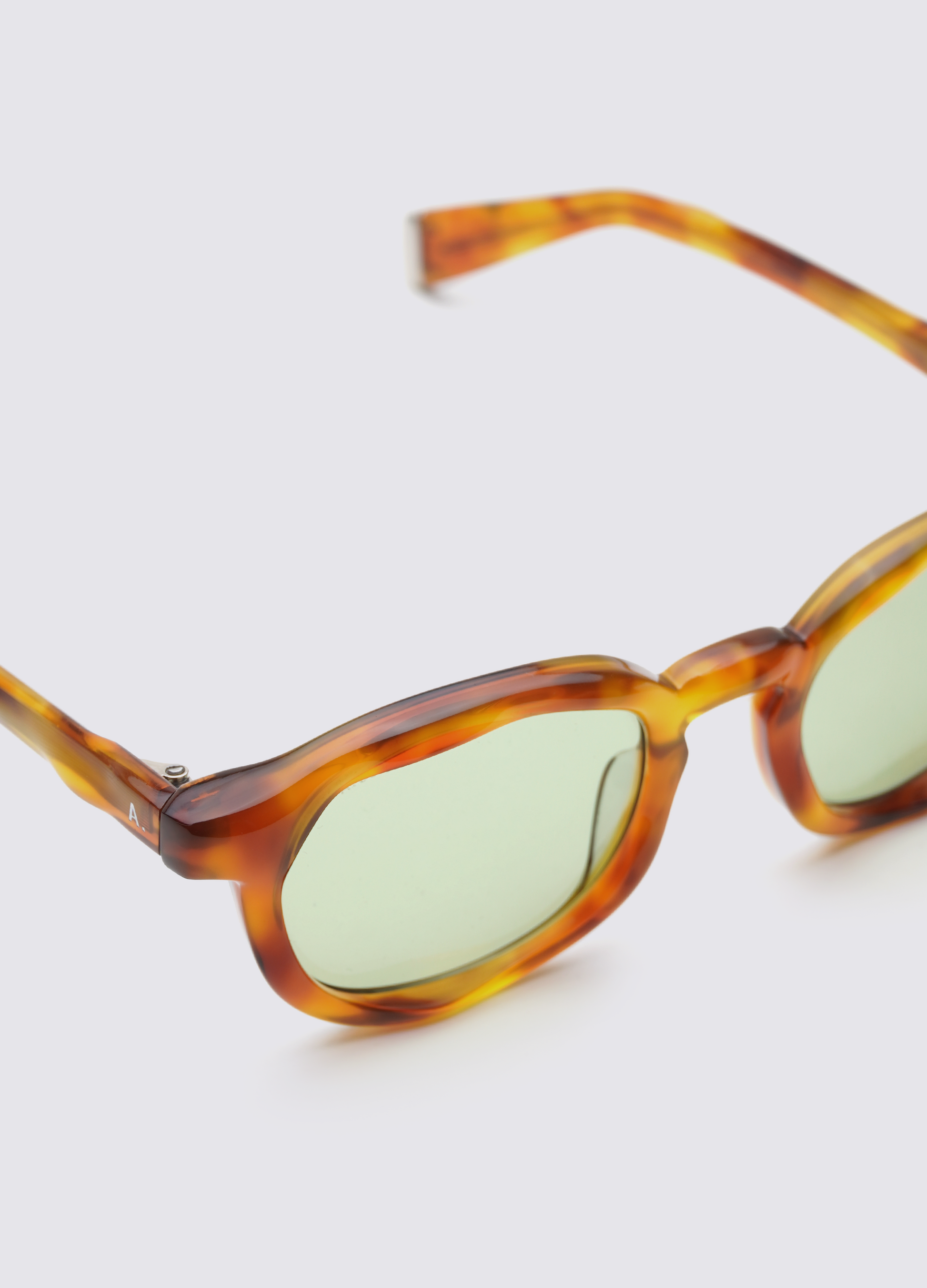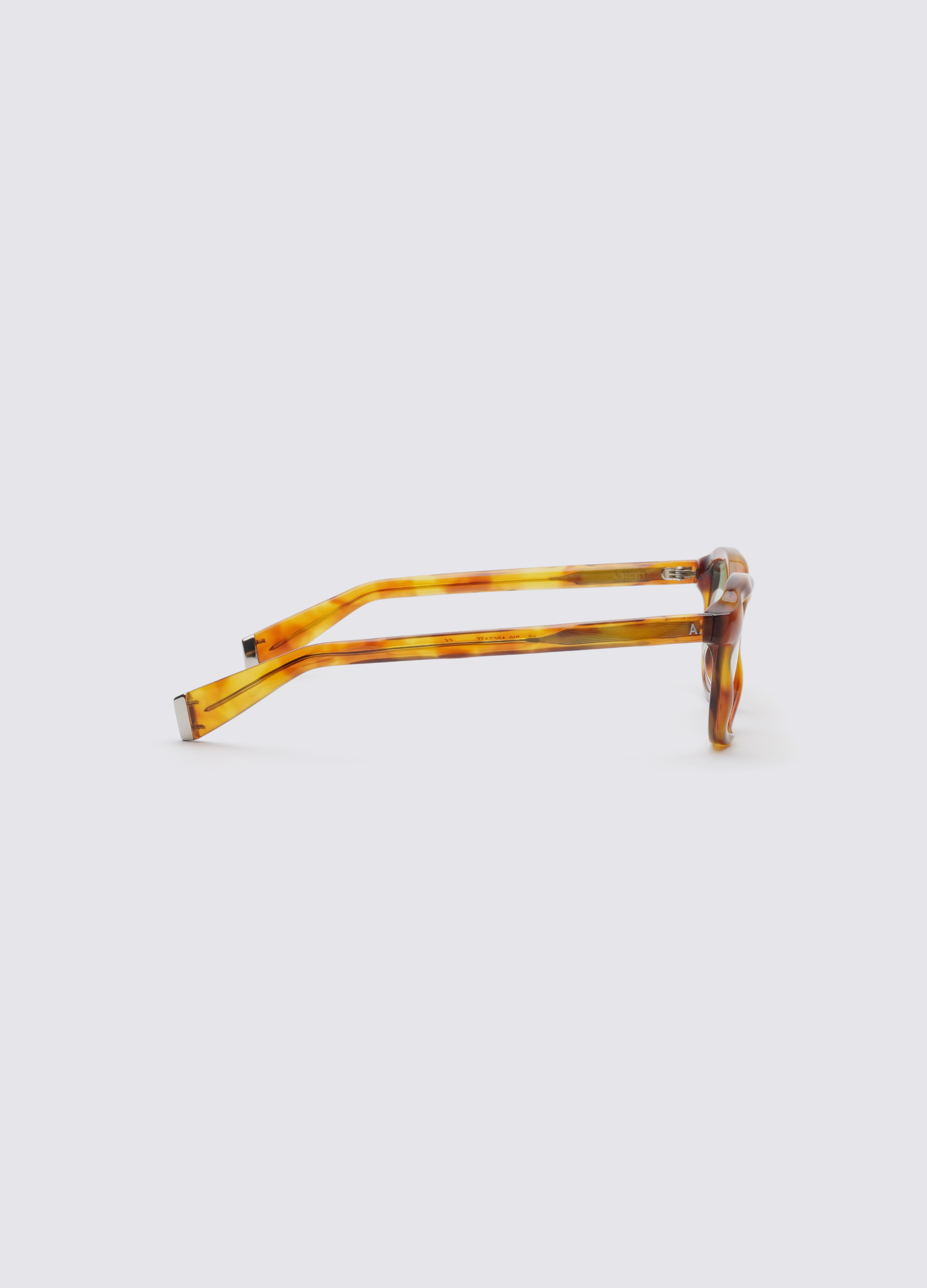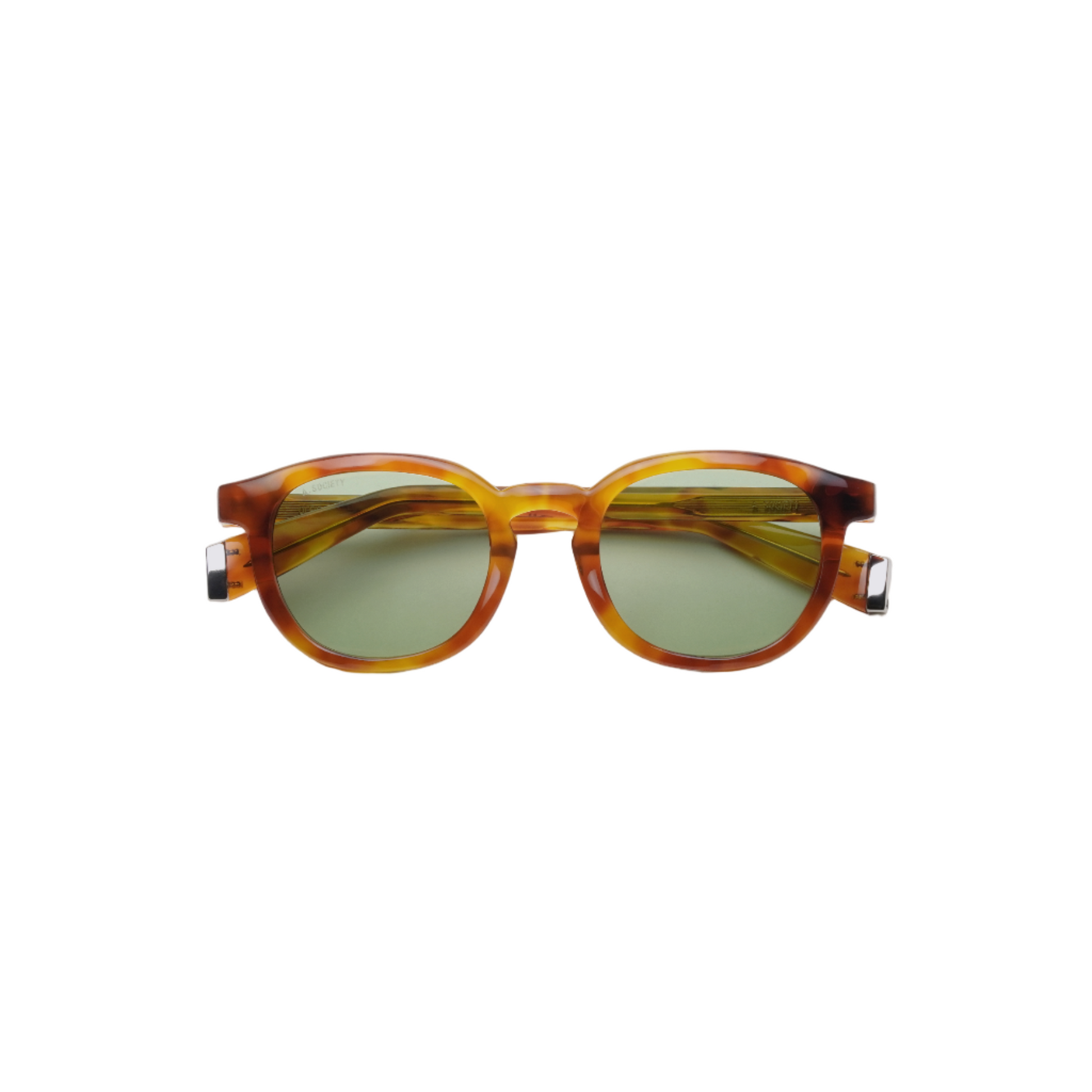 A classic D-frame shape made with BIO-ACETATE available in Black matched with Grey lenses, Brown with Brown Lenses, and Yellow Havana matched with Amber lenses. 100% UV protection.