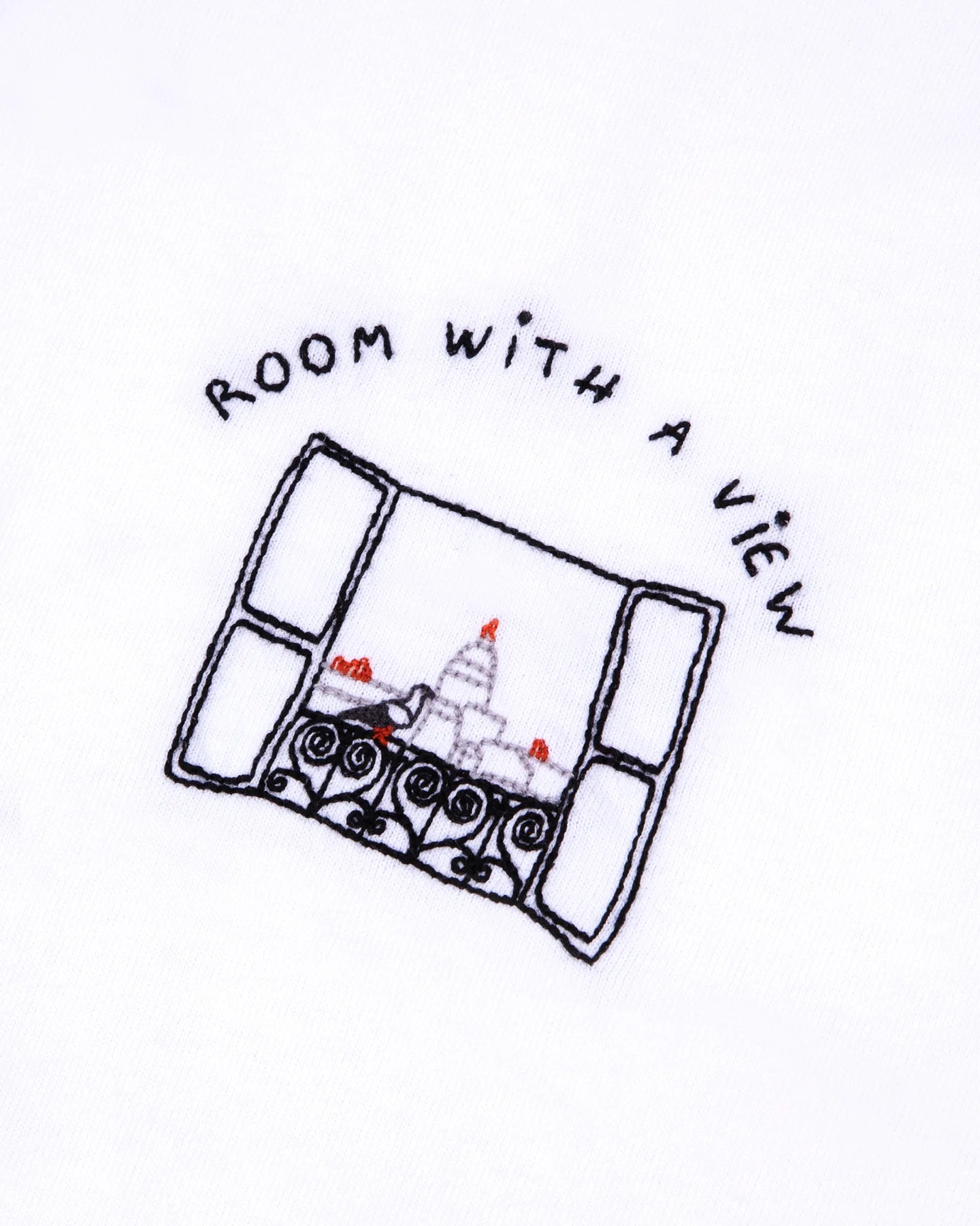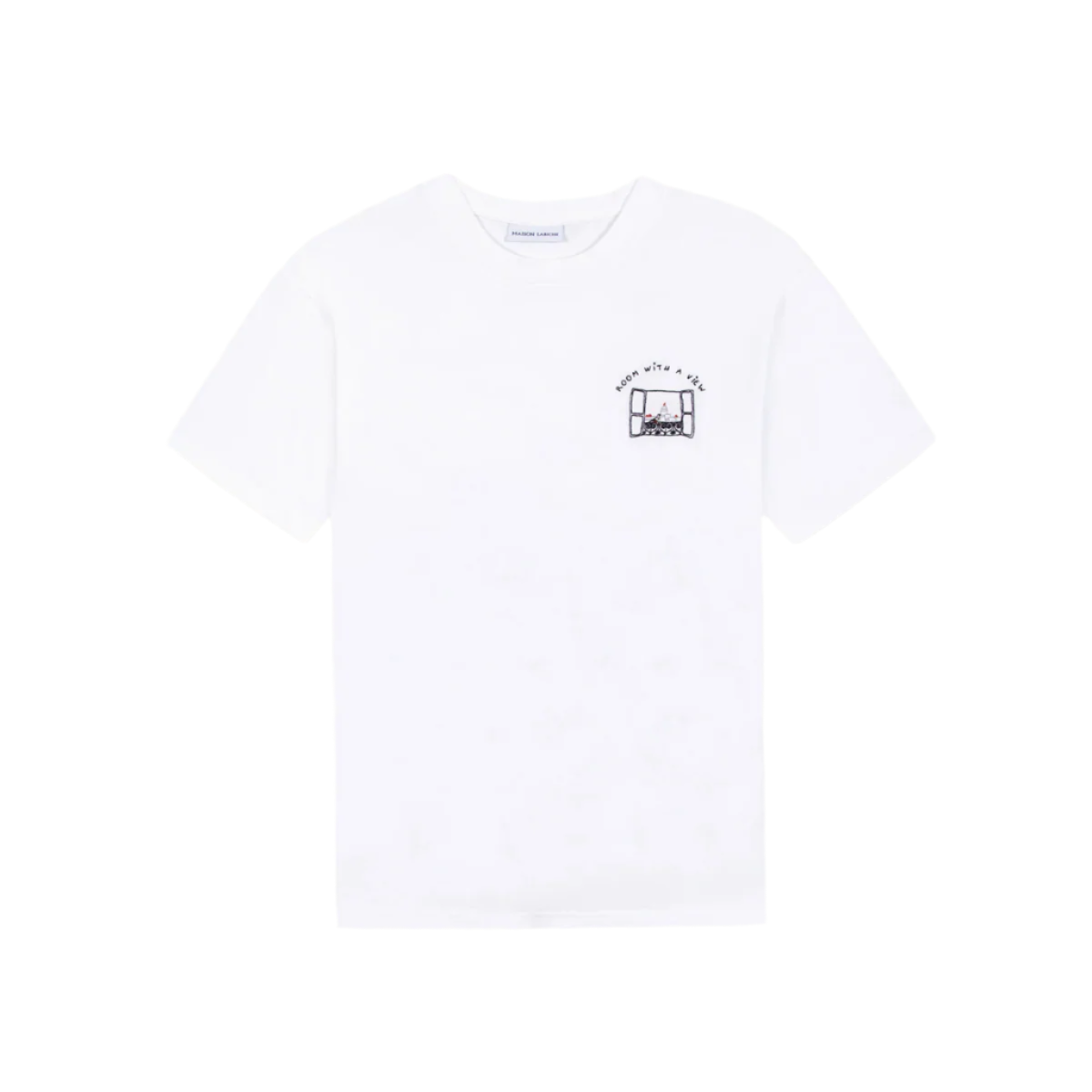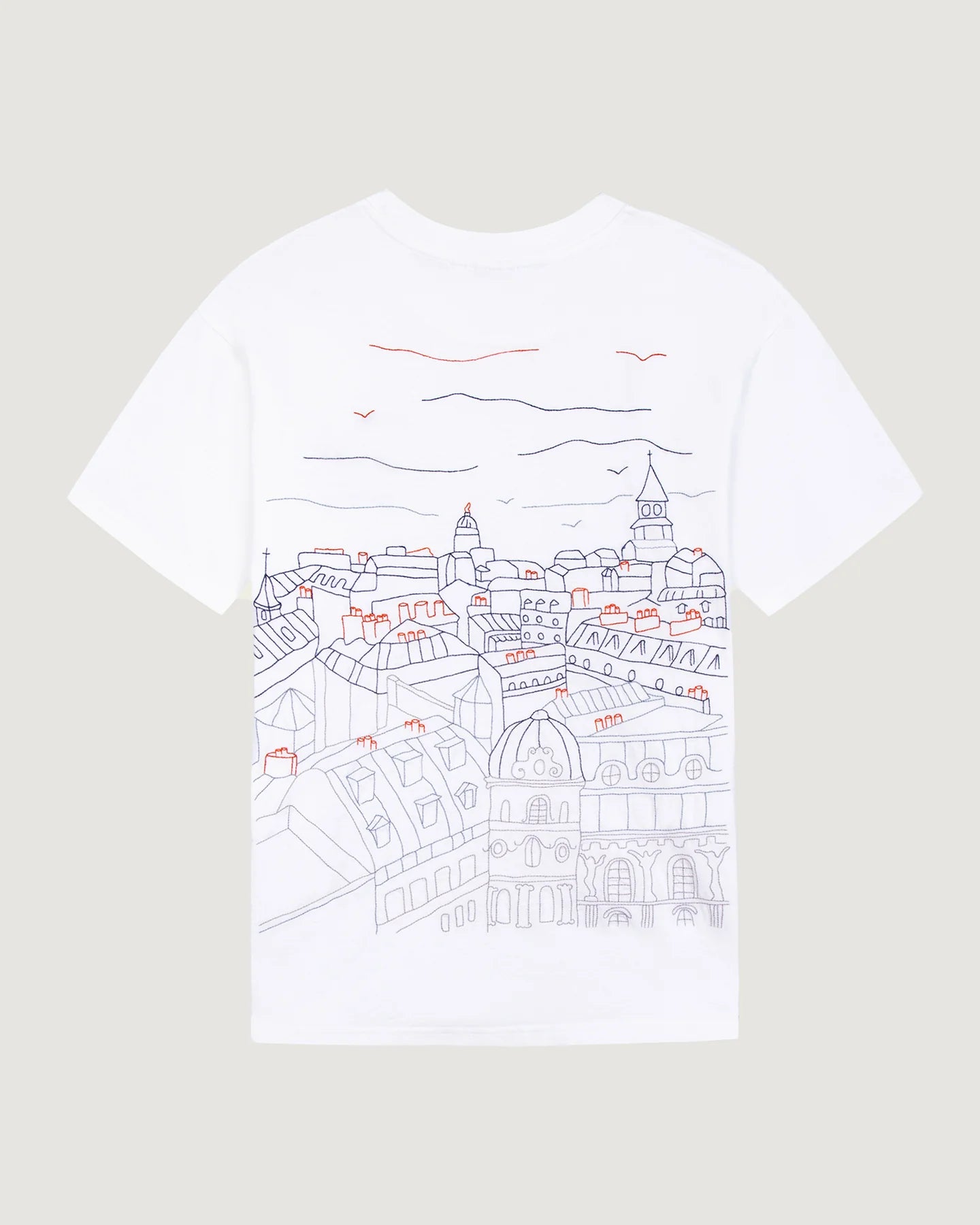 Our must-have Patureau T-shirt has a loose fit, a ribbed neckline, double needle finishes at the bottom of the sleeves and body. Its embroidery is a window with a view of the rooftops of Paris